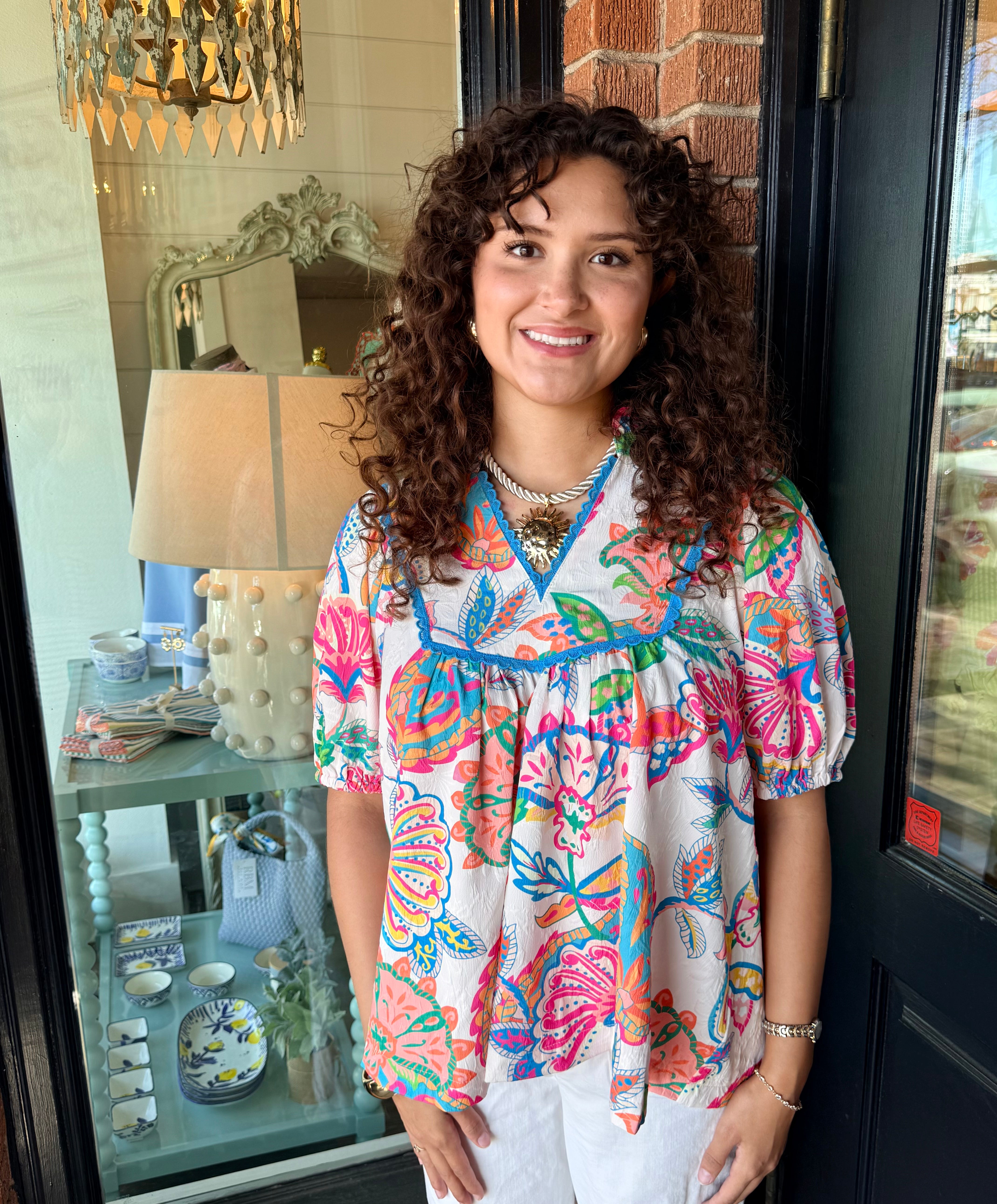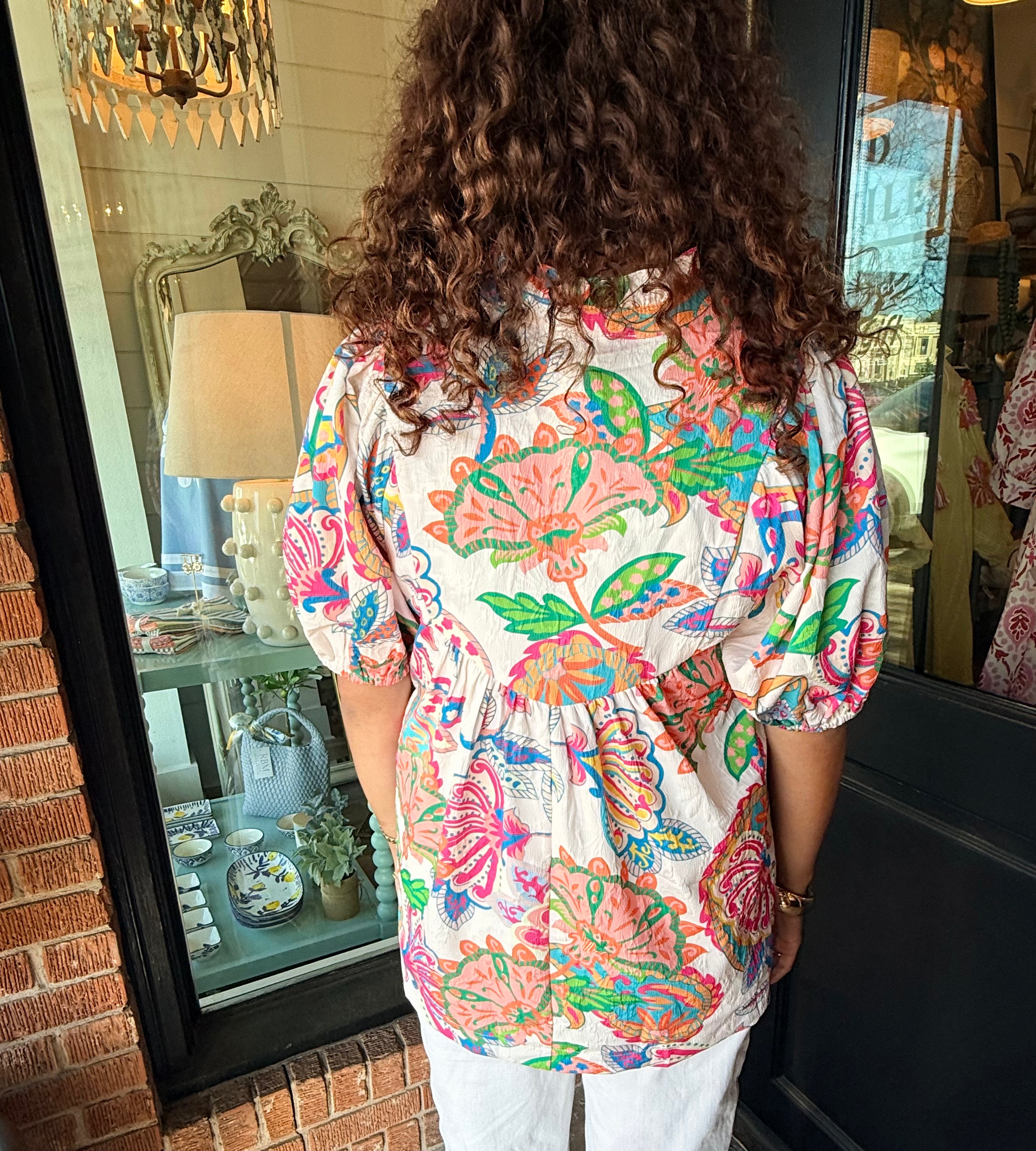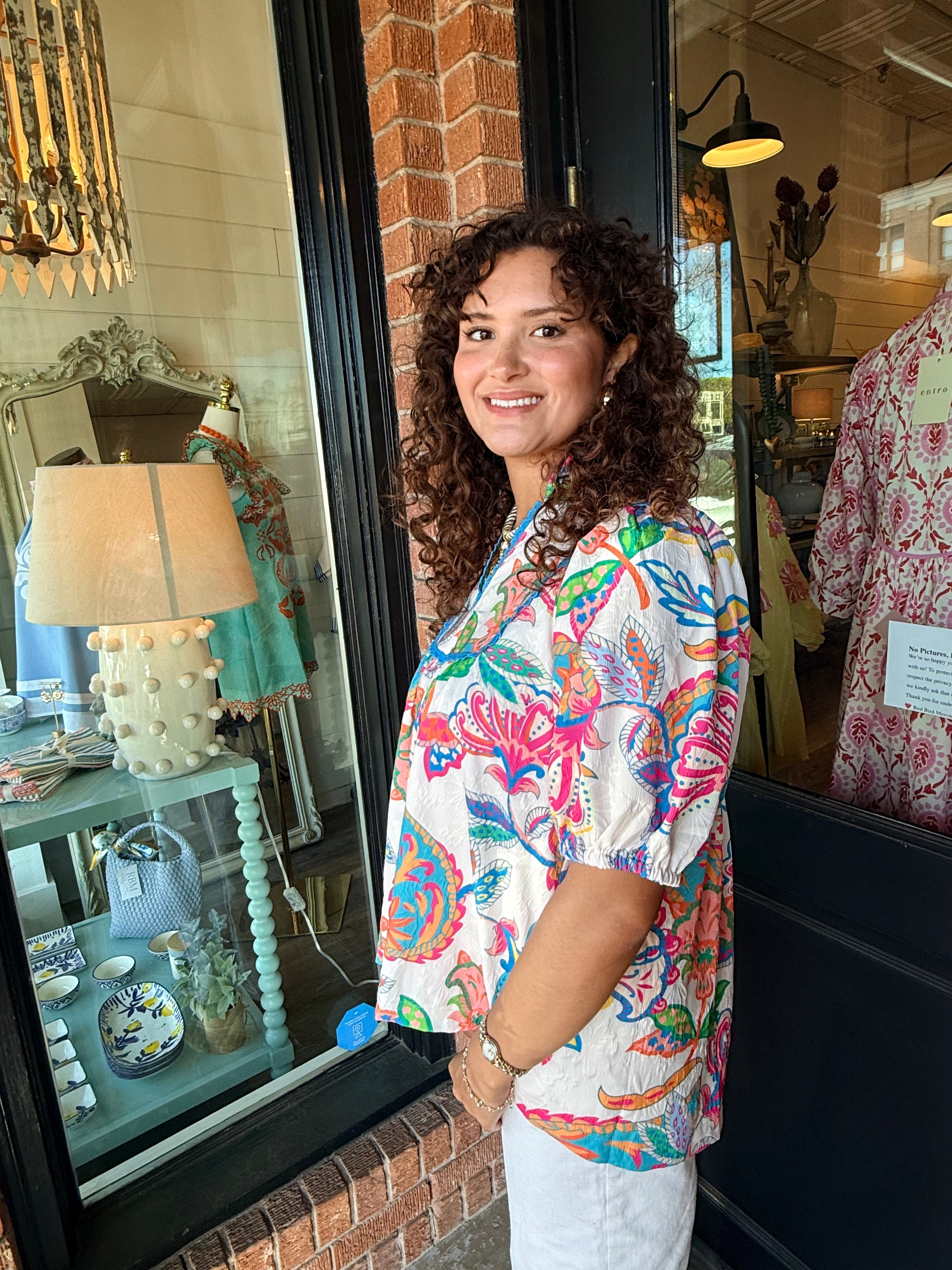 A bold, eye-catching top with a beautiful bohemian feel. The Carmen Paisley Top features a vibrant multicolor paisley print, a relaxed babydoll silhouette, and soft puff sleeves for an effortless, statement look. Finished with lace trim and a flattering V-neckline, it’s perfect for dressing up or keeping casual.