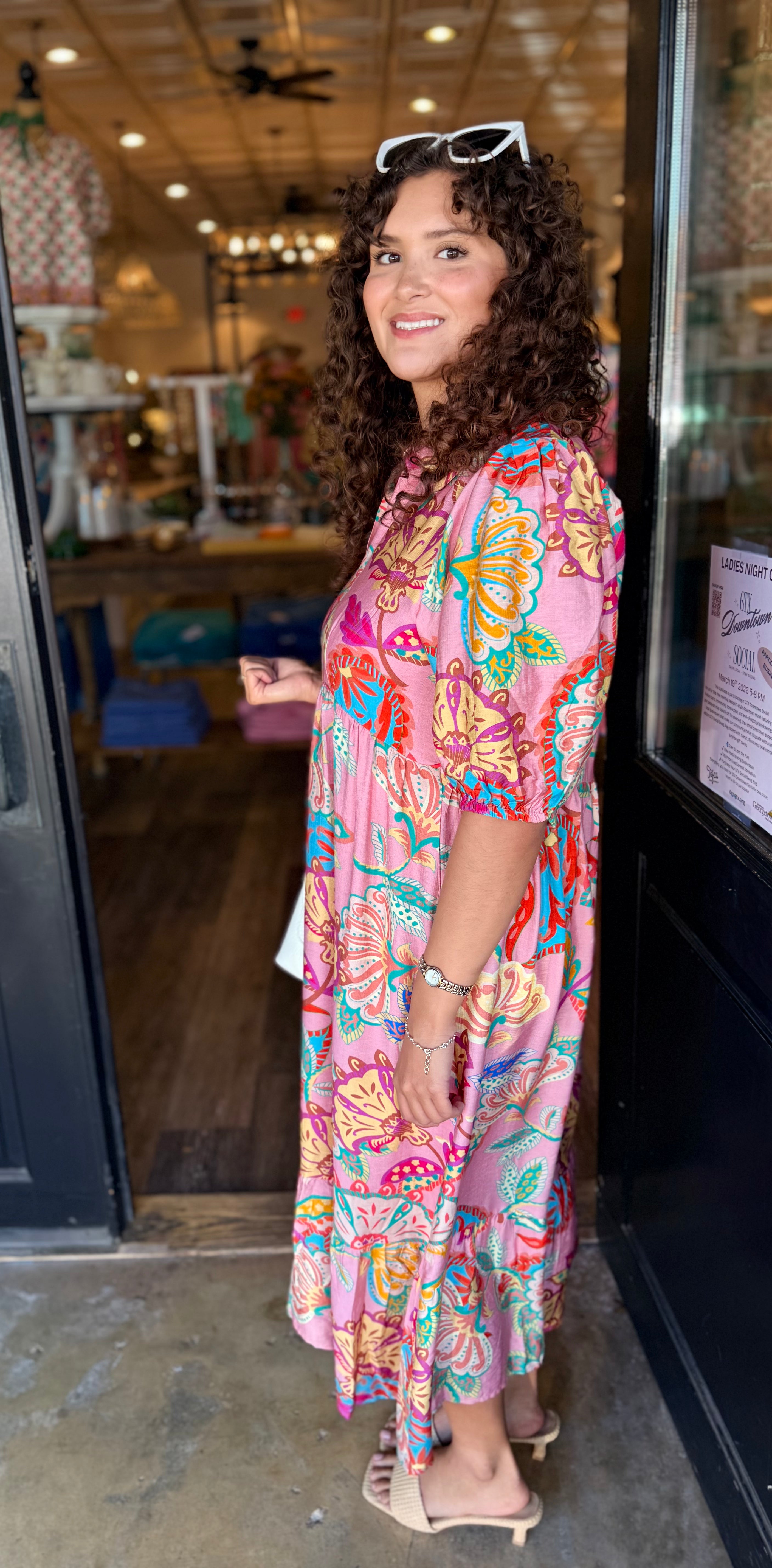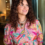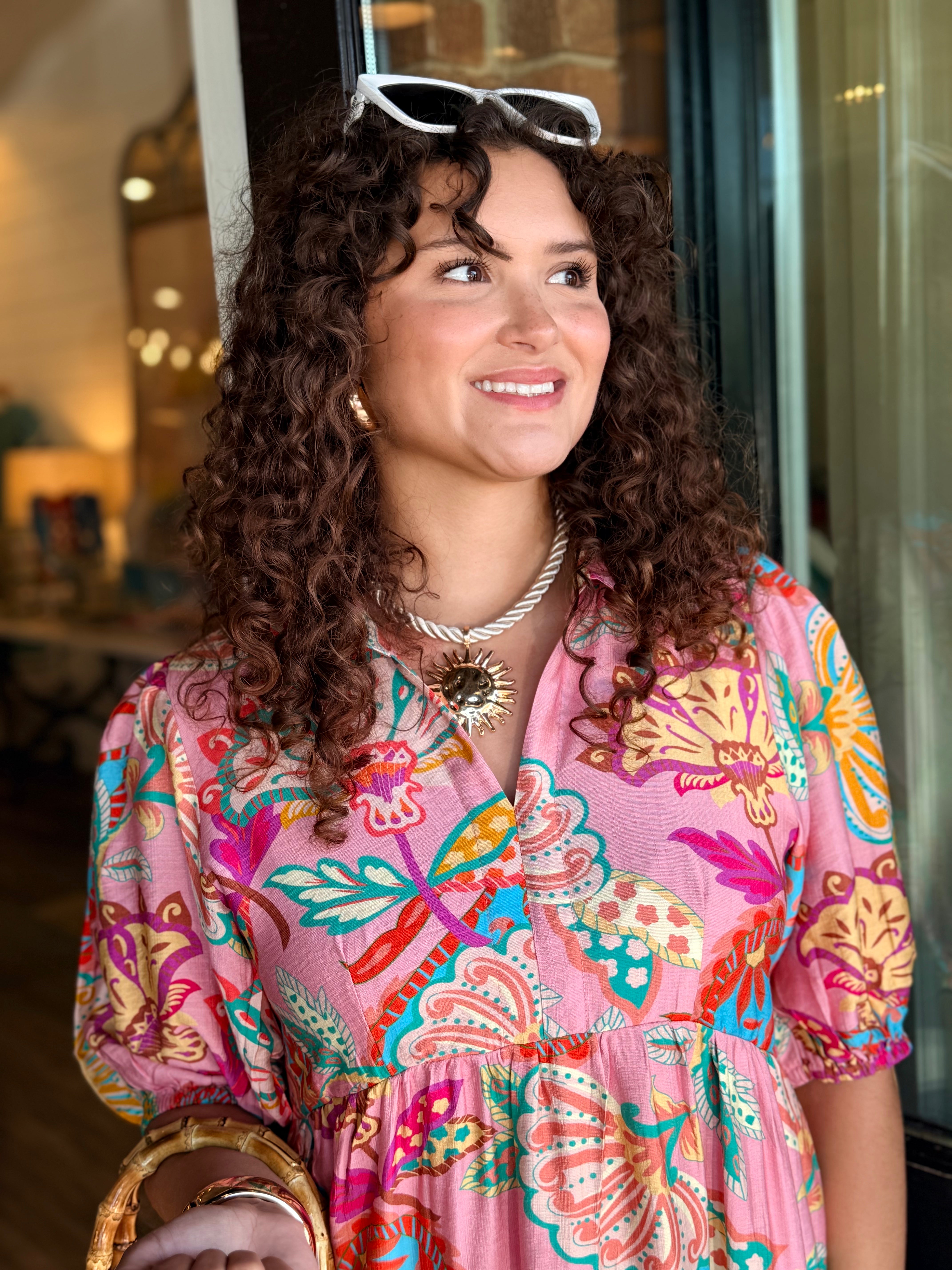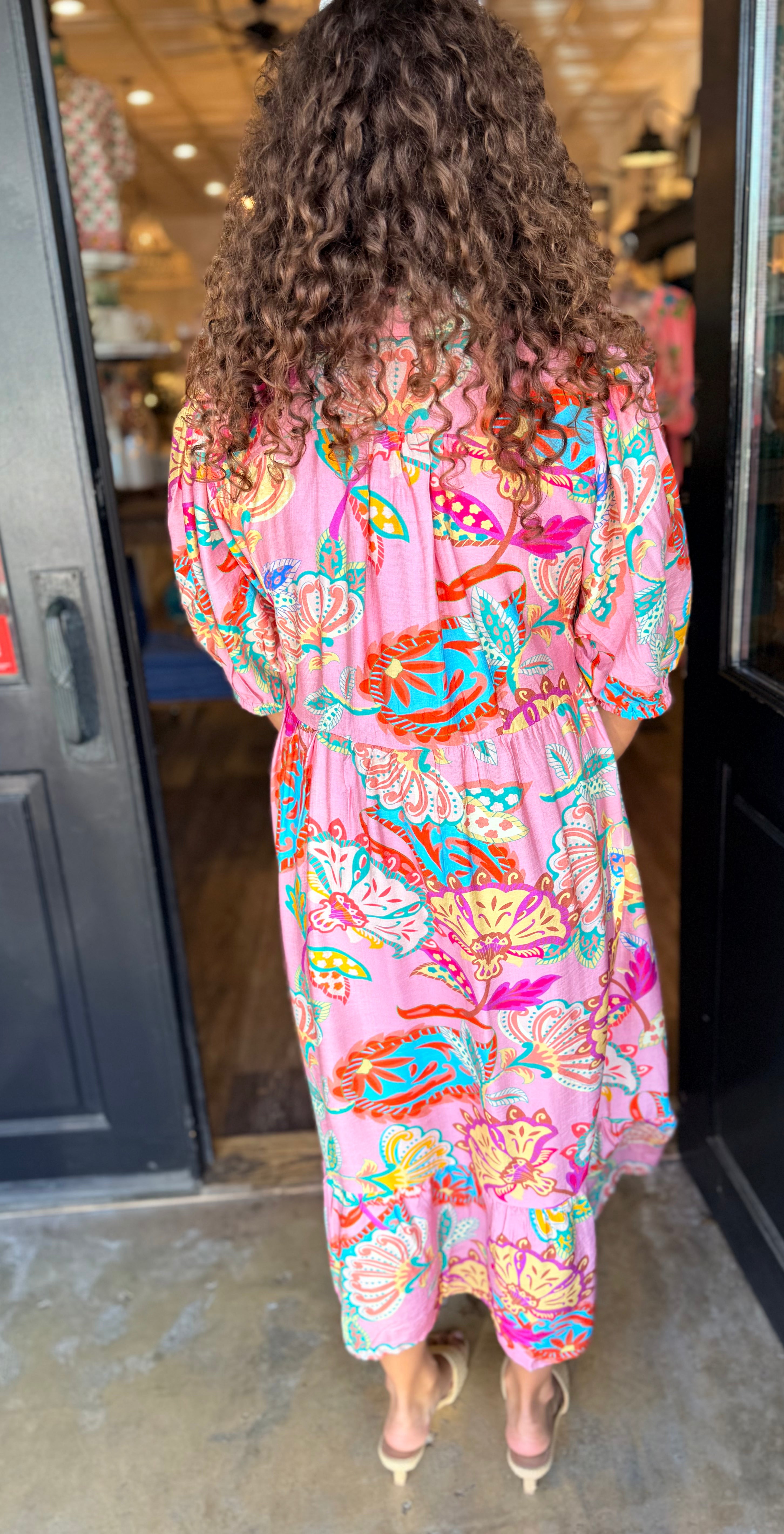 A bold, beautiful maxi with effortless movement. The Raven Paisley Maxi Dress features a striking paisley floral print, a flattering split V-neckline with collar detail, and a flowy tiered silhouette. Finished with soft 3/4 sleeves and a lined skirt, it’s perfect for everyday wear or special plans.