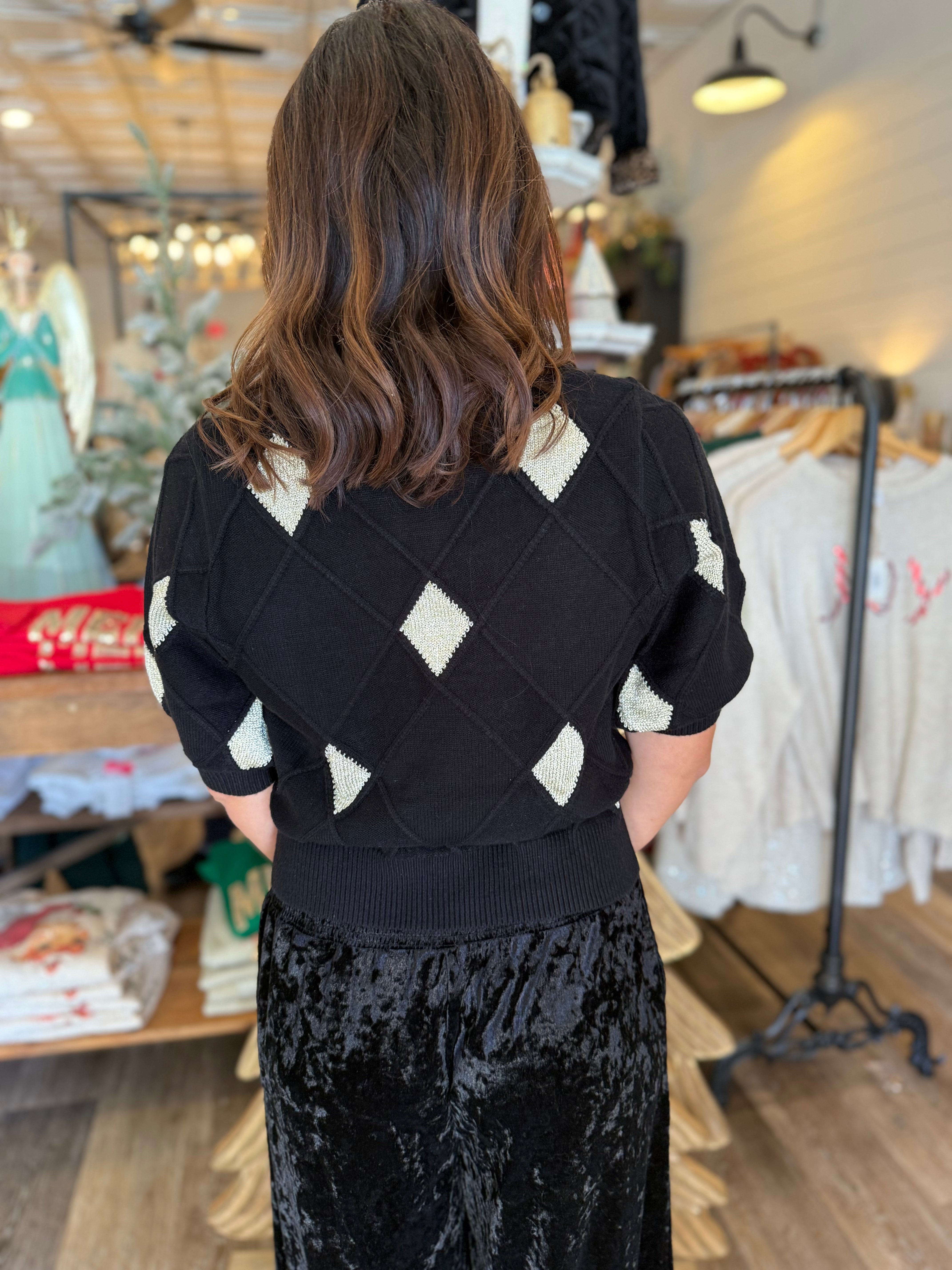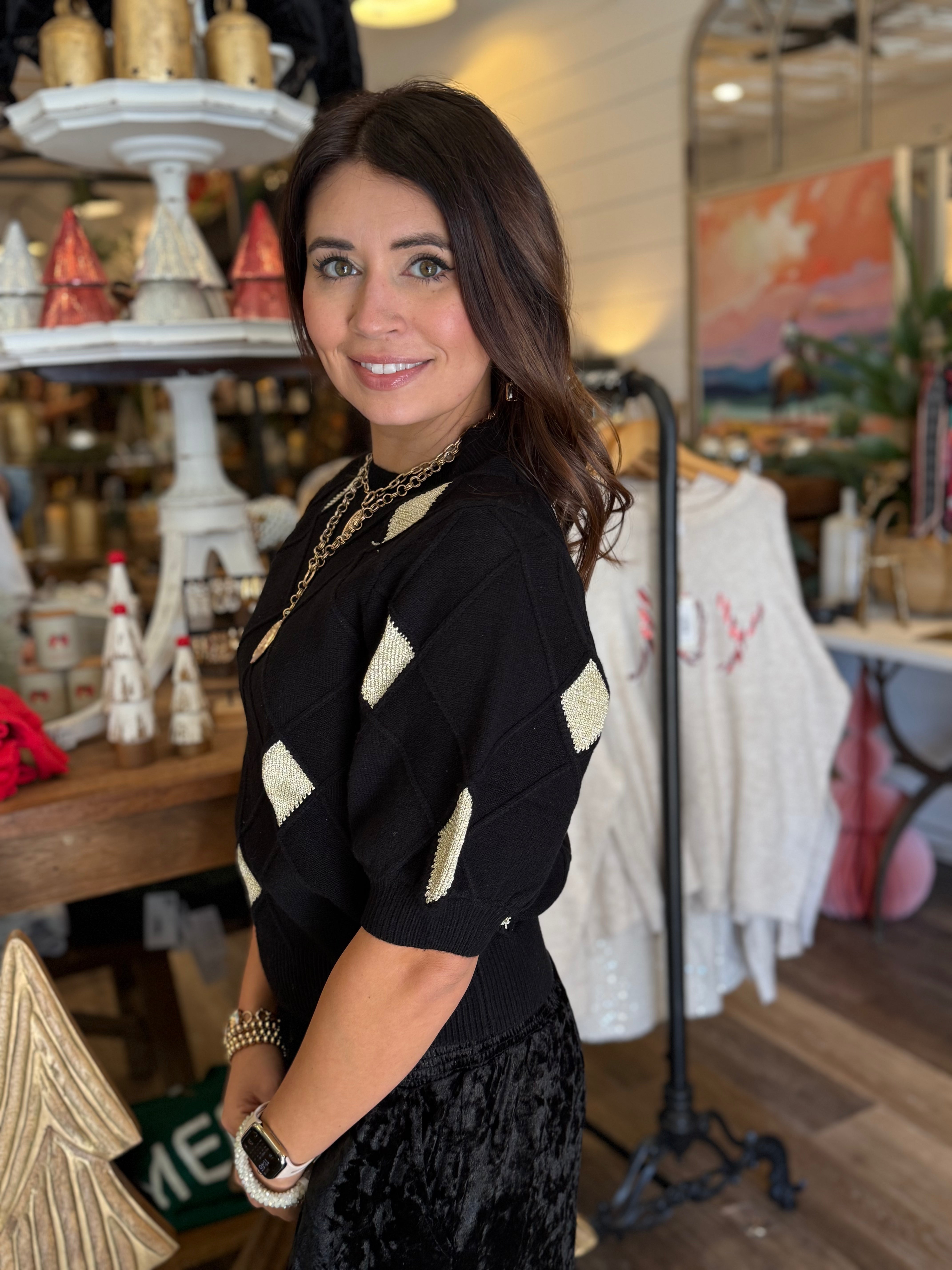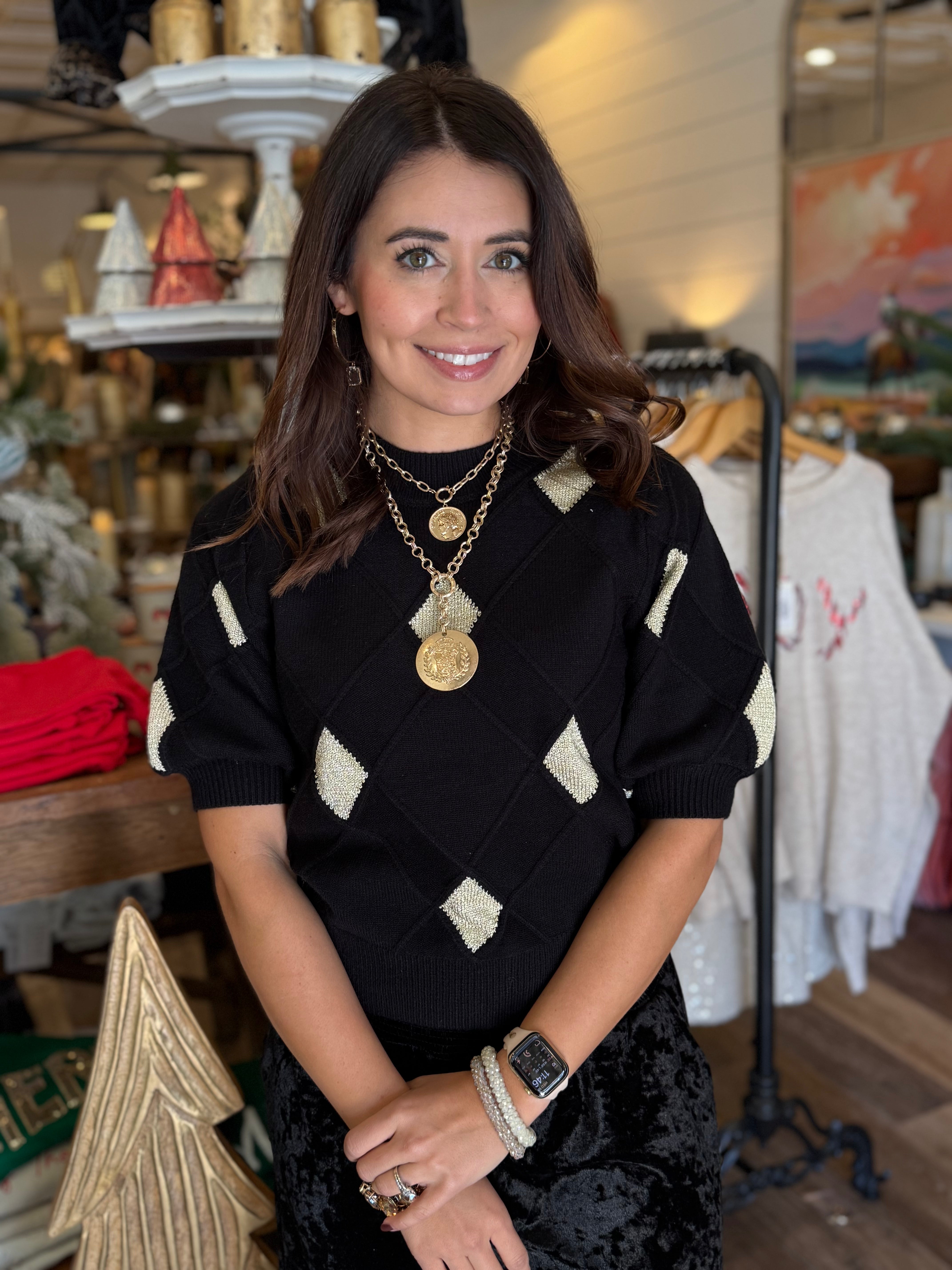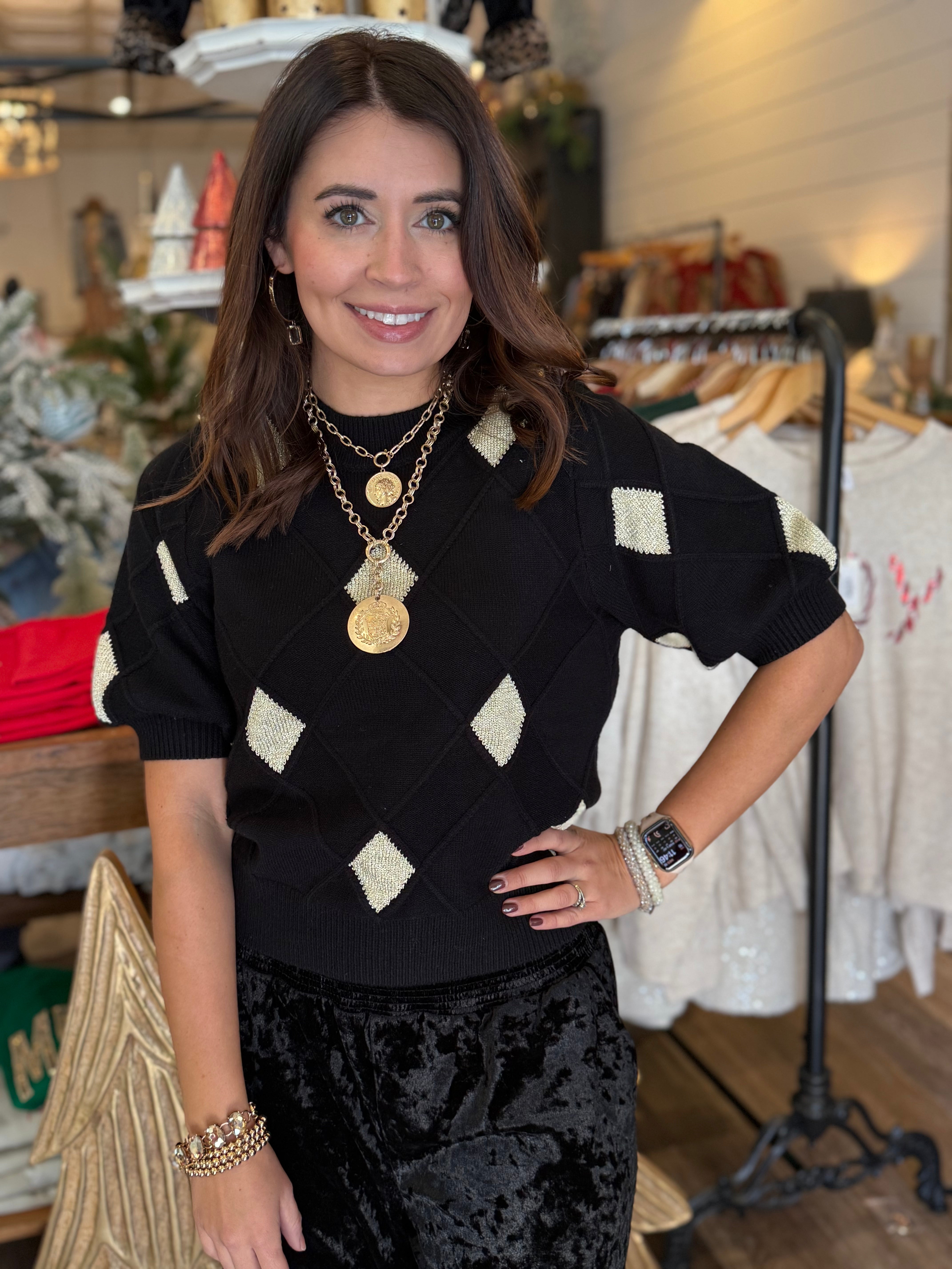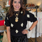 Classic meets modern in the Aleyda Argyle Knit Top — a timeless piece with a fresh, feminine twist. Featuring a soft knit texture and short sleeves, it’s the perfect choice for transitional seasons or layering under your favorite jacket.
