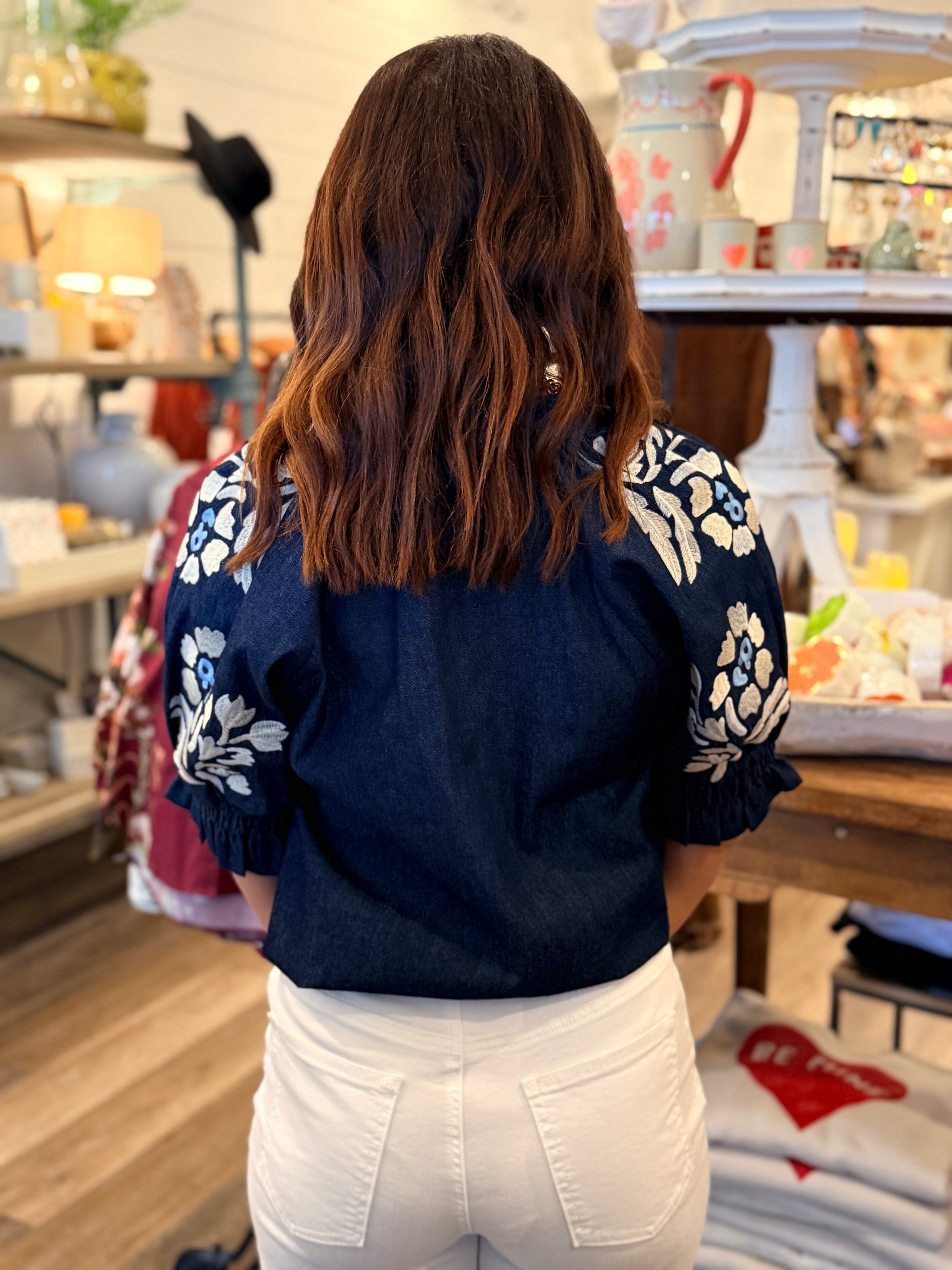 Amelia Floral Embroidered Denim Top