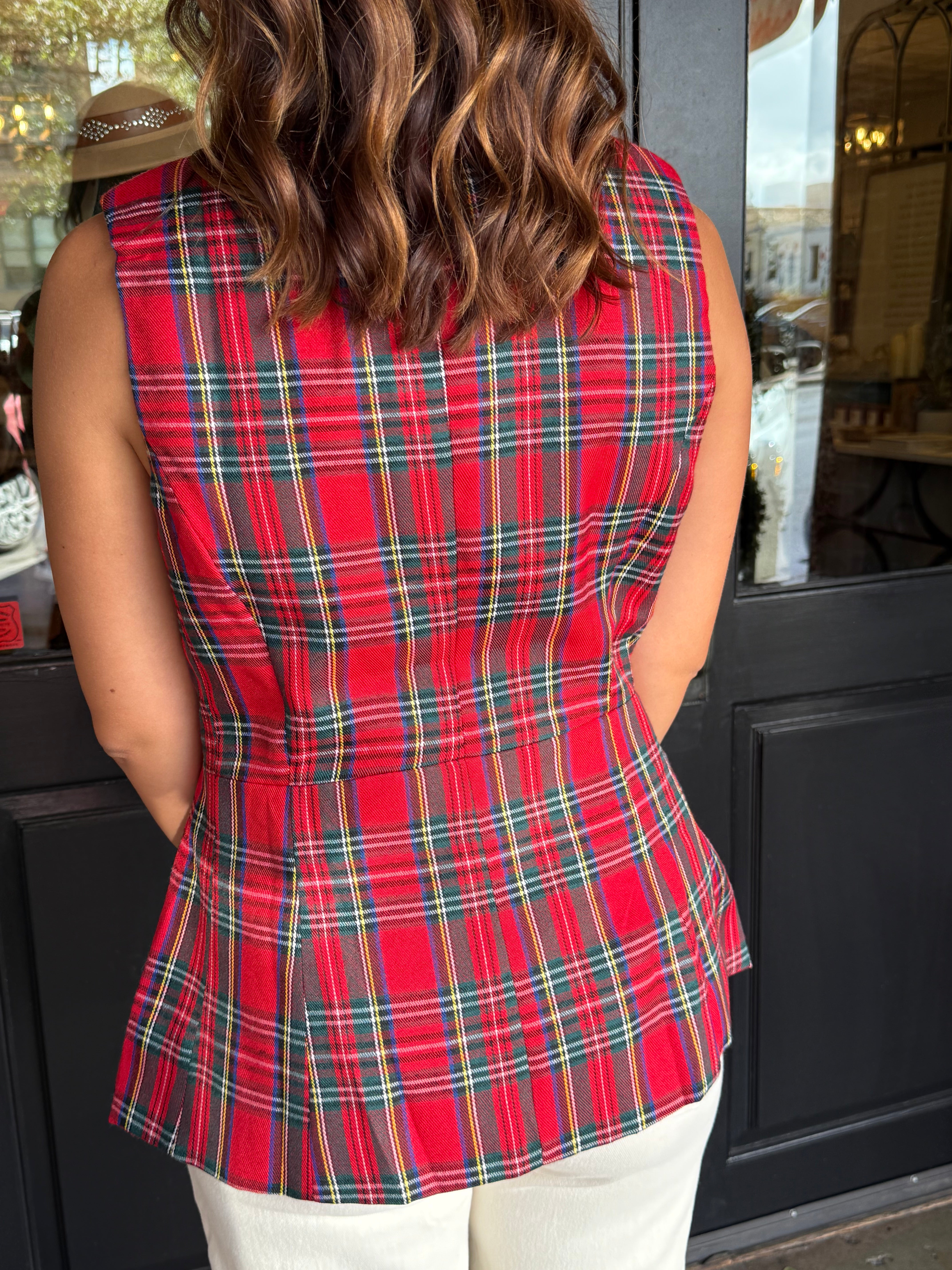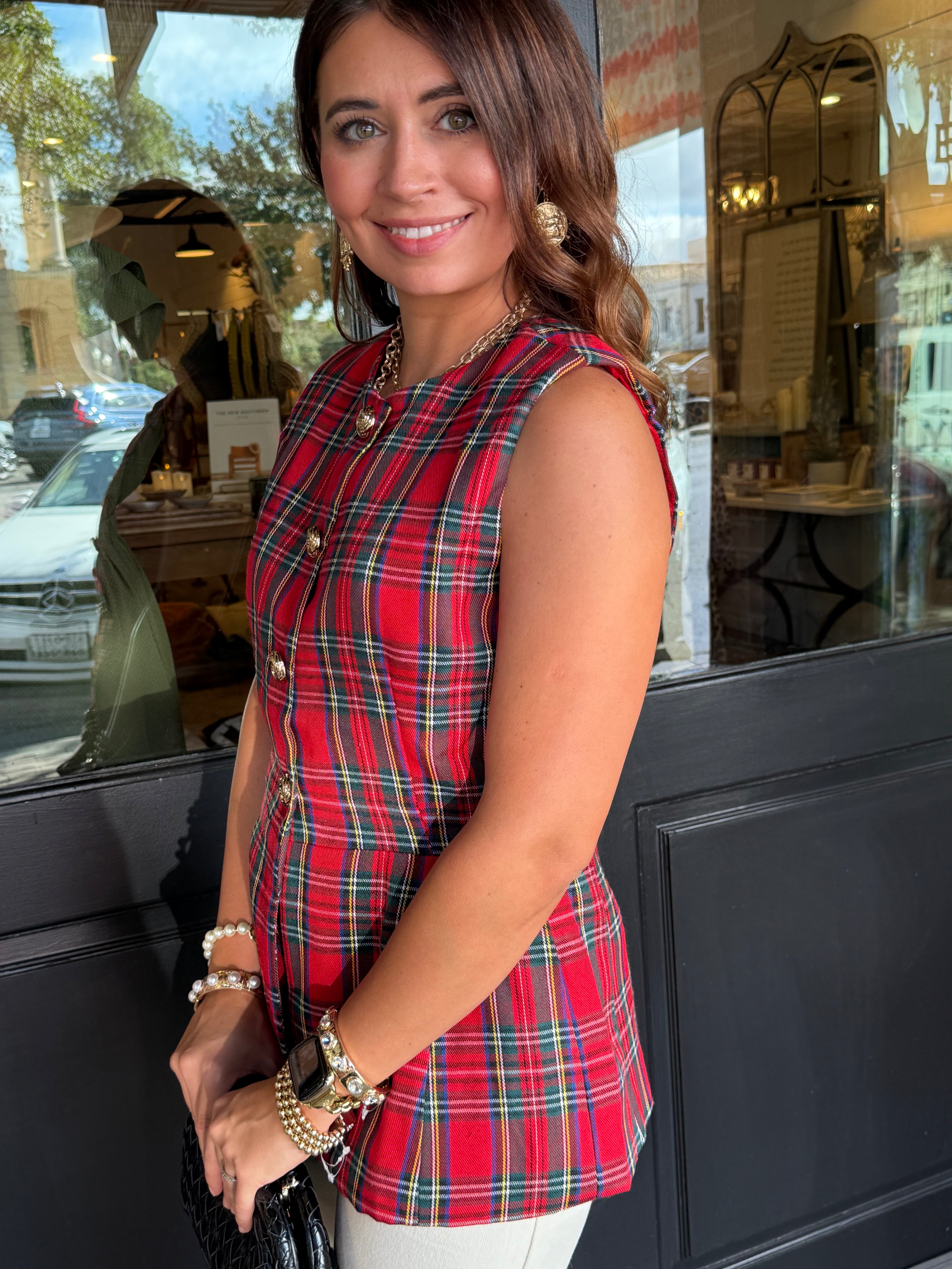 Add a touch of timeless charm to your wardrobe with the Andie Plaid Vest. Crafted from 100% polyester for easy care, this vest features a classic plaid pattern and beautifully detailed gold buttons for a polished finish. Layer it over blouses, turtlenecks, or dresses to elevate your outfit with a chic, tailored look.