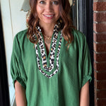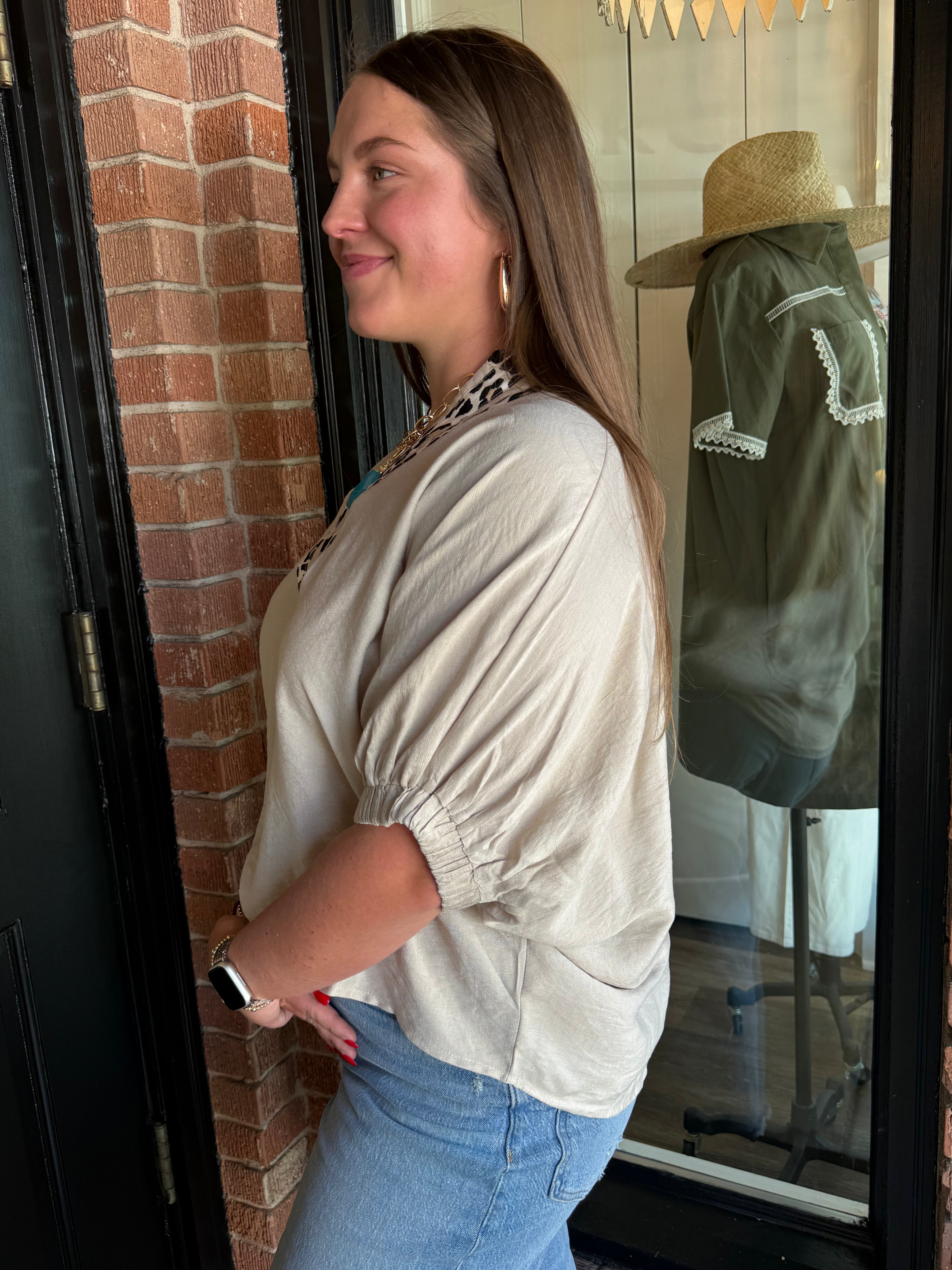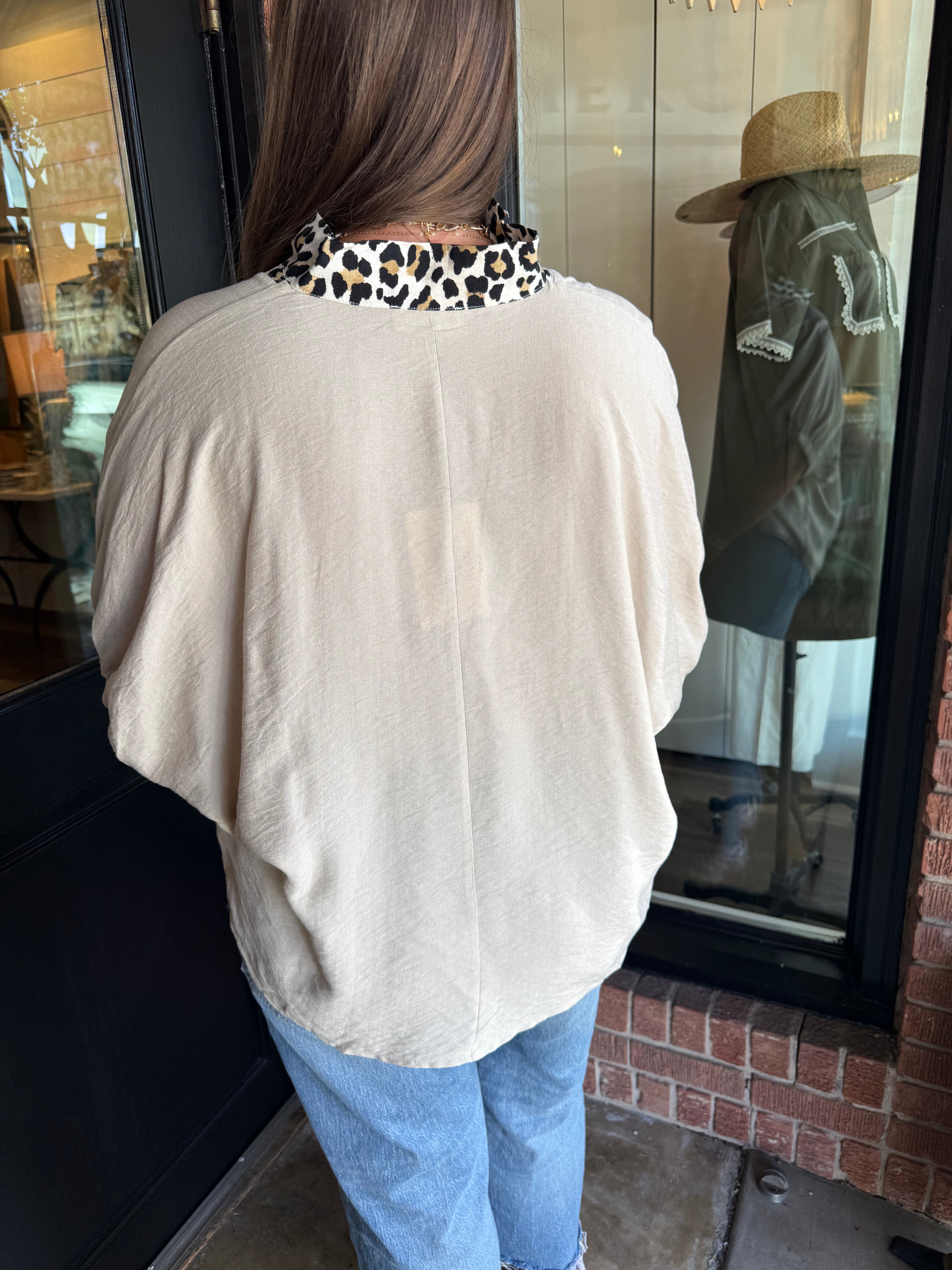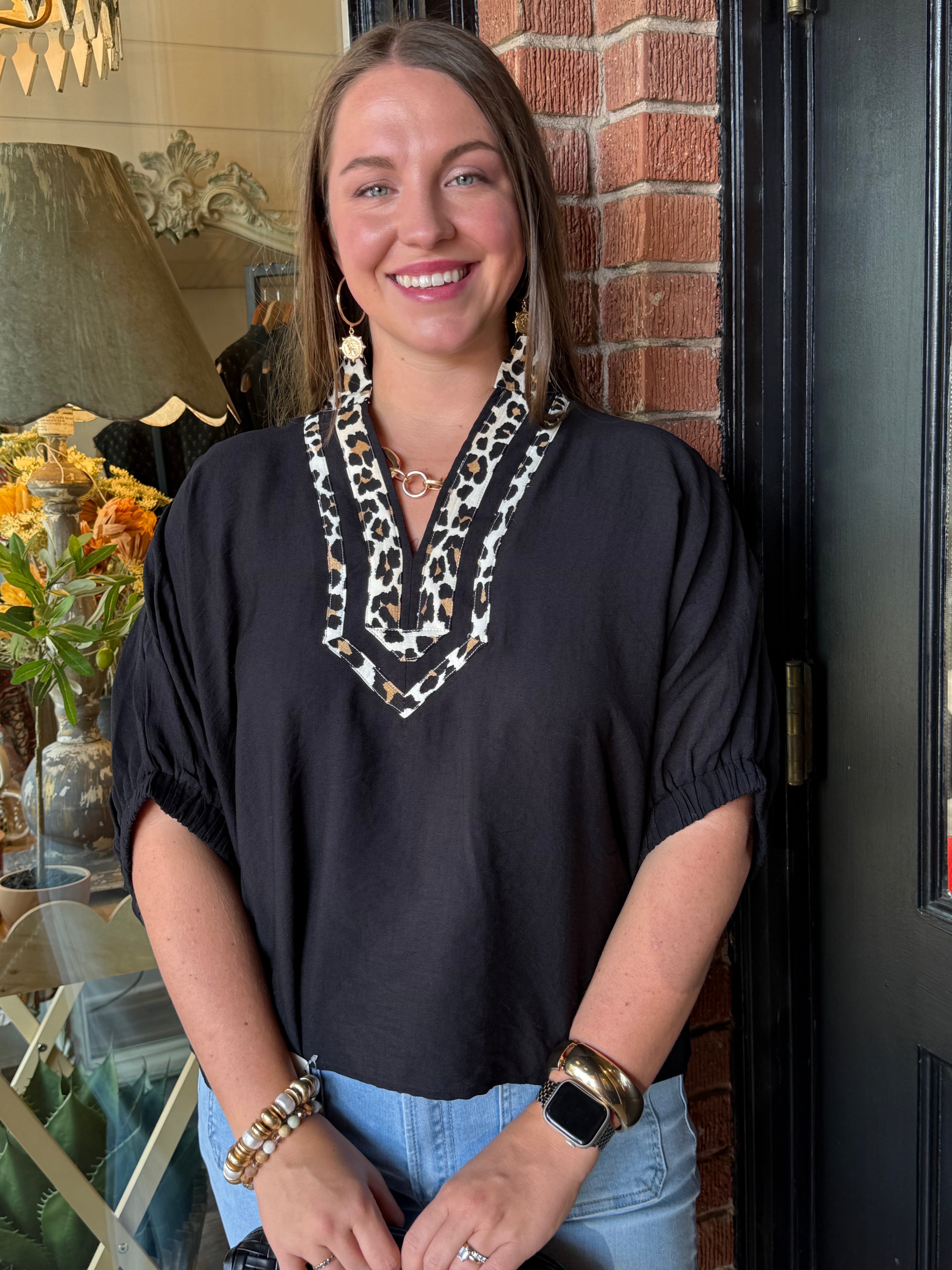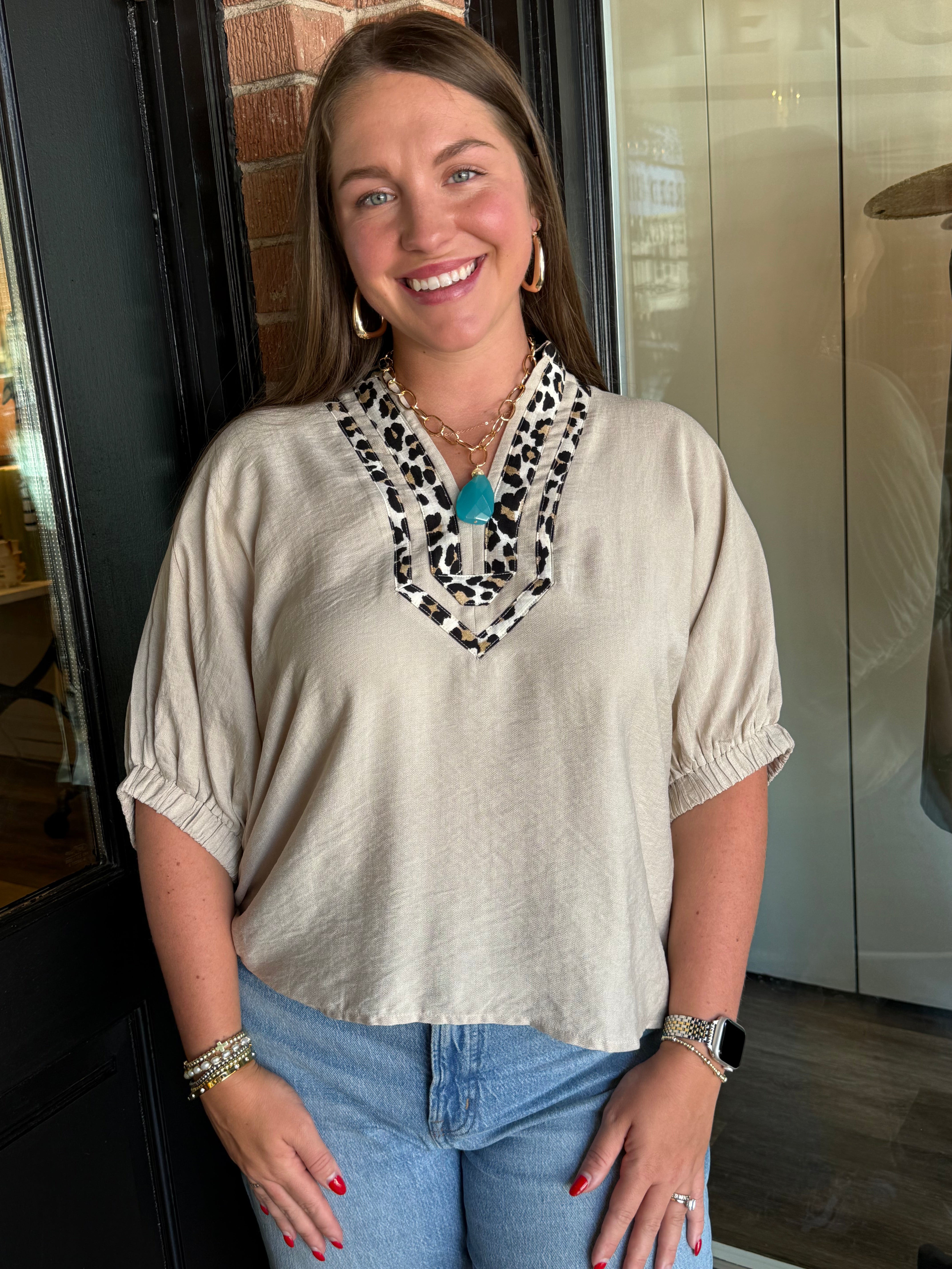 Elevate your everyday look with the Becca Leopard Trim Top! This chic, neutral piece features a soft ivory base with bold leopard print trim along the neckline for just the right touch of edge. The relaxed fit and lightweight fabric make it perfect for year-round wear—tuck it into your favorite jeans or dress it up with a skirt and boots for an easy, stylish outfit.