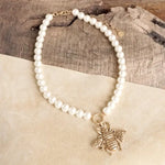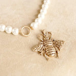 * 16" pearlized chunky beads with extender * 1.75" removable bee pendant in worn gold * Openable pendant jump ring for versatile styling * Boho-inspired design * Lobster claw clasp Why You'll Love It: This necklace blends timeless elegance with boho charm, making it perfect for both casual and dressed-up looks. The removable bee pendant adds a playful, customizable touc
