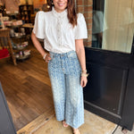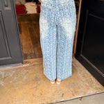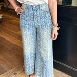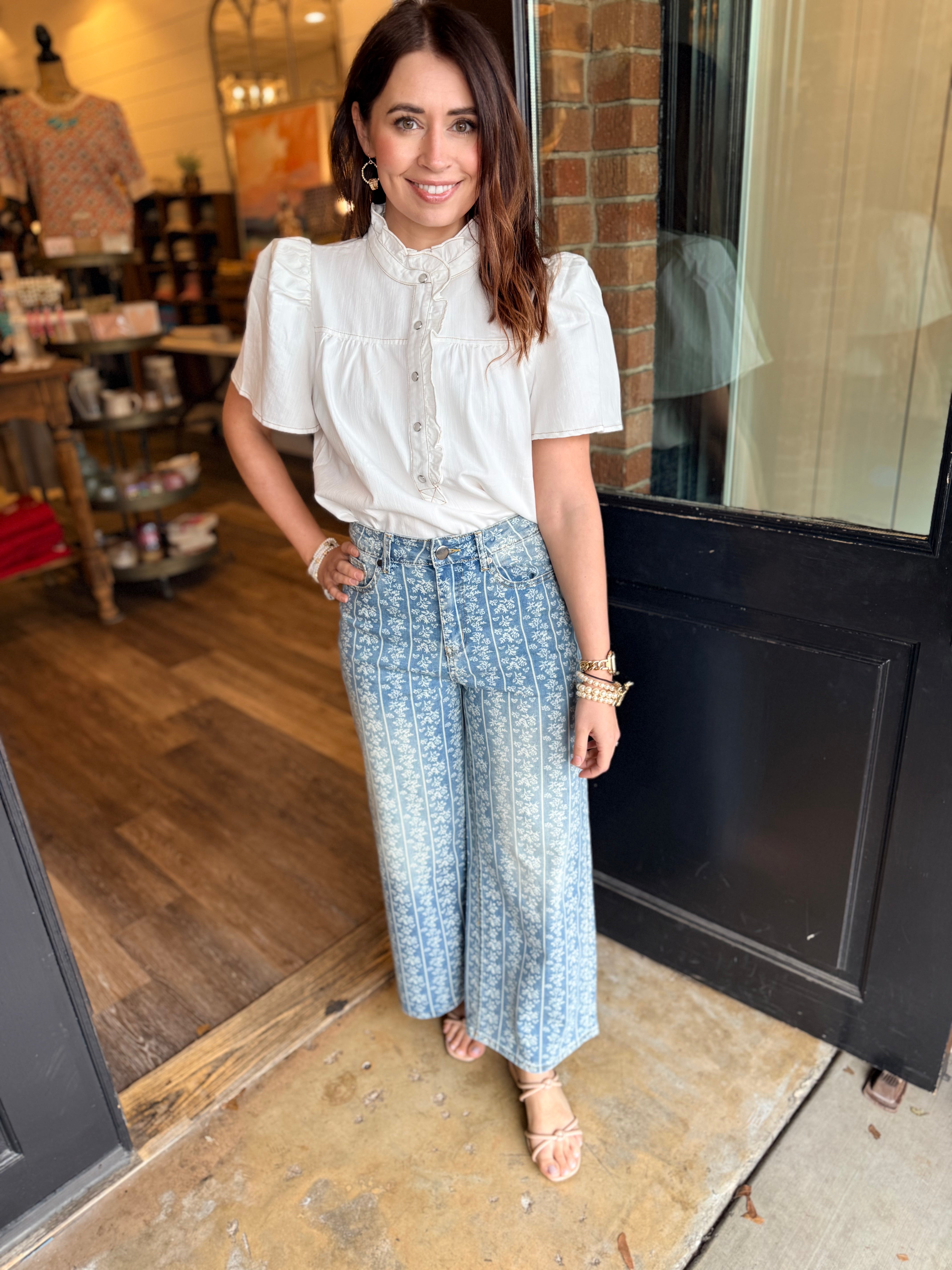 A fresh twist on everyday denim. The Belinda Floral Denim Pant features a wide-leg silhouette in soft washed denim, finished with a subtle floral pattern for a fun, feminine touch. Designed with a classic button closure and a comfortable stretch blend, these are easy to wear while still making a statement.