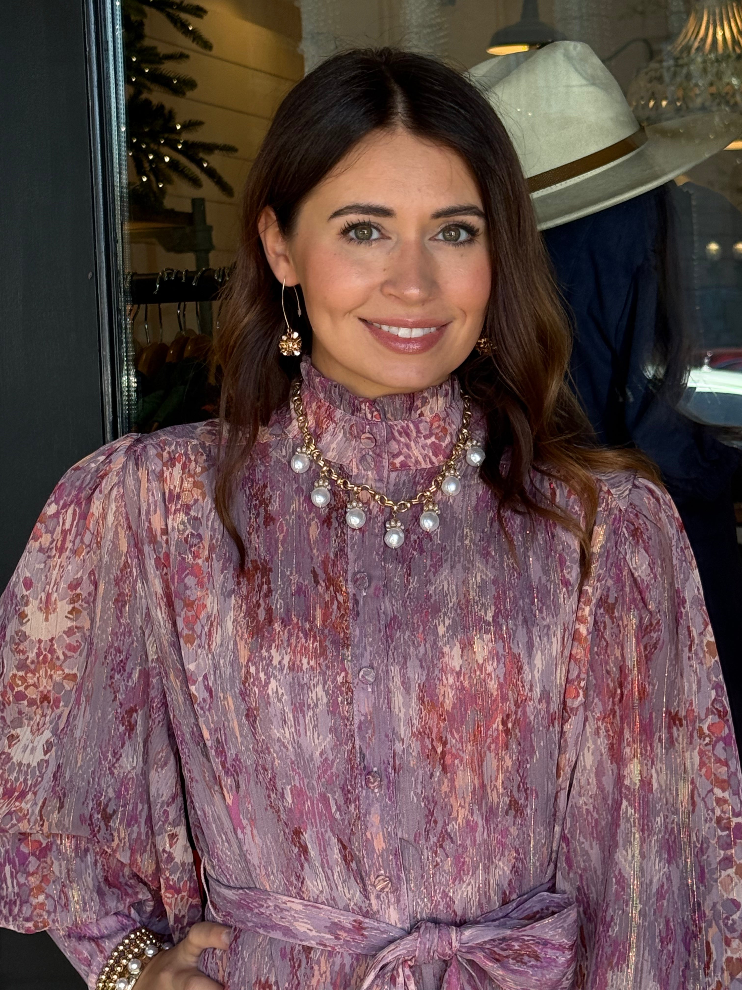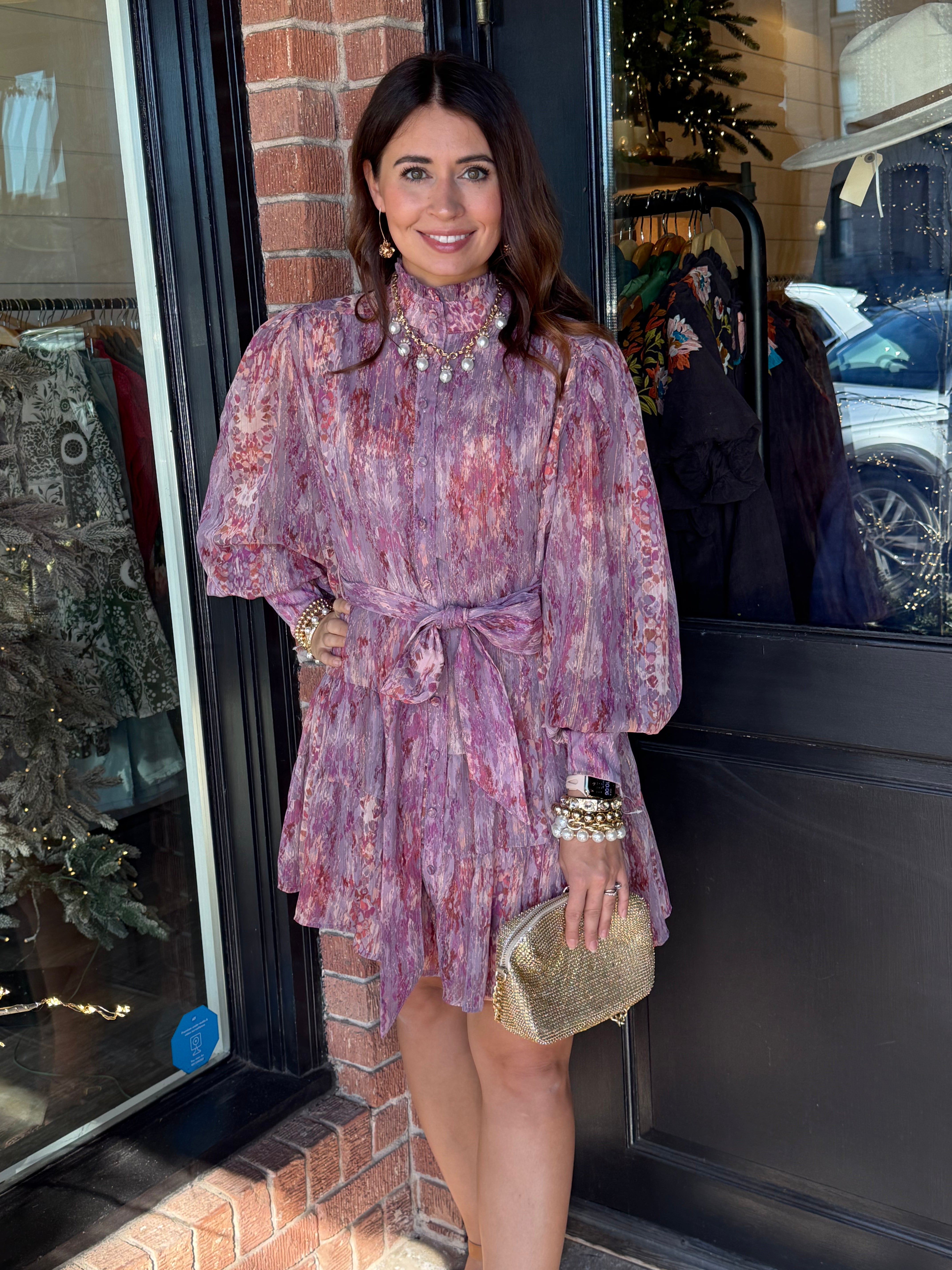 Shimmer and shine in the Bettie Metallic Print Mini Dress! ✨ Designed with a flattering tie waist and flowy tiered hem, this dress blends feminine charm with a touch of sparkle. The ruffled neckline, button-down front, and subtle metallic lurex threads make it perfect for holiday parties, date nights, or festive gatherings.