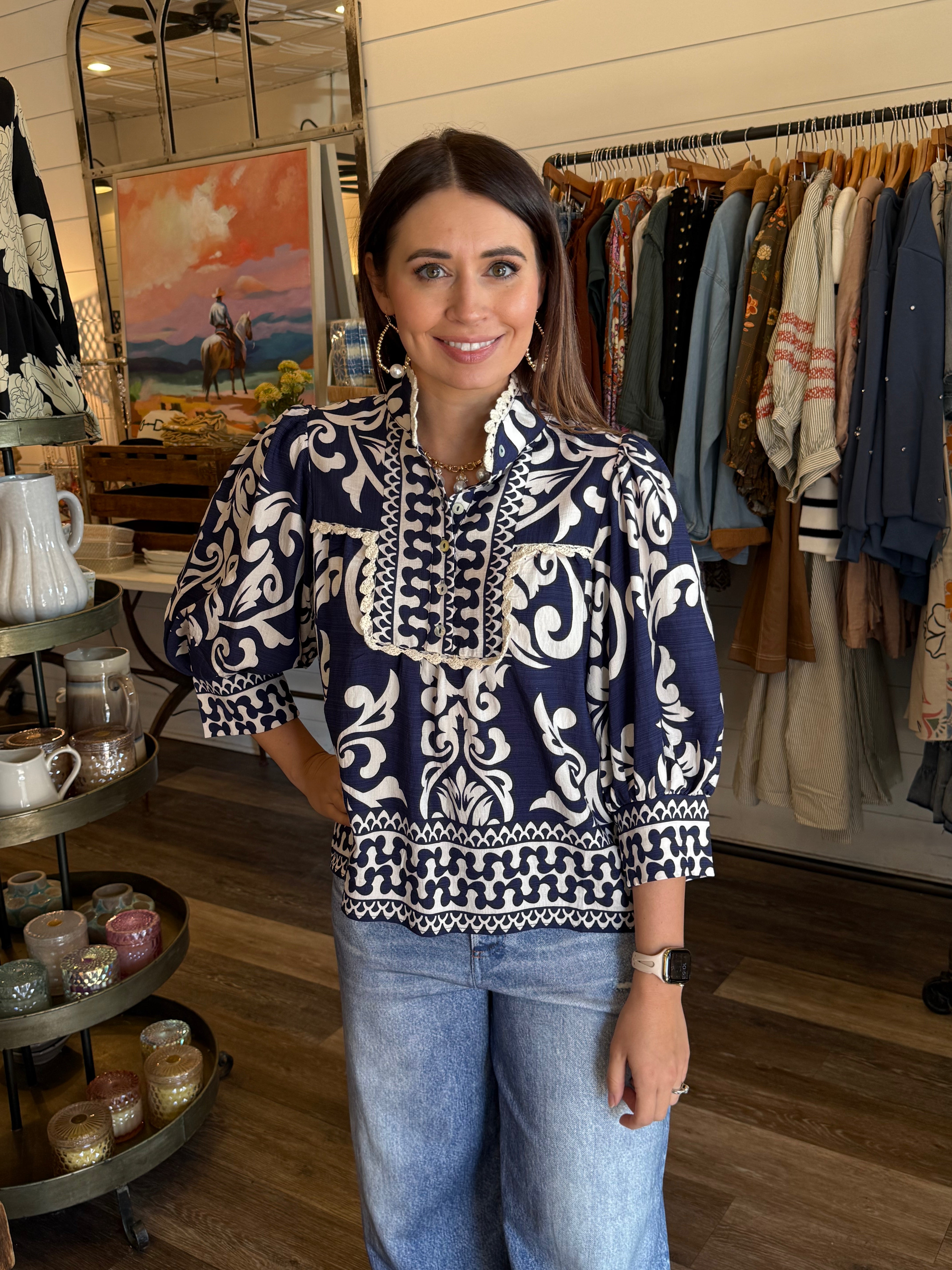 Artful and easy to wear, the Bev Abstract Top brings a fun pop of pattern to your everyday lineup. Designed with an abstract print and an upper button-down front, this top features ric rac embroidery along the upper detail for a charming, feminine touch. The 3/4 sleeves make it a versatile option you can wear season to season.