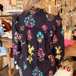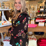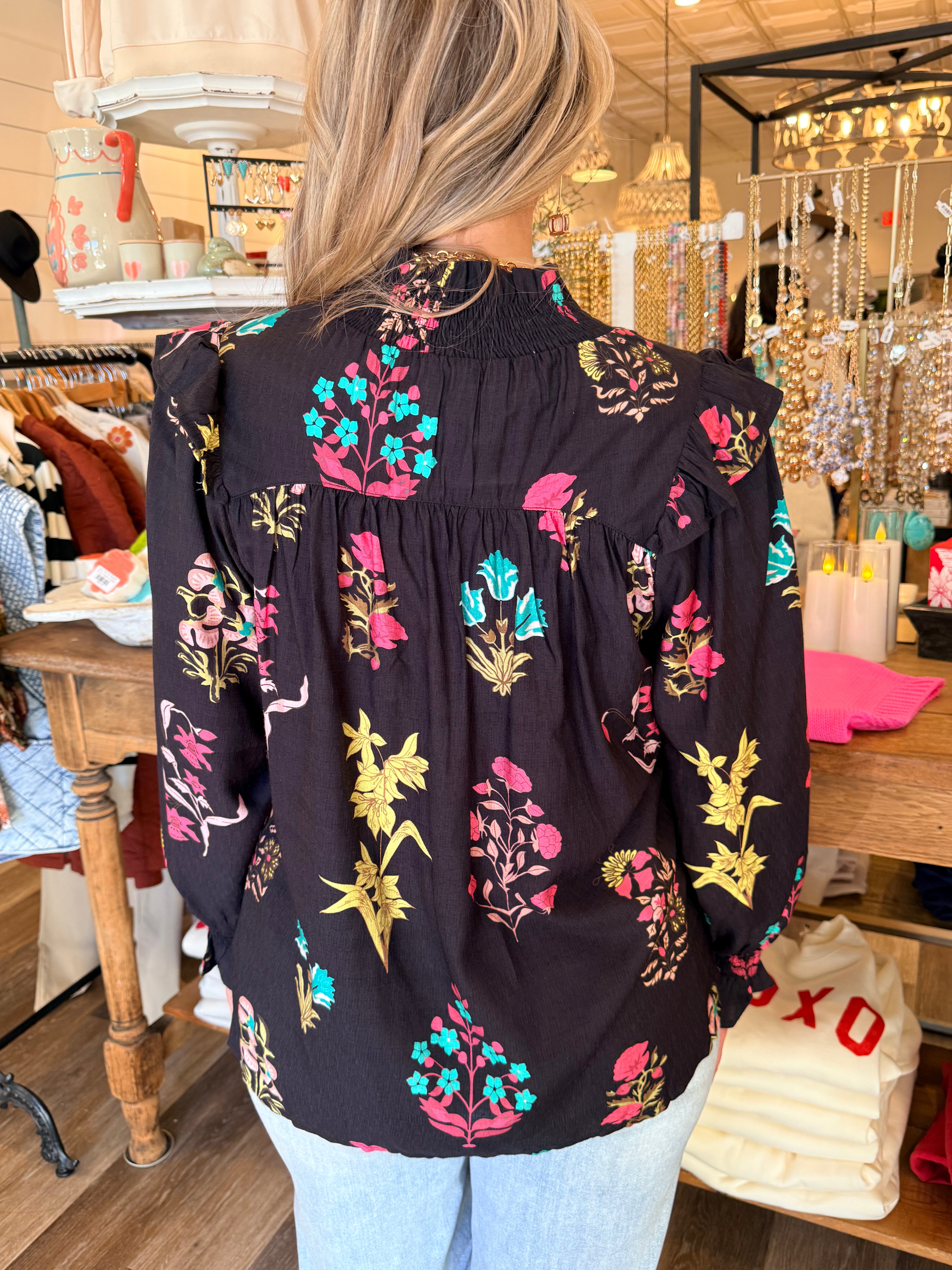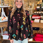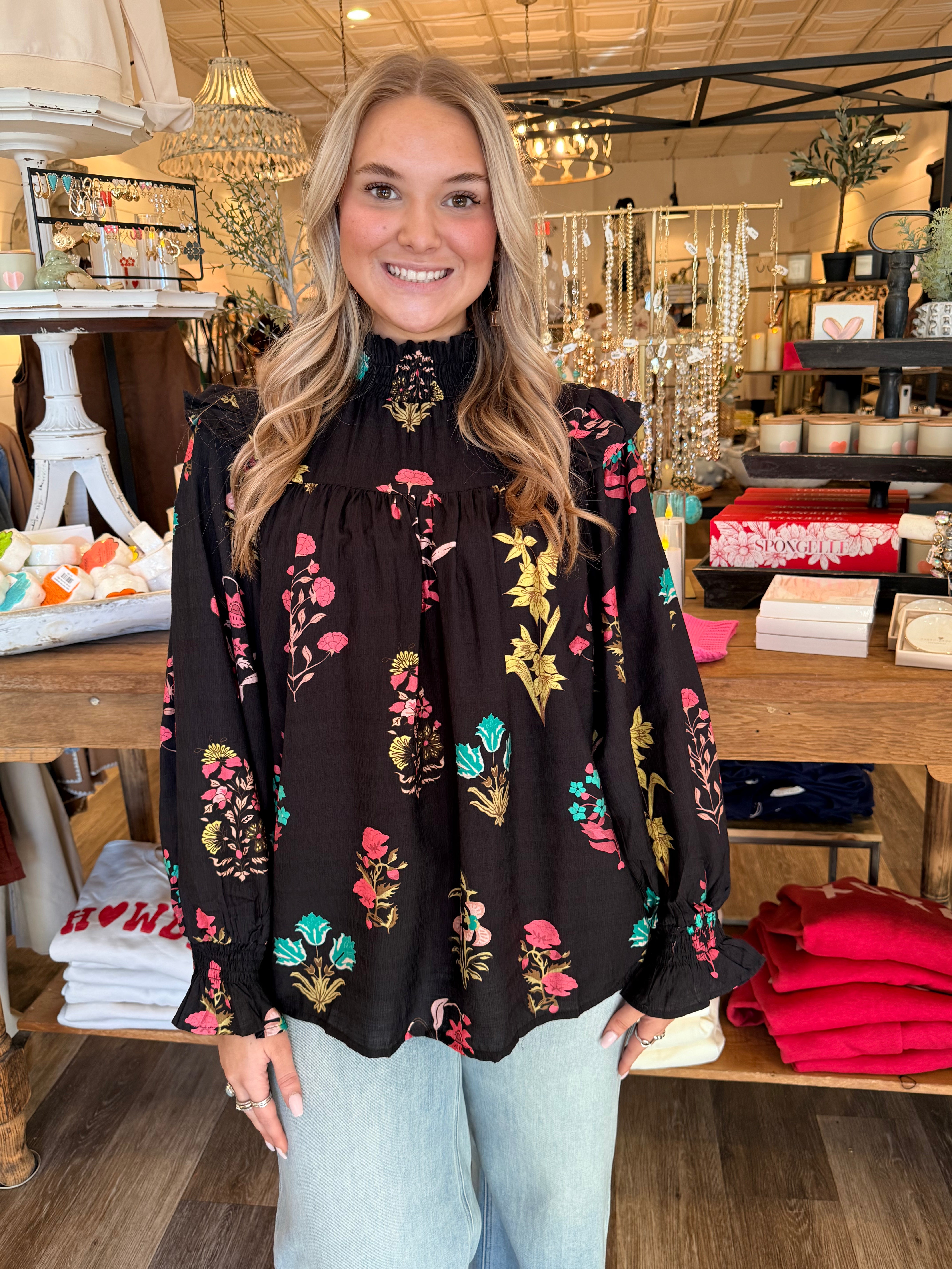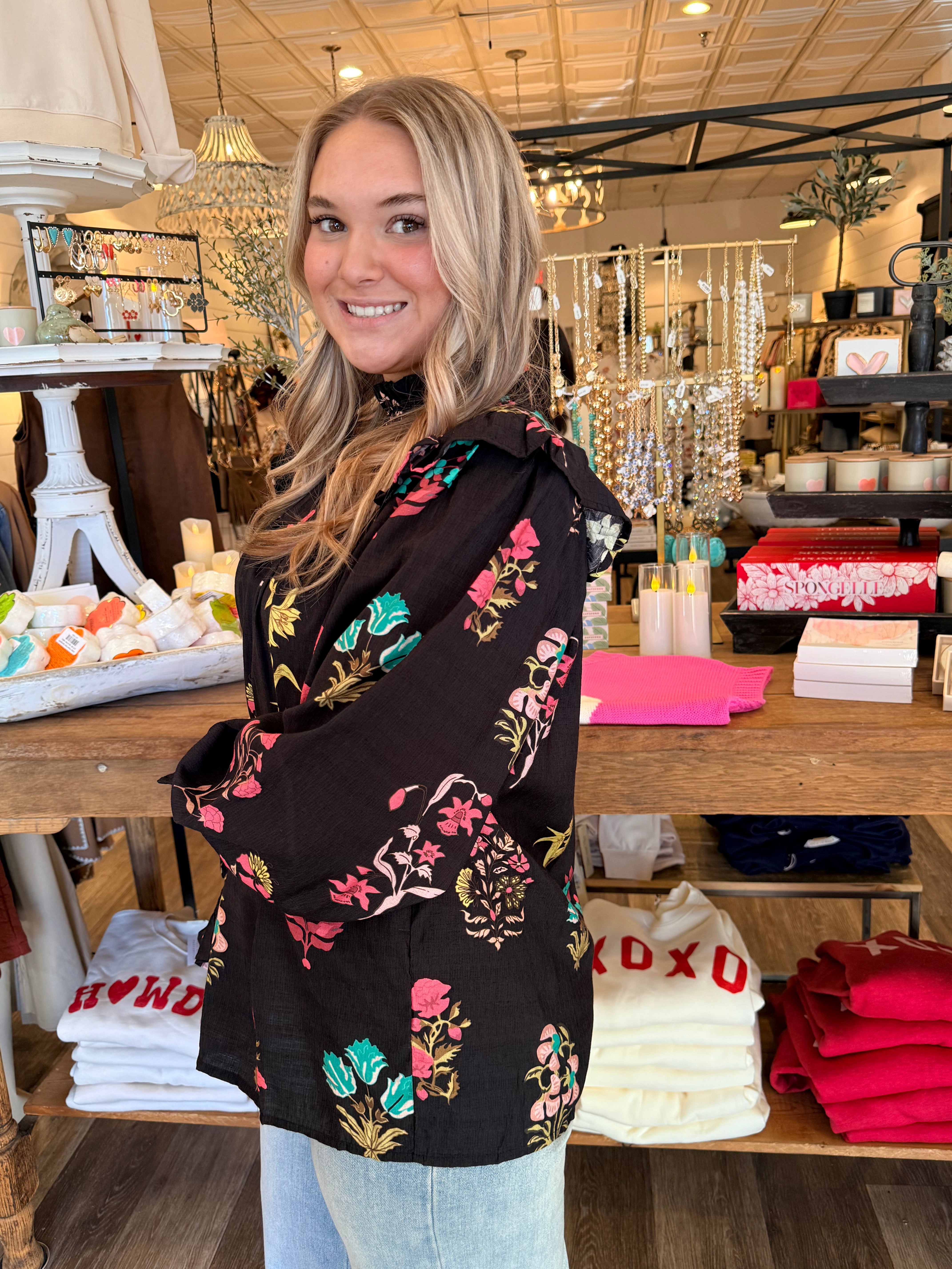 Soft, flattering, and full of pretty detail, the Crissy Black Multi Floral Top is an easy favorite. Designed with a high neckline and gentle ruching, this top gives you a beautifully draped, feminine look. The long sleeves with elastic wrists add a touch of volume while keeping it comfortable and easy to wear. Lightweight and unlined, it’s perfect for dressing up denim or pairing with trousers for a polished feel.