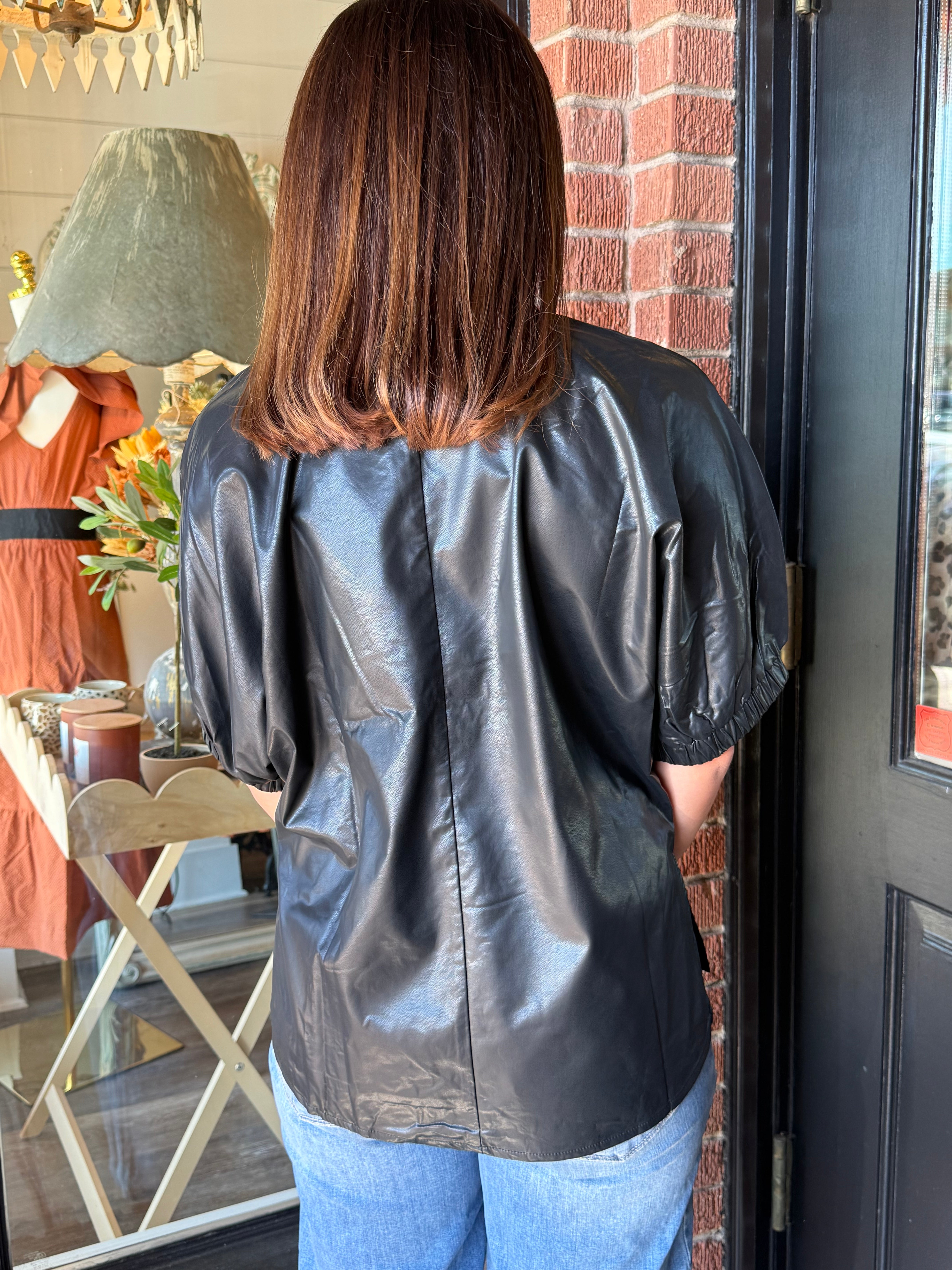 Bold, modern, and effortlessly chic — the Brandy Faux Leather Top brings an elevated edge to any outfit. Designed with short puff sleeves, a split V-neckline, and a structured stand collar, this lightweight faux leather top pairs perfectly with denim, trousers, or skirts for a statement look that transitions seamlessly from day to night.