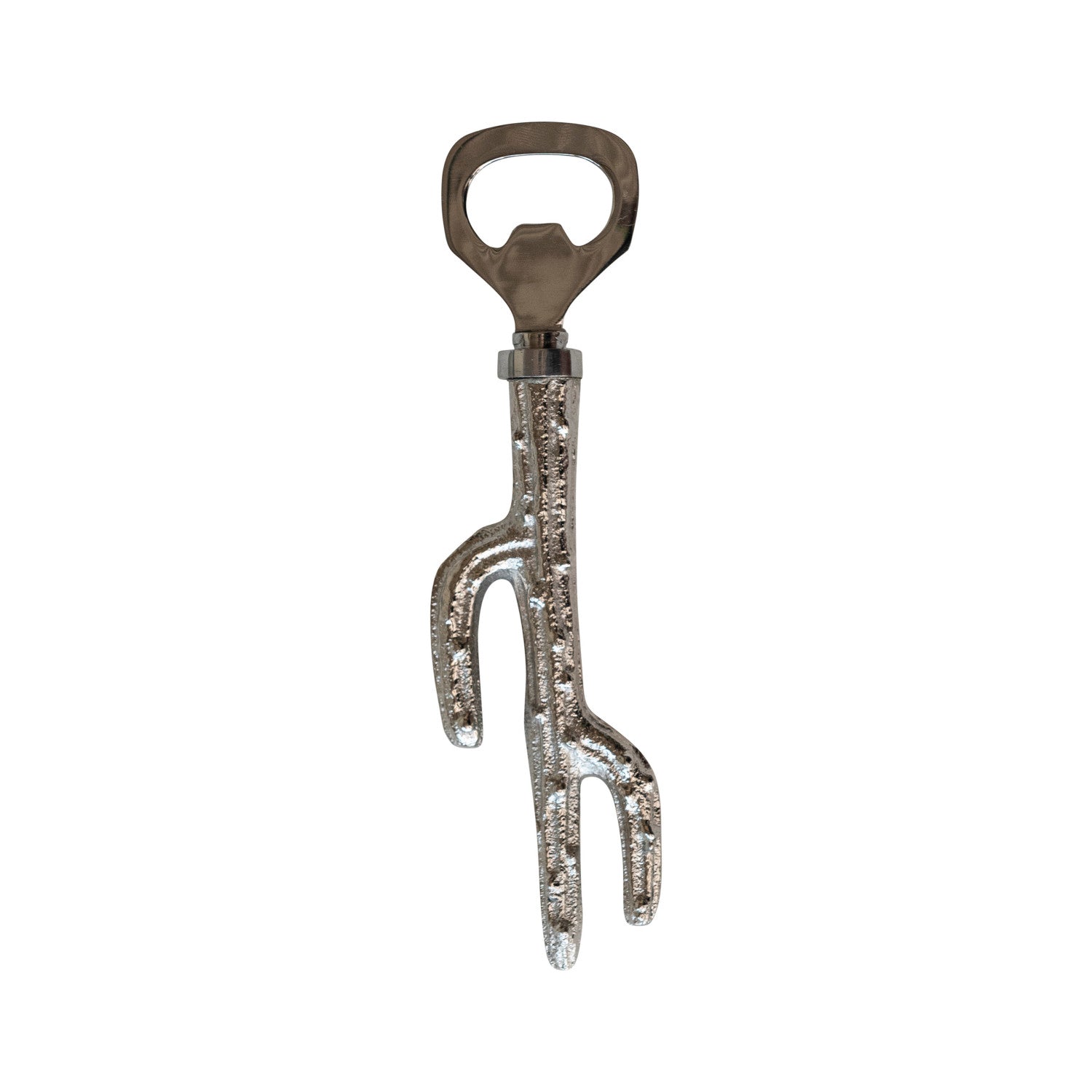 This stainless steel and aluminum cactus bottle opener is a charming addition to any kitchen. This bottle opener is in the shape of a cactus. Its nickel finish and textured surface create a cozy and shiny look. Its curved body is used to open bottles, while its flat base can stand on any surface. This item can be used as a decorative item or a gift, matching various decor styles like farmhouse, boho, or garden. Made from sturdy and durable materials, it is easy to clean. This nickel finish makes it a perfect gift or addition to any kitchenware collection. 7"L Stainless Steel & Aluminum Cactus Shaped Bottle Opener, Nickel Finish