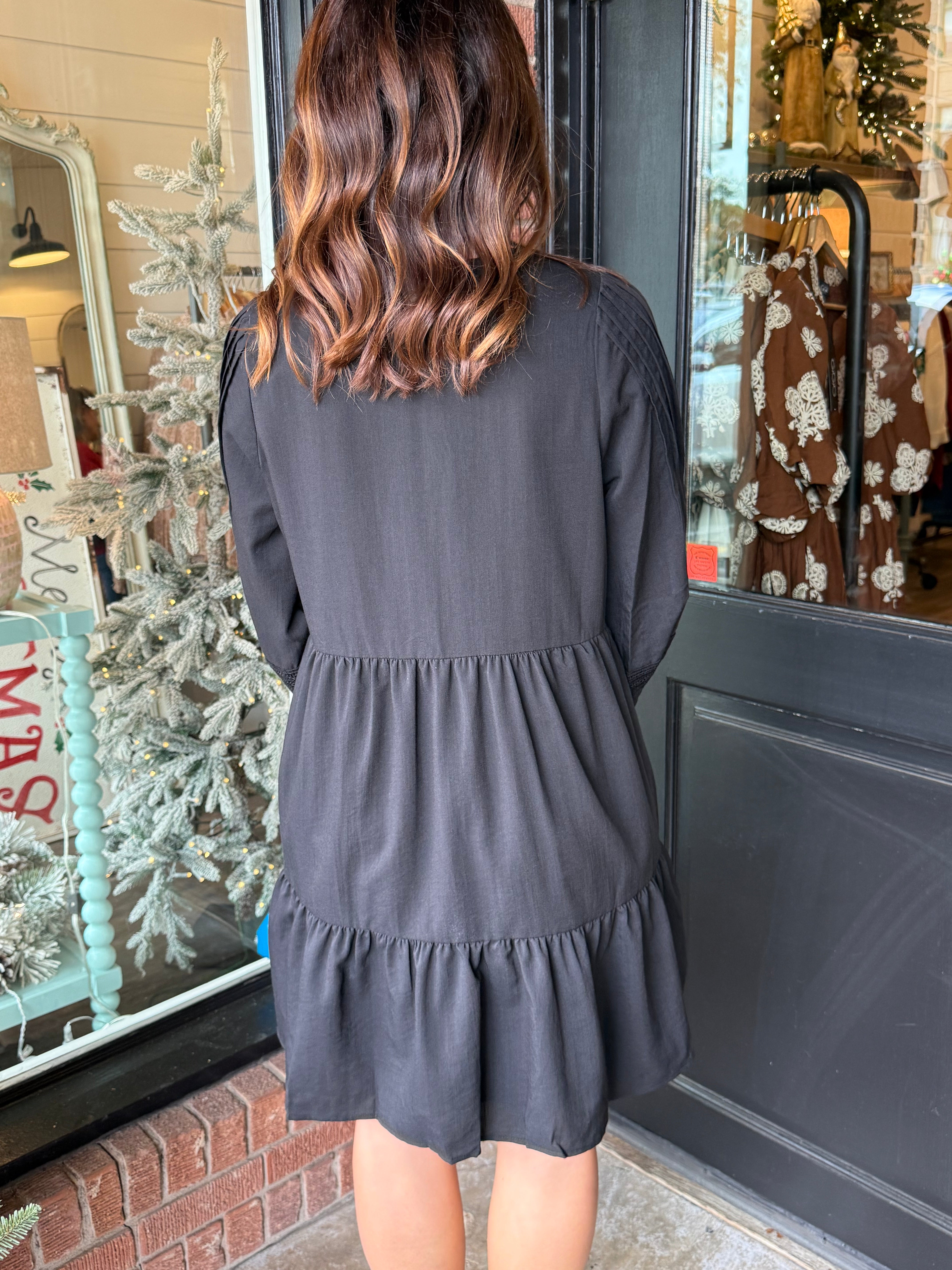 The Camille is a beautifully detailed solid mini dress with the sweetest touches. This woven, lightweight style features lace inserts, pintuck detailing at the front, long sleeves with buttoned cuffs, and a button-front closure. The ruffle hem adds a playful finish, while side pockets and full lining make it an easy, wearable choice for everyday or special outings.