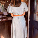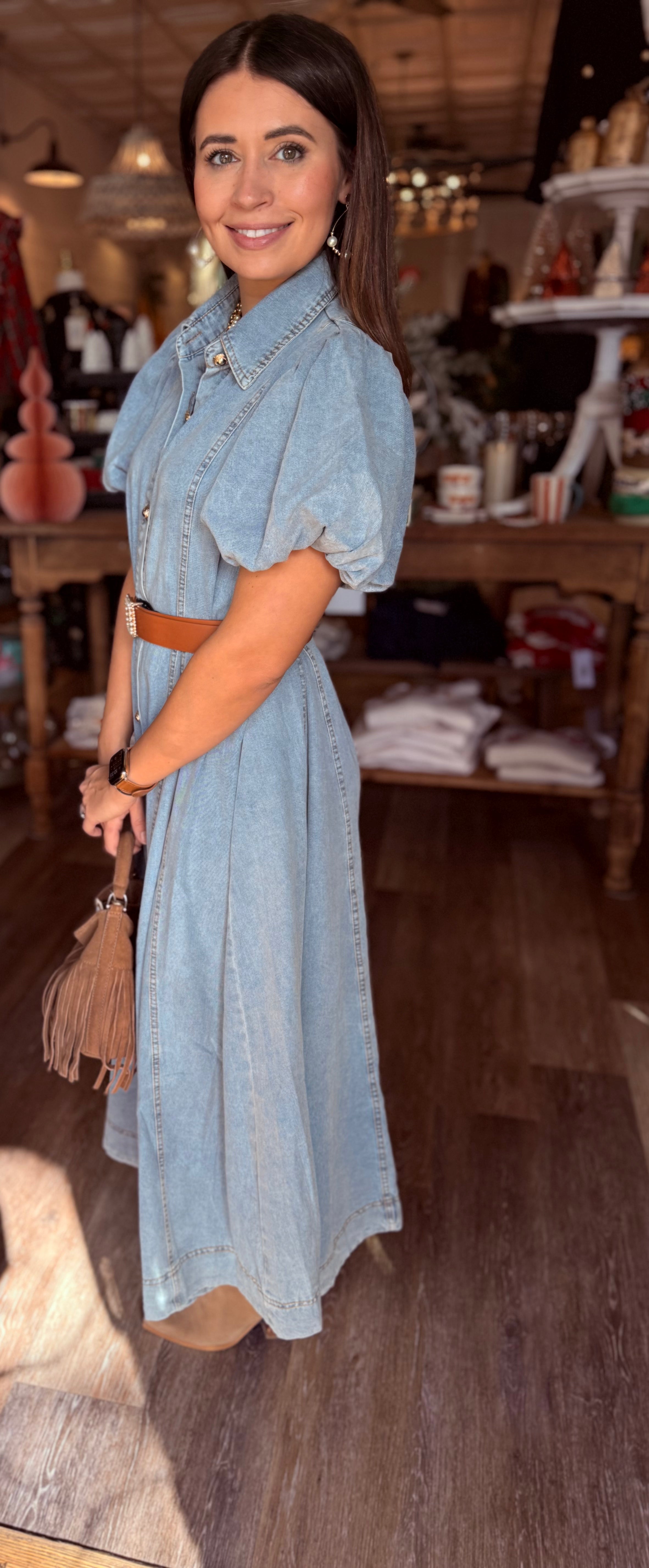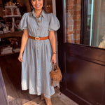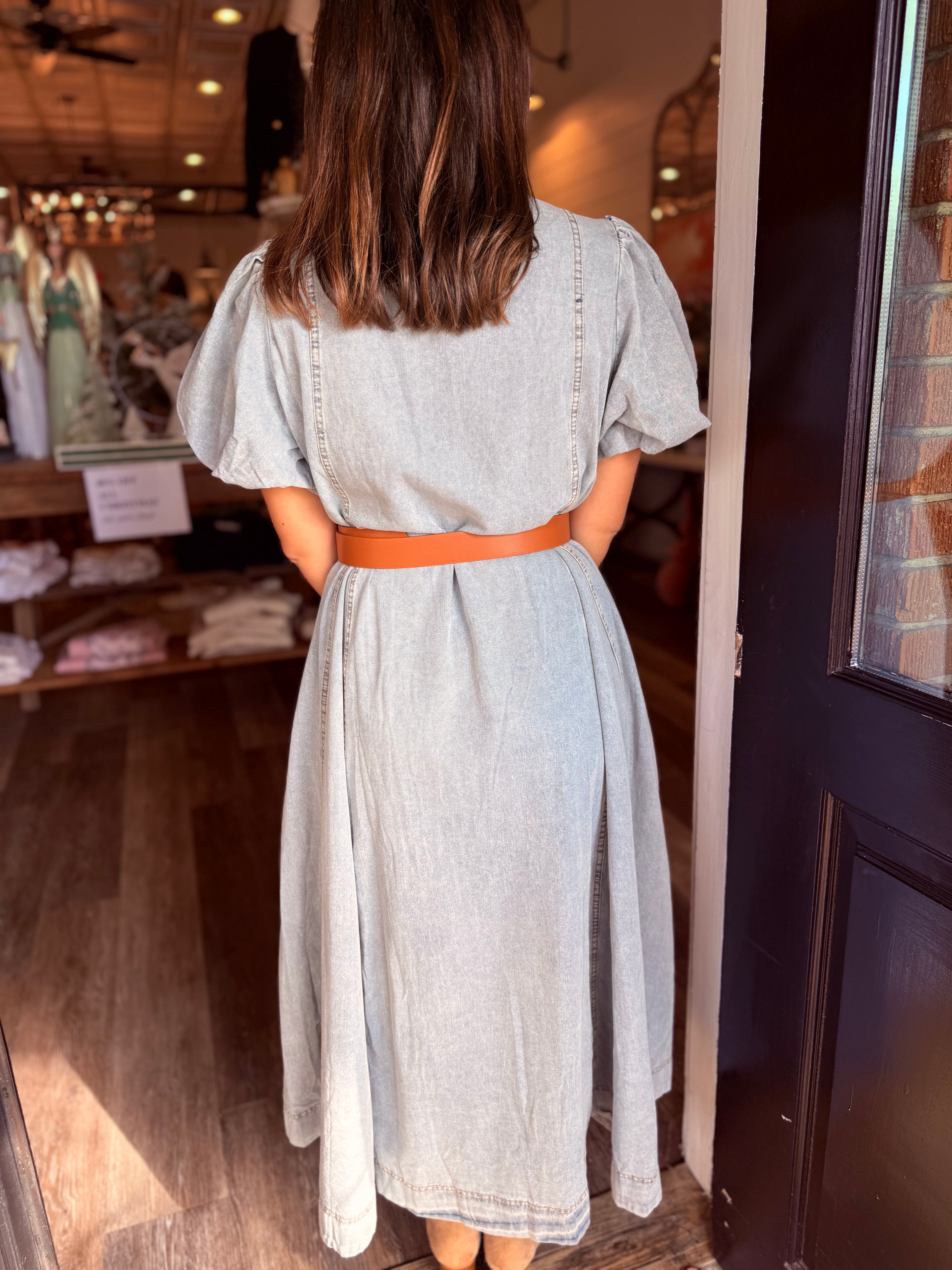 A classic denim shirtdress gets a fresh, feminine update with voluminous puff sleeves and a flowing A-line silhouette. Crafted from soft, lightweight denim, this maxi dress blends timeless utility with modern romance—making it a standout piece you’ll reach for again and again.