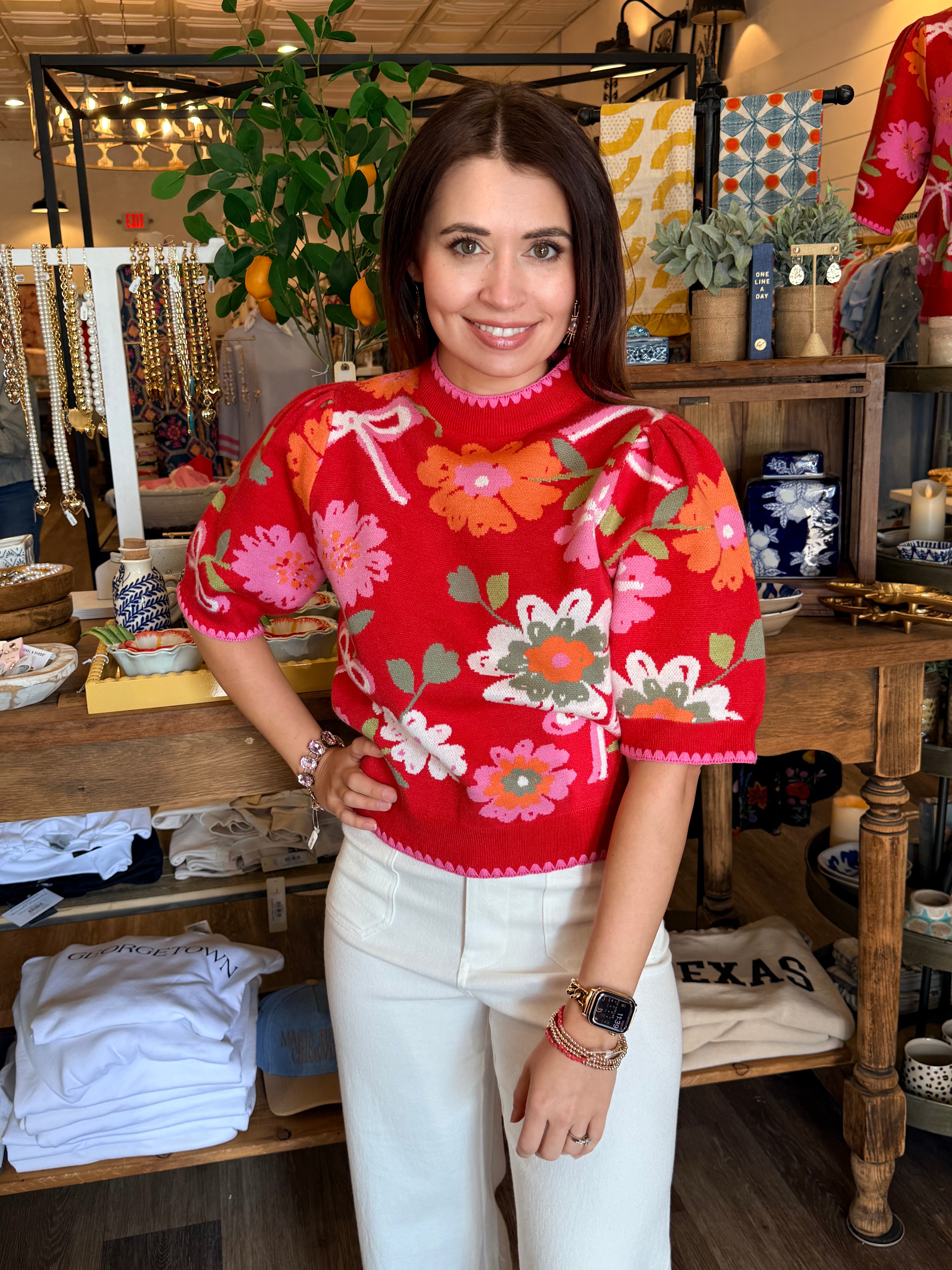 Sweet, soft, and perfectly polished — the Caroline Floral Sweater Top is a cozy-meets-cute staple for your closet. This short sleeve knit features delicate floral detailing that adds a feminine touch to a classic sweater silhouette. Made from a soft, lightweight knit blend, it’s comfortable enough for all-day wear while still feeling elevated.