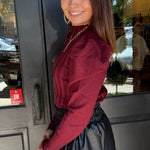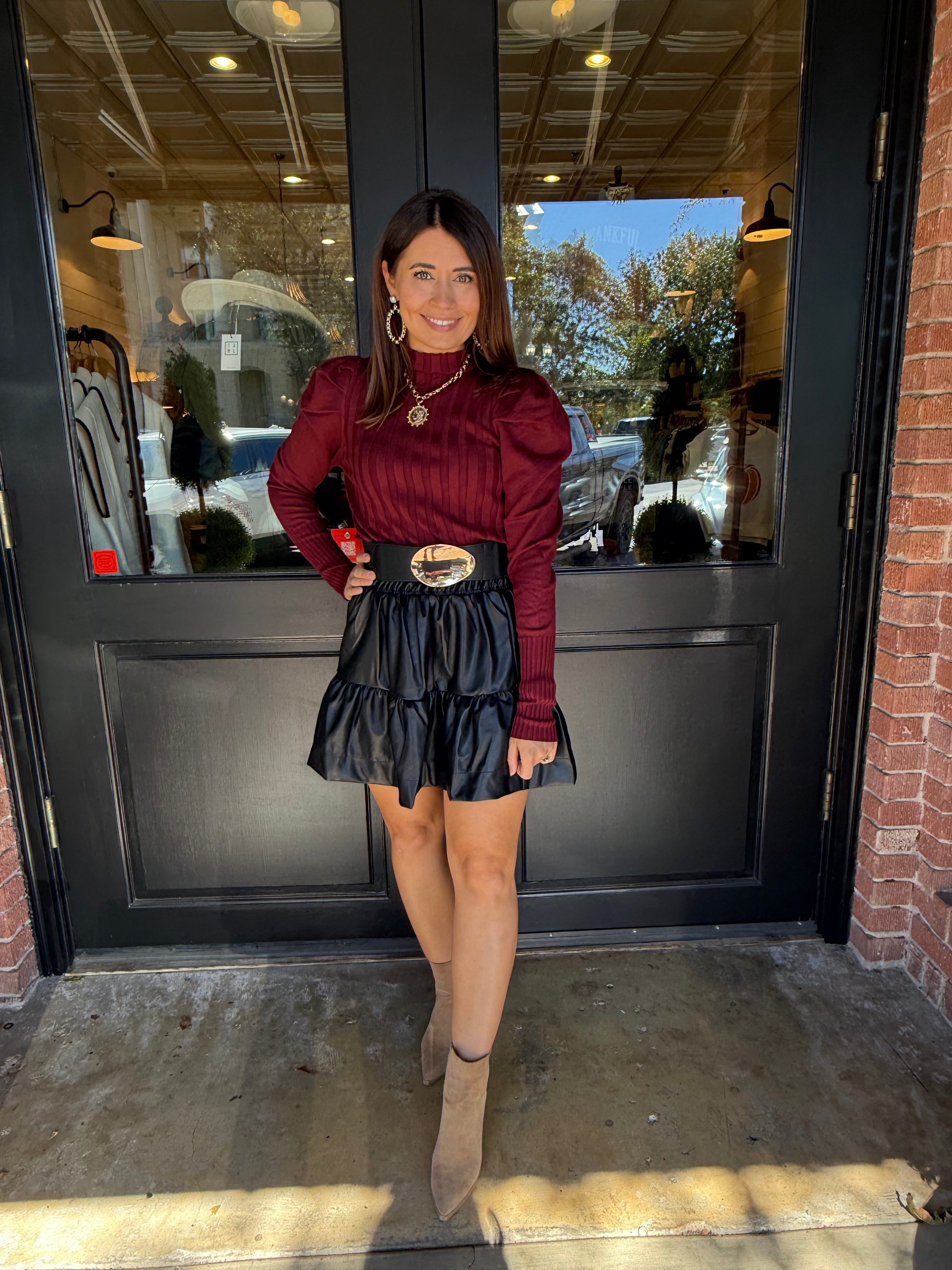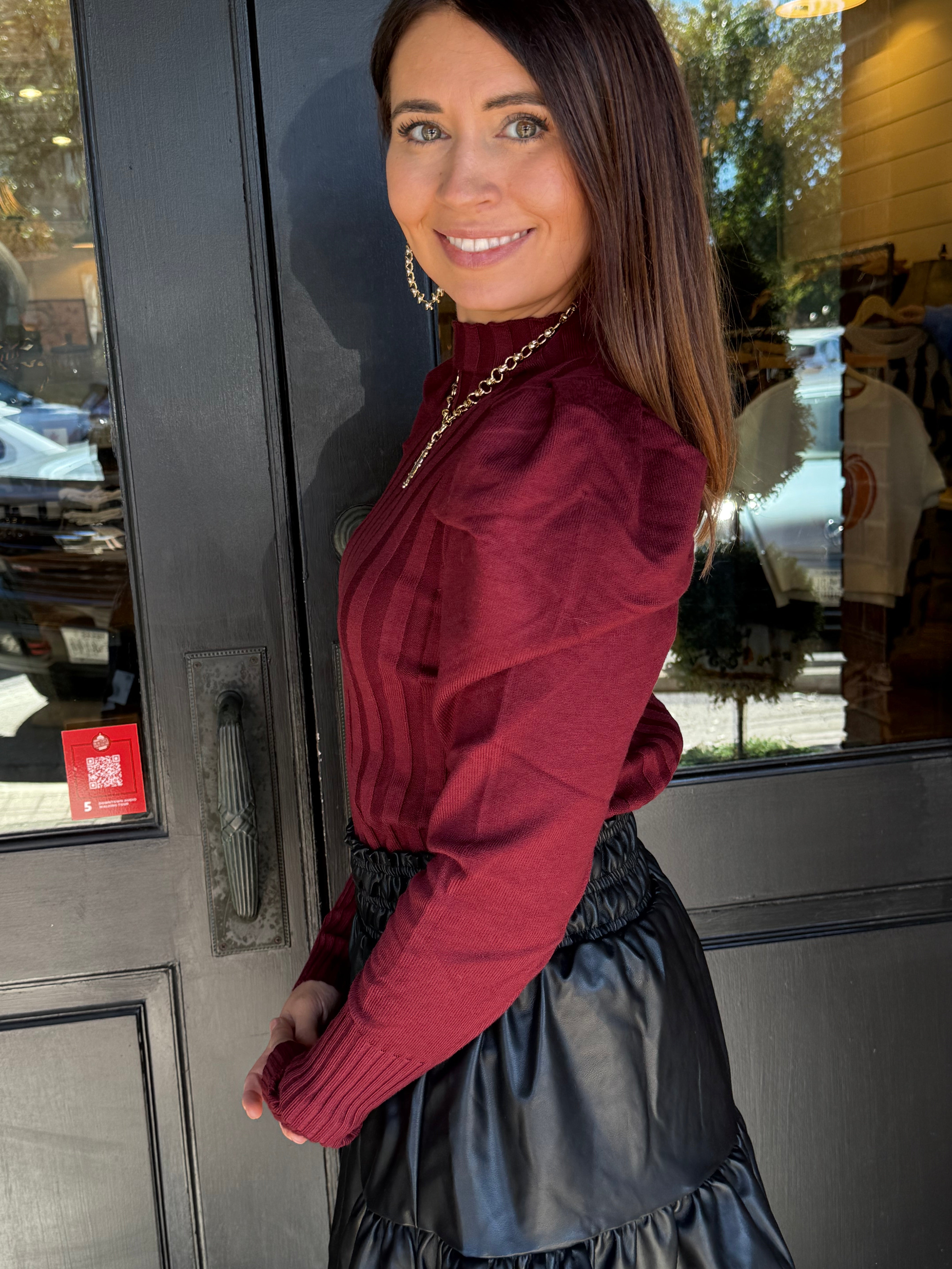 Soft, stylish, and beautifully detailed — the Carolyn Maroon Knit Top brings a touch of sophistication to your fall wardrobe. Featuring a mock neckline and puffed long sleeves, this knit top offers a flattering fit with just the right amount of structure and stretch.