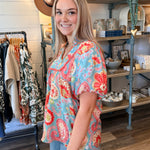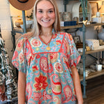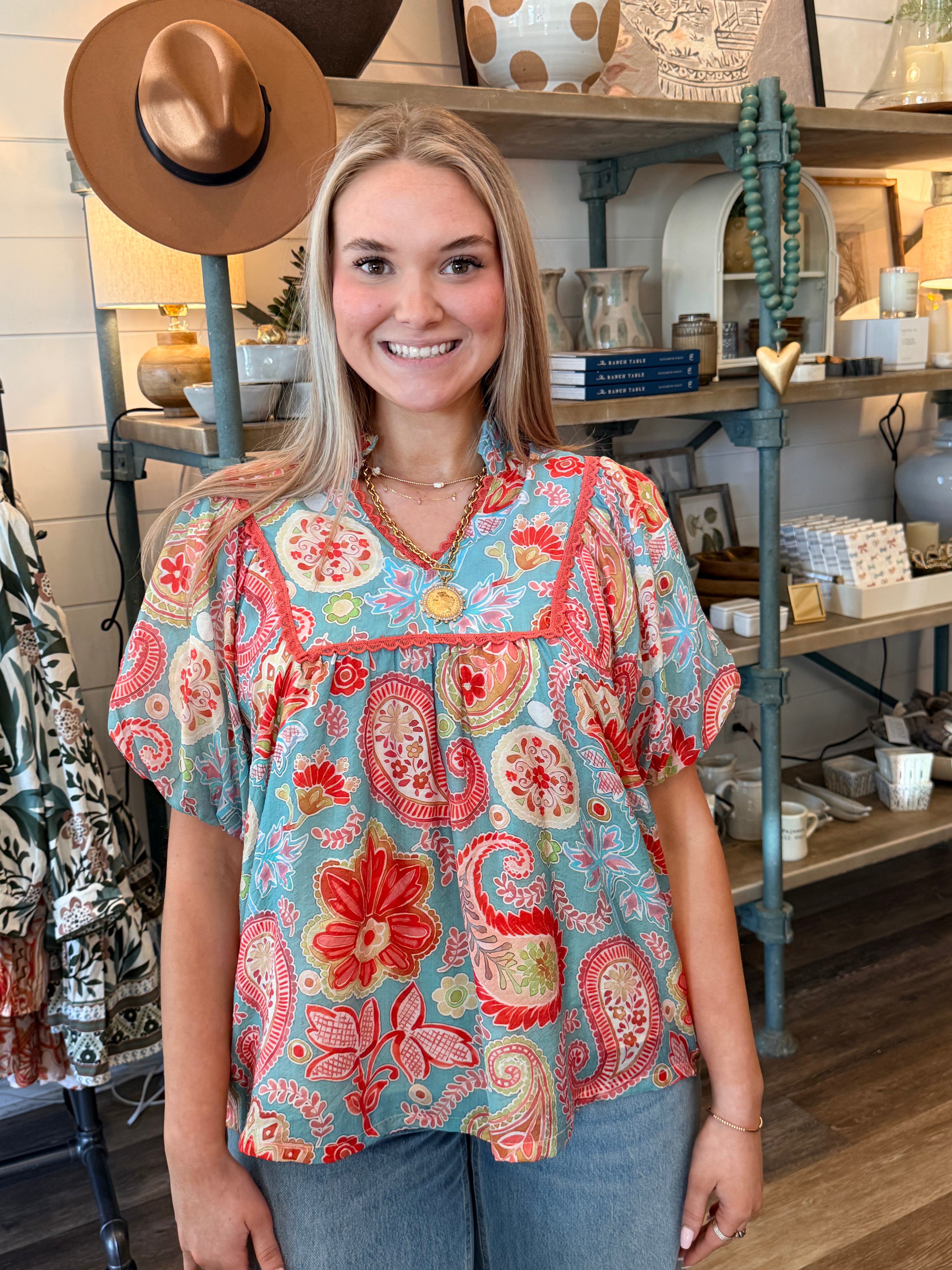 Bright, feminine, and easy to style, the Cassandra Mix Paisley Print Blouse with Puff Sleeves adds personality to any look. Designed with a relaxed fit, this blouse features a split V-neckline accented with contrast trim for a polished touch. Short puff sleeves and decorative trim details give it a playful, elevated feel, while the full lining ensures comfortable, confident wear. Perfect with denim or dressed up with trousers for a put-together everyday outfit.