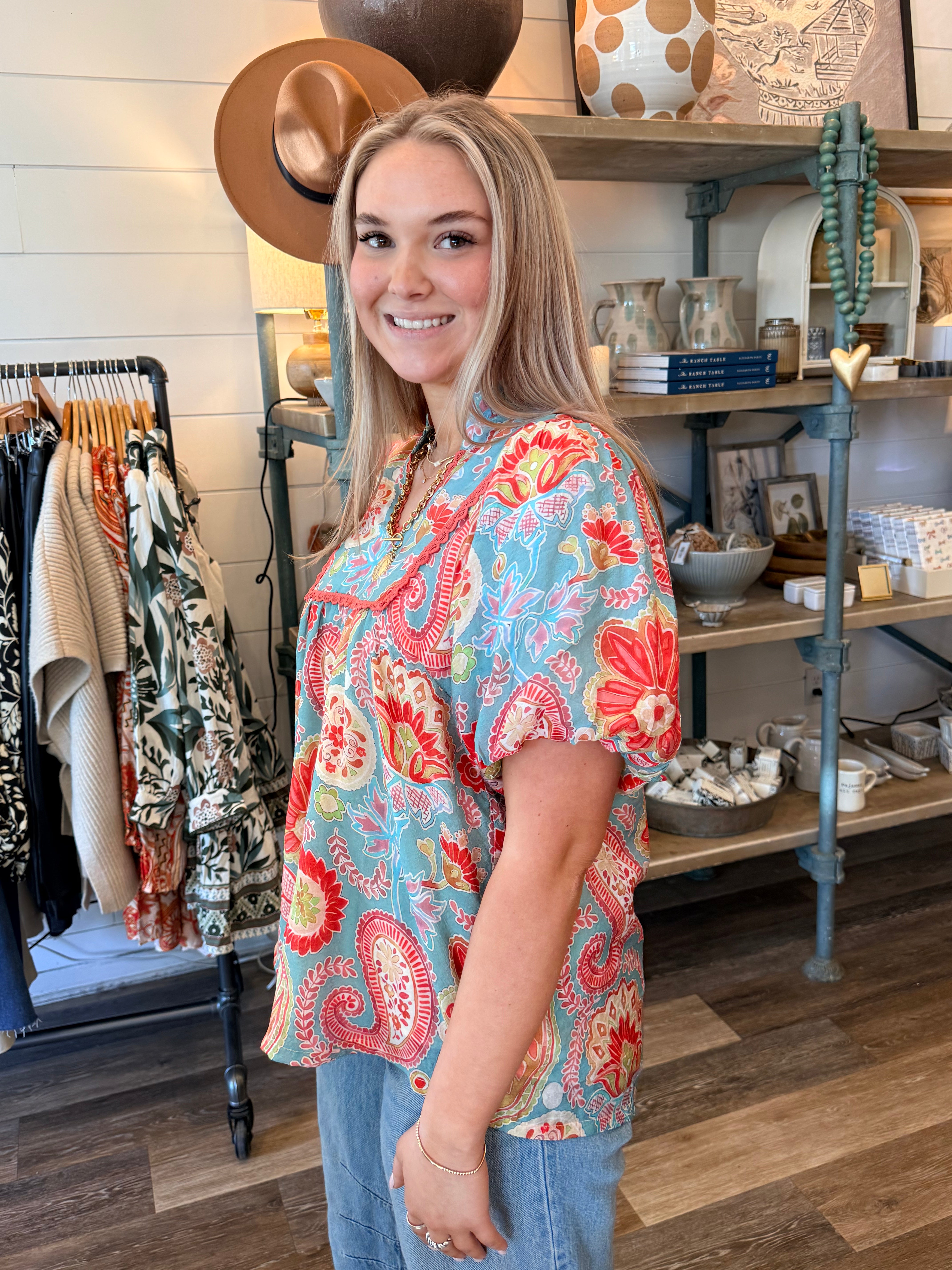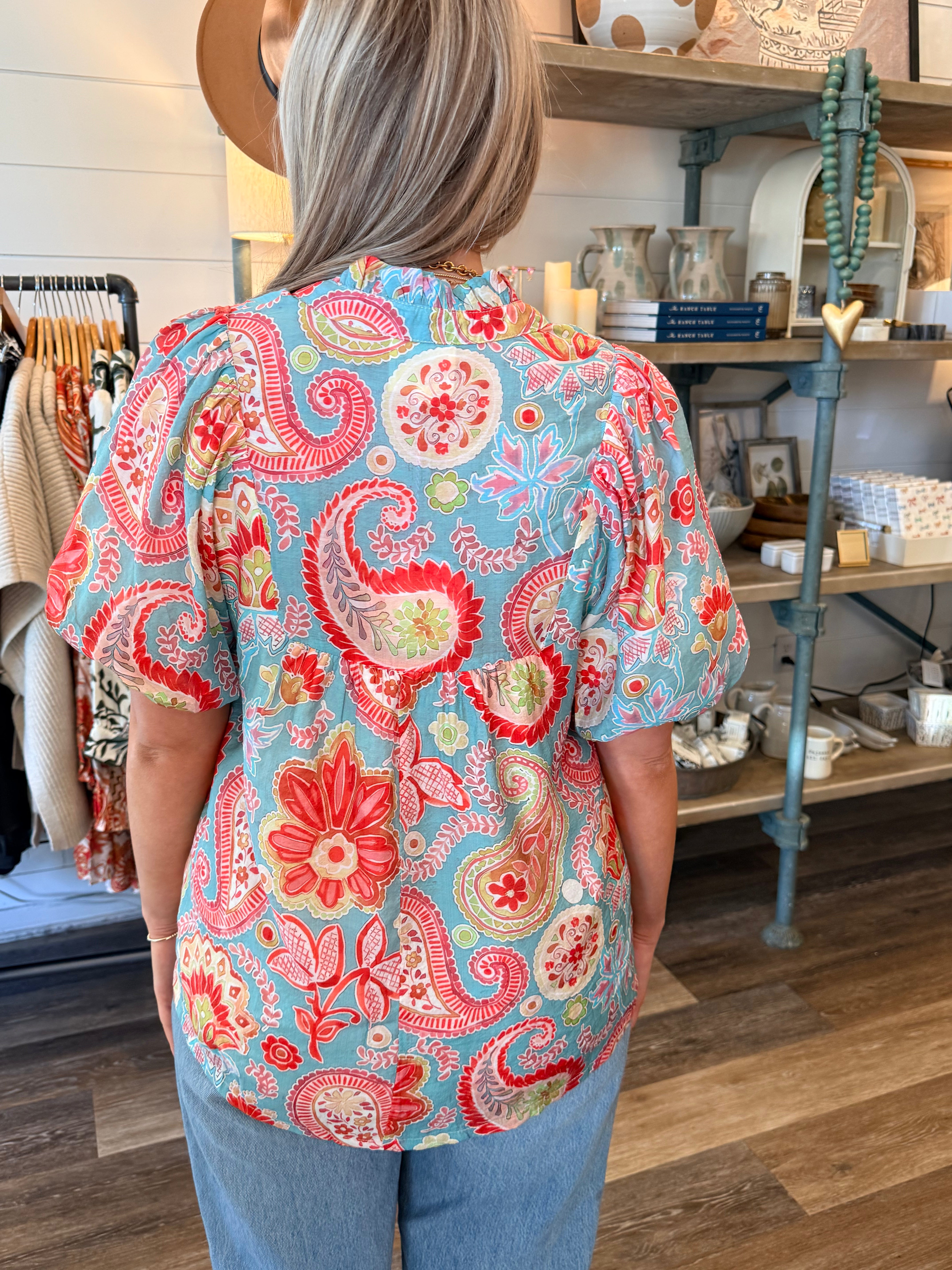 Cassandra Mix Paisley Print Blouse with Puff Sleeves