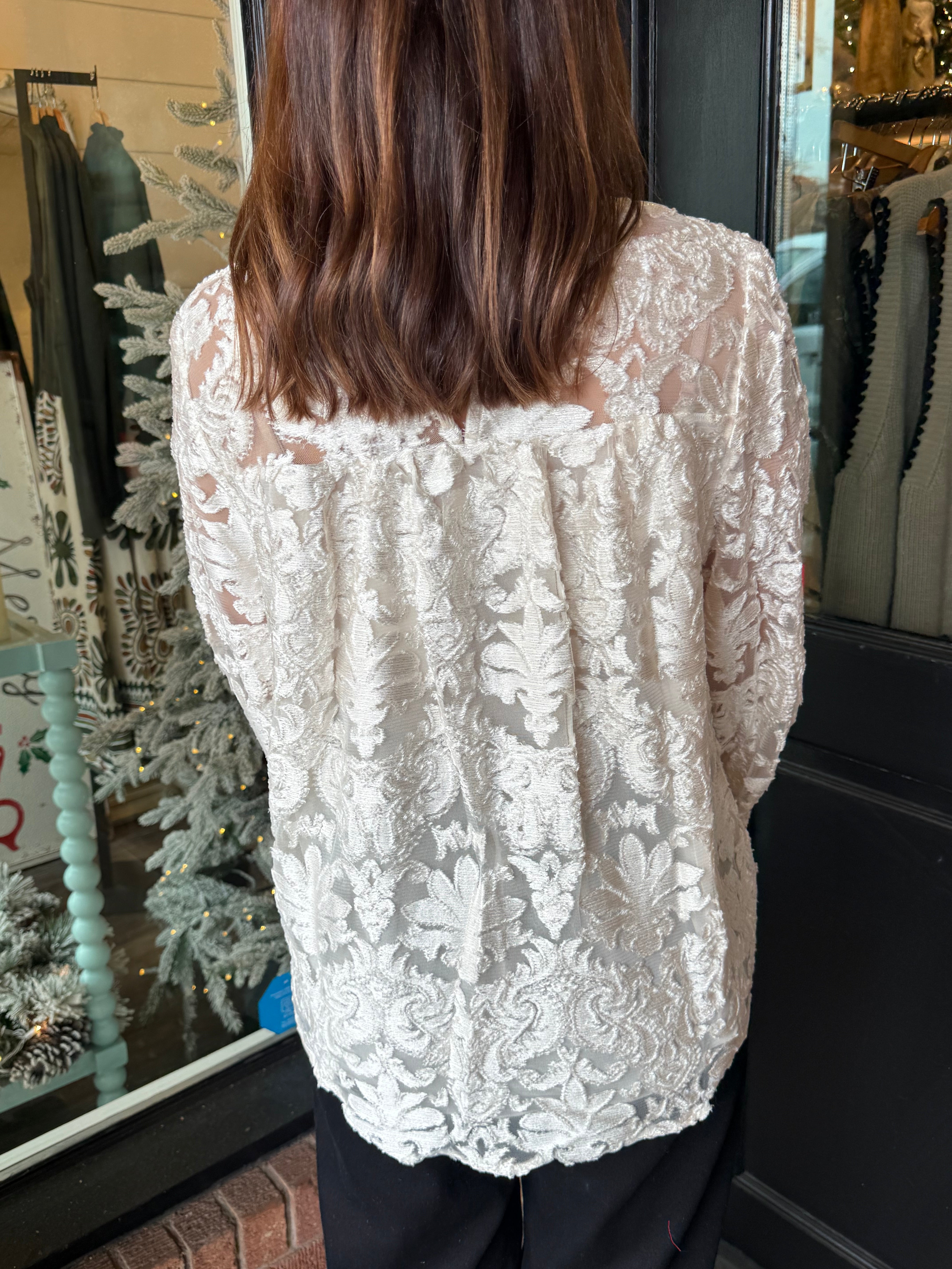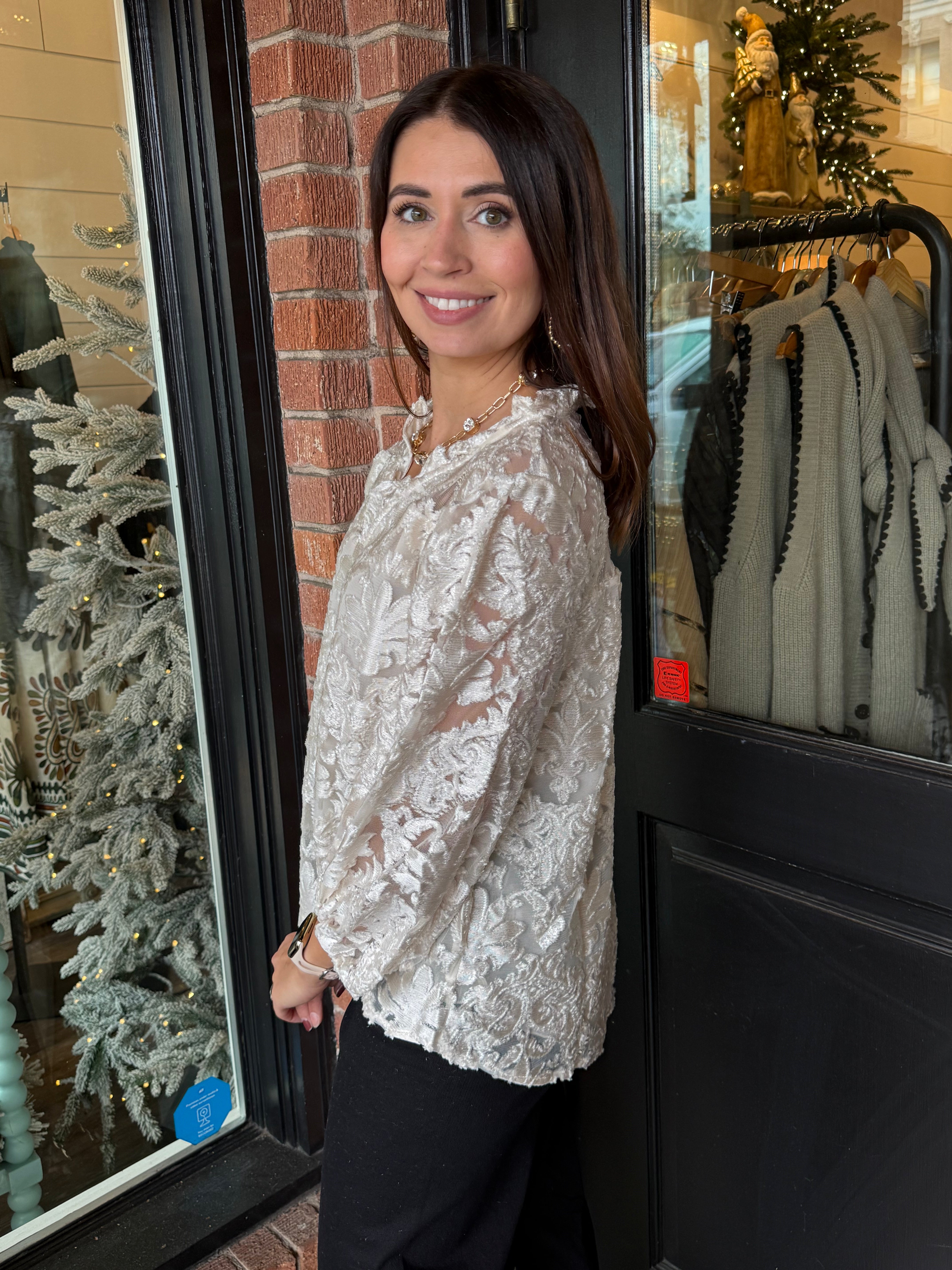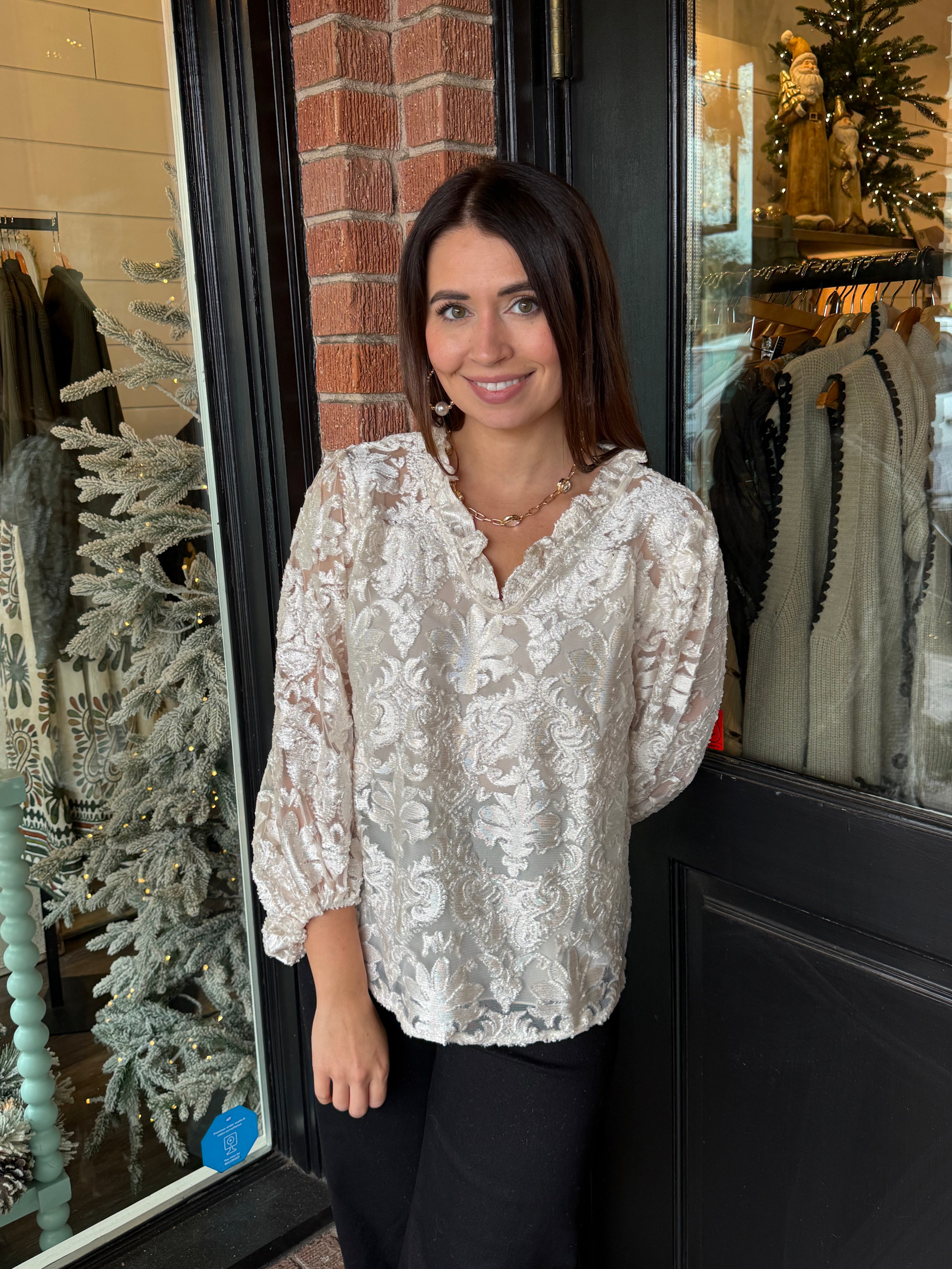 The Celeste Velvet Top is a stunning statement piece with rich texture and subtle shine. Designed in a luxe lurex burnout velvet, this blouse features a flattering ruffled V-neckline that adds movement and feminine detail. Perfect for holidays, dinners, and special occasions, it’s an effortless way to dress up denim or pair with skirts and trousers.