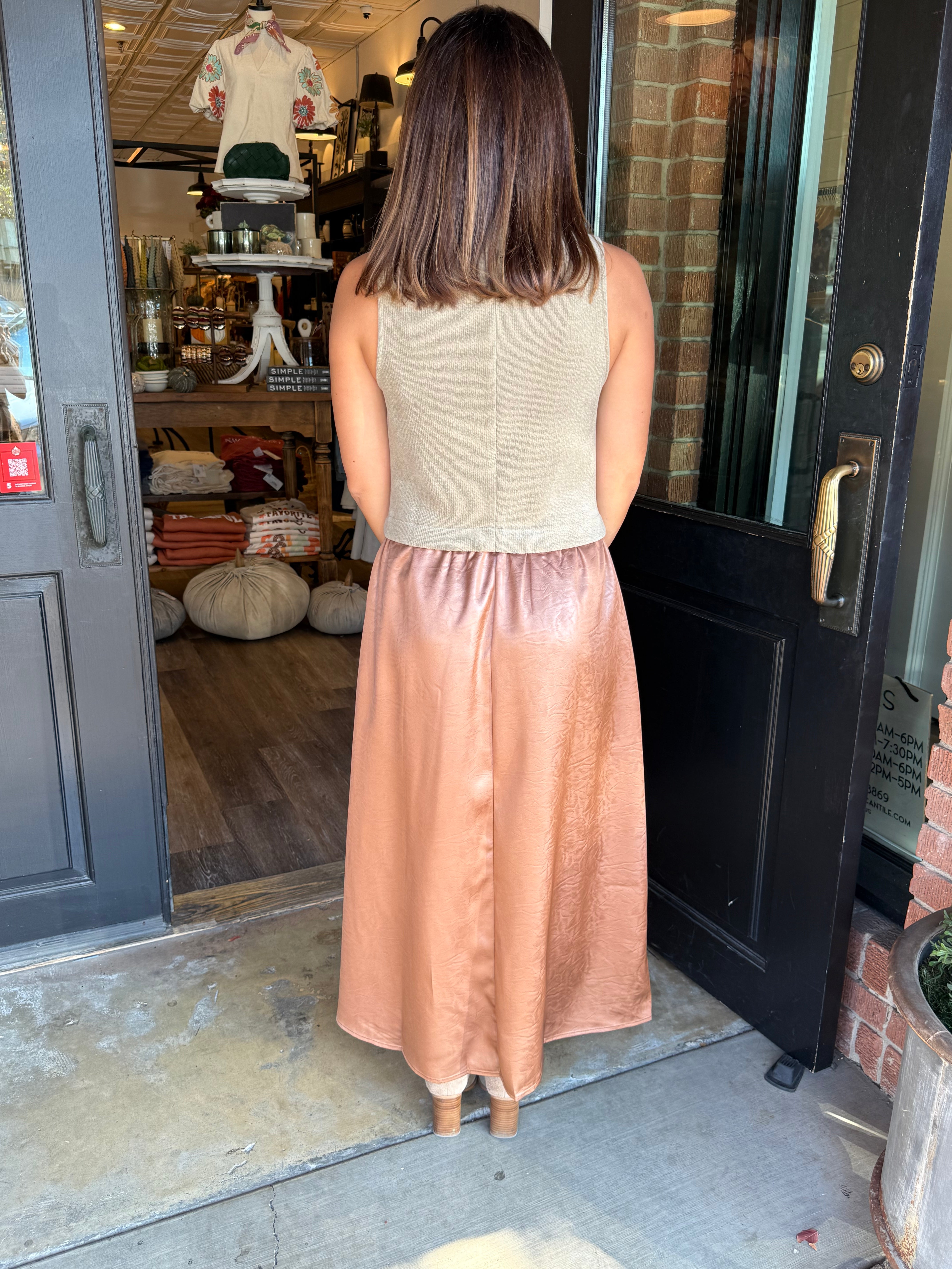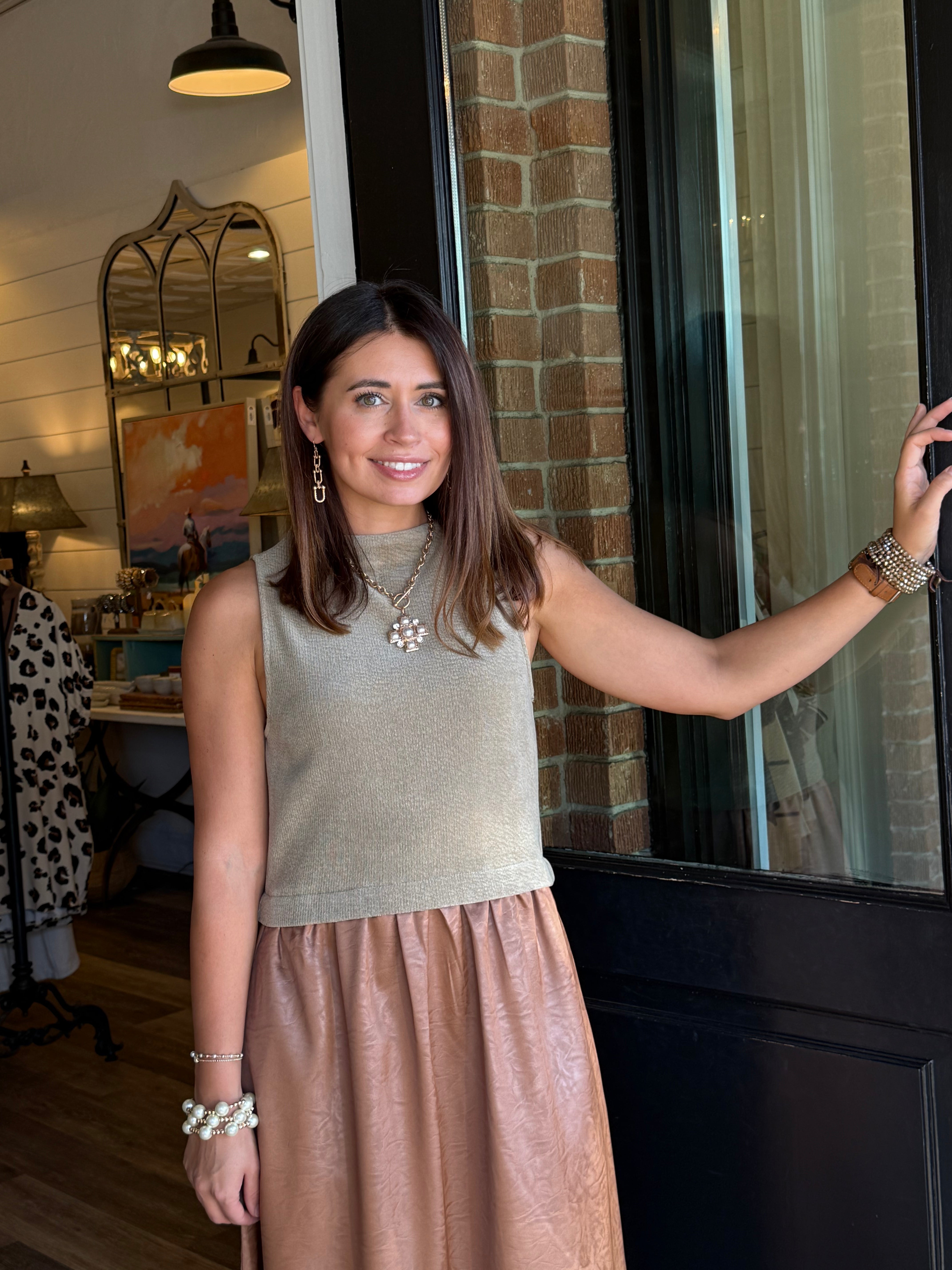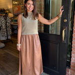 This sleeveless mixed media design features a knit bodice paired with a woven maxi skirt, creating a flattering silhouette that transitions beautifully from day to night. Perfect for brunches, weddings, or weekend getaways, it’s the kind of dress you’ll wear on repeat.
