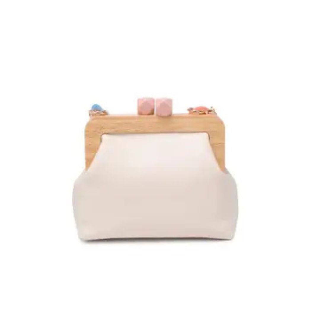 Make a statement with this elegant evening bag that combines modern design with timeless charm. Crafted from smooth vegan leather and accented with a natural wooden frame, this bag features a stunning rainbow marbled resin chain handle that adds a pop of color and personality. The gold hardware brings a refined finish, making it the perfect accessory for weddings, date nights, or special events.