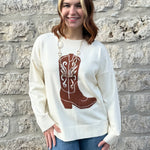 Saddle up in cozy Western style with the Cowboy Boot Graphic Sweater — the perfect blend of comfort, charm, and cowgirl flair. This oversized knit pullover features a bold cowboy boot graphic across the front, giving it that fun, rodeo-ready attitude. The soft knit texture, relaxed fit, and ribbed hems make it a go-to layer for gamedays, weekend adventures, or any casual look that needs a little Western sparkle.