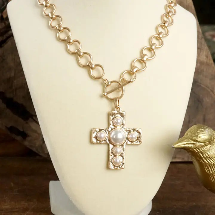A bold expression of faith with a vintage-inspired edge. This statement necklace features a worn gold-tone primitive cross pendant accented with acrylic turquoise or pearl cabochons for a subtle pop of color. A thick rings chain adds presence, while the front toggle closure brings both style and versatility. Finished with a lobster claw clasp at the back for a secure, comfortable fit.