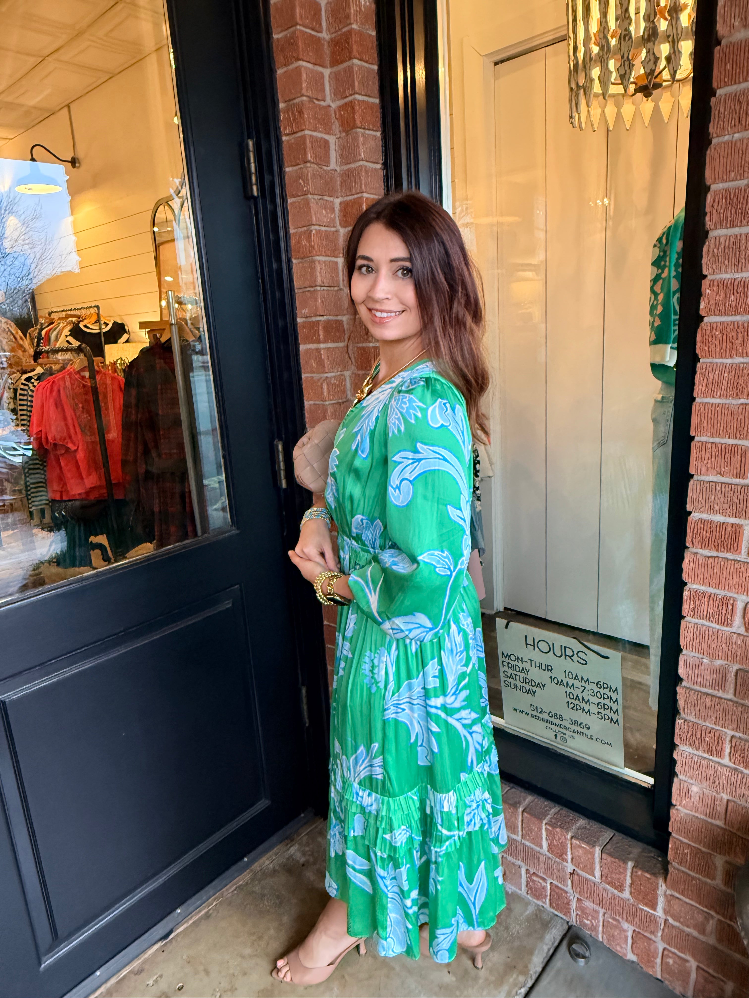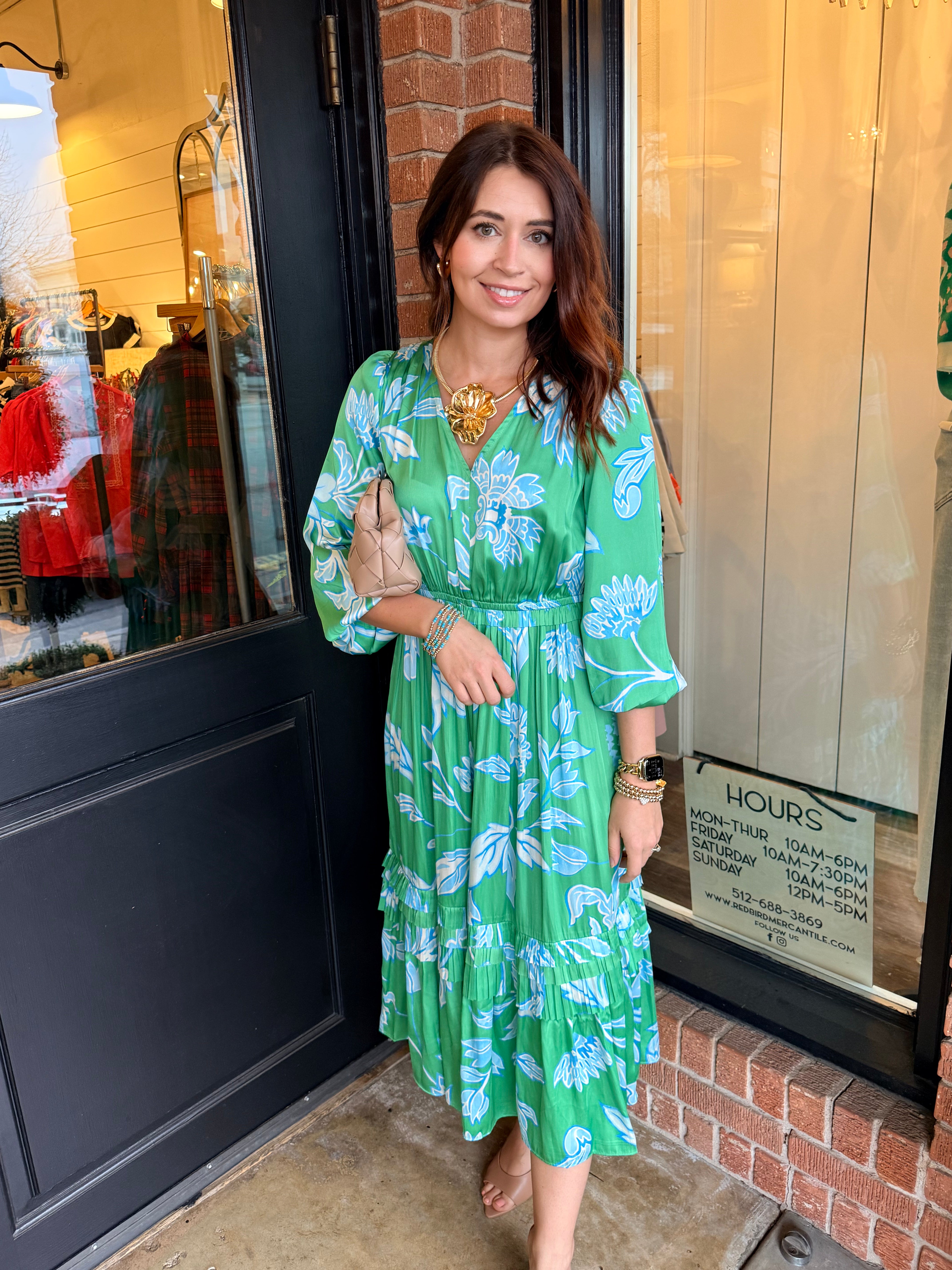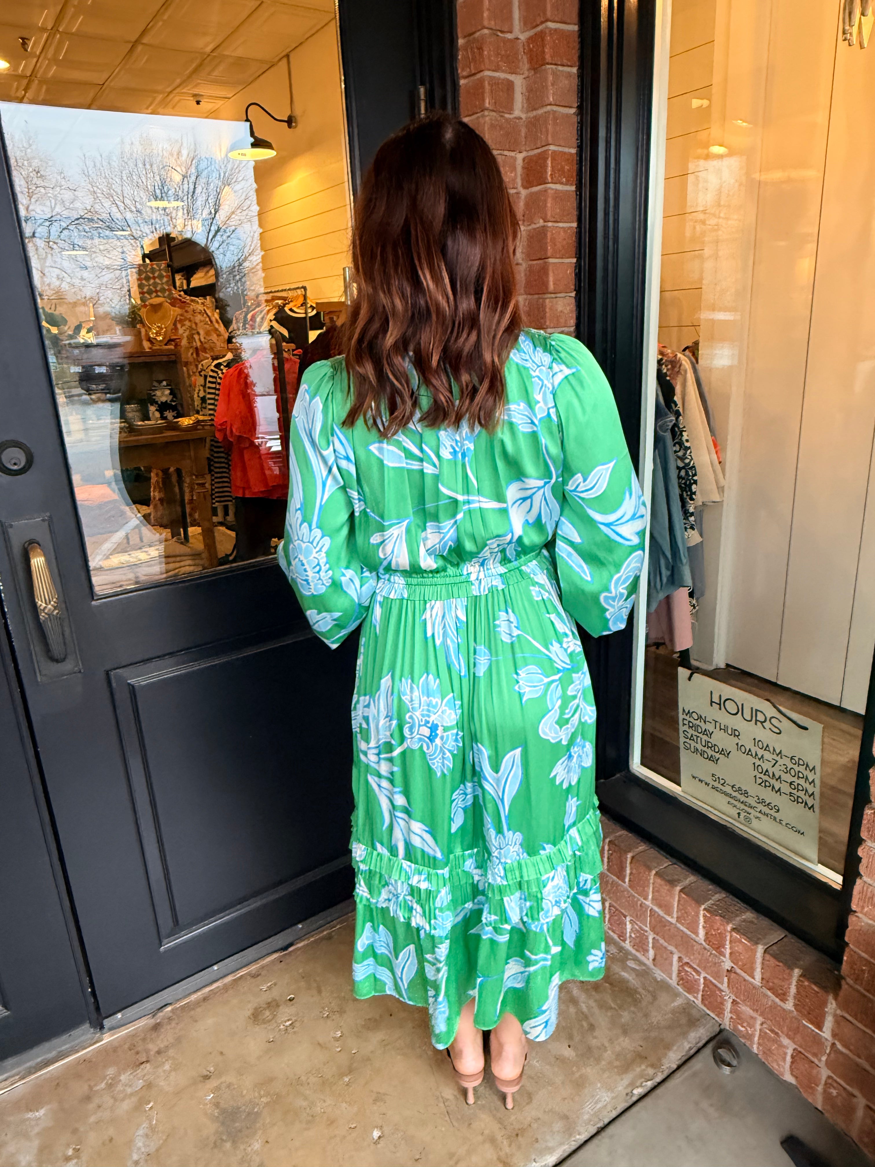 The 3/4 balloon sleeves with elastic cuffs add graceful volume, while the tiered ruffle skirt creates beautiful movement with every step. Finished in a classic midi length, Daphne is perfect for brunch, church, showers, or dressing up for dinner.