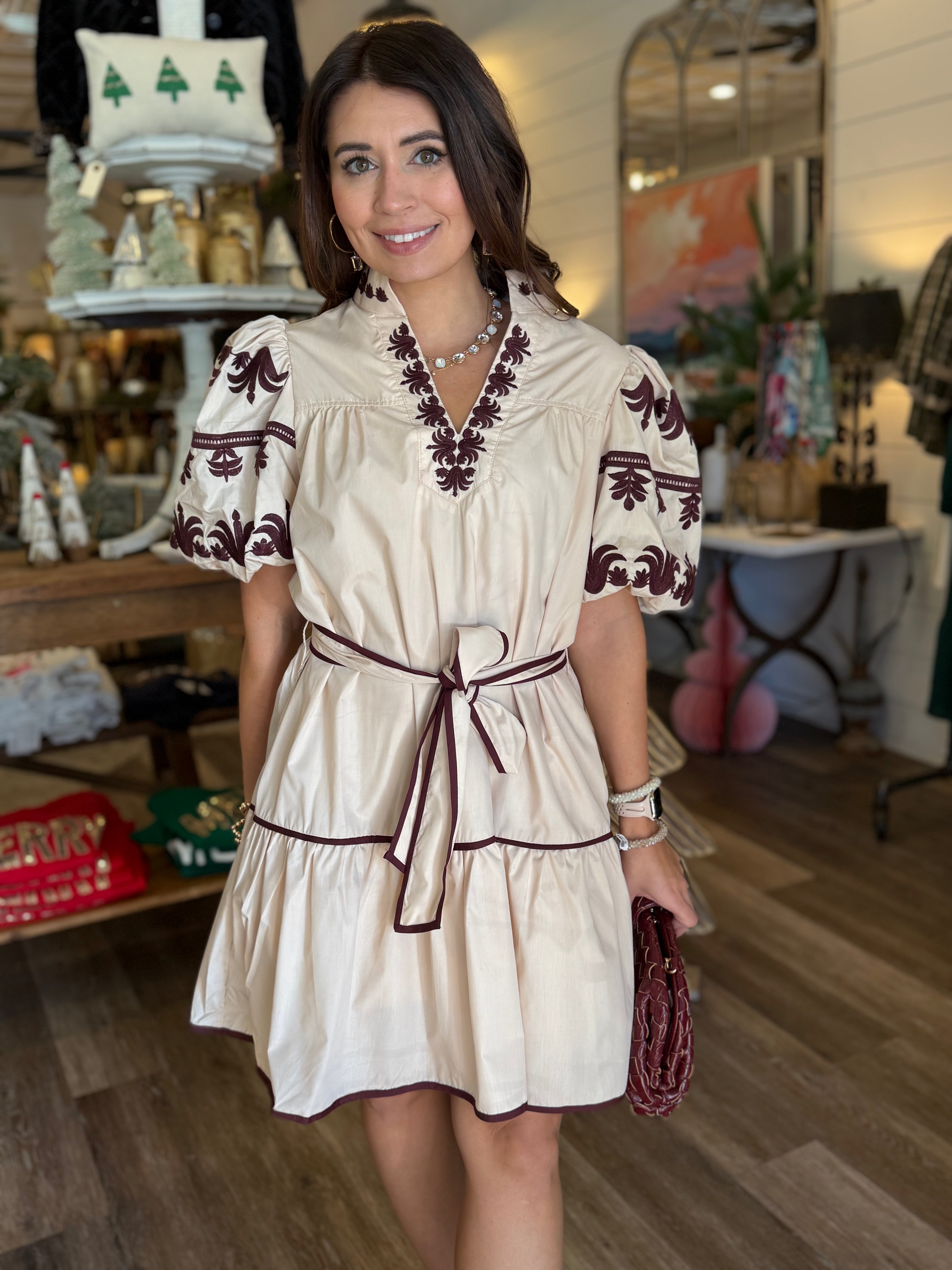 Step into effortless charm with the Darcie Embroidered Mini Dress. This playful mini dress features delicate embroidery throughout, puff sleeves, and a flattering belt waist to cinch and define your silhouette. Fully lined for comfort and coverage, it drapes beautifully while remaining lightweight and soft. Perfect for brunches, date nights, or casual outings, this dress is a versatile wardrobe staple.