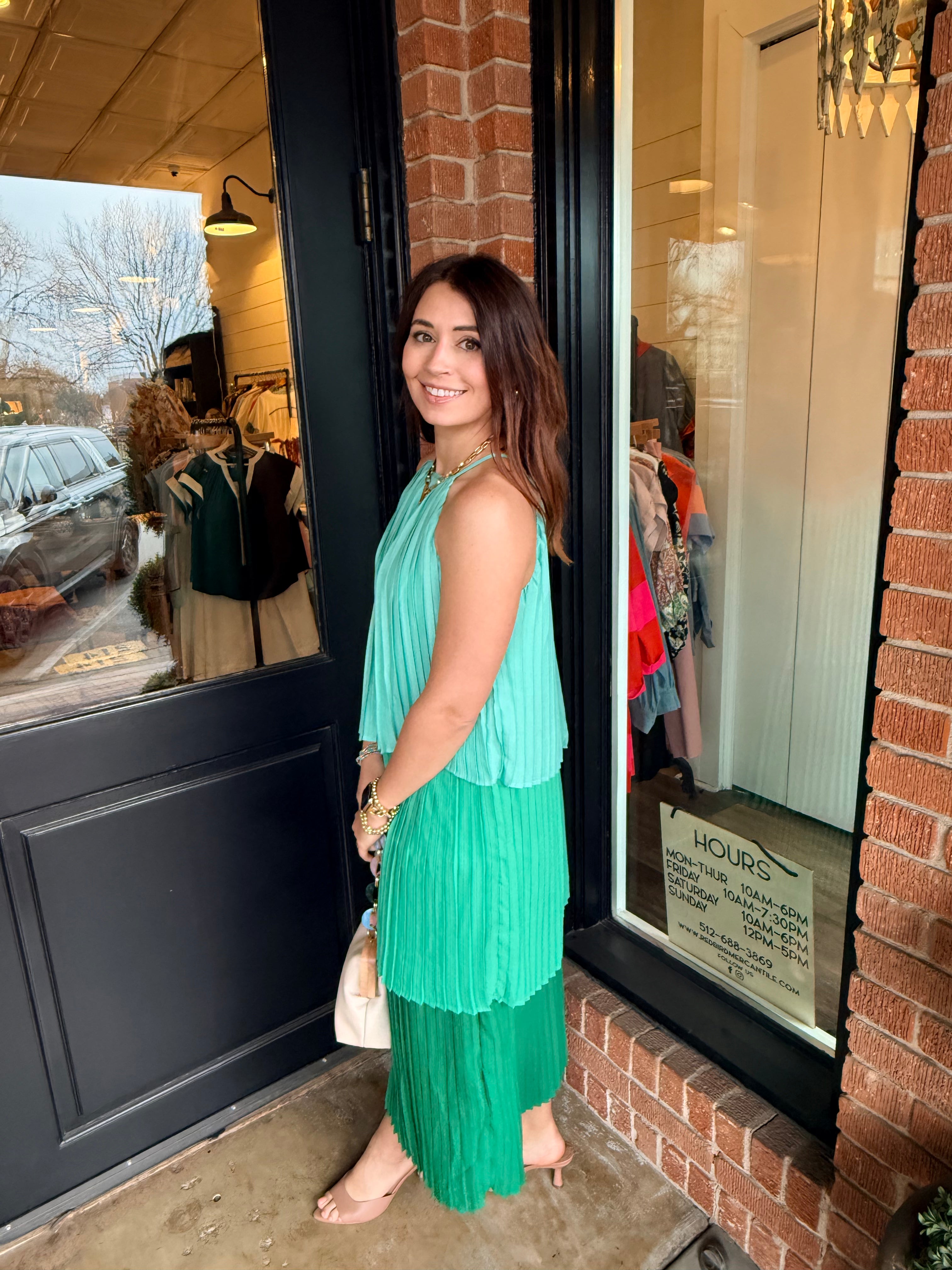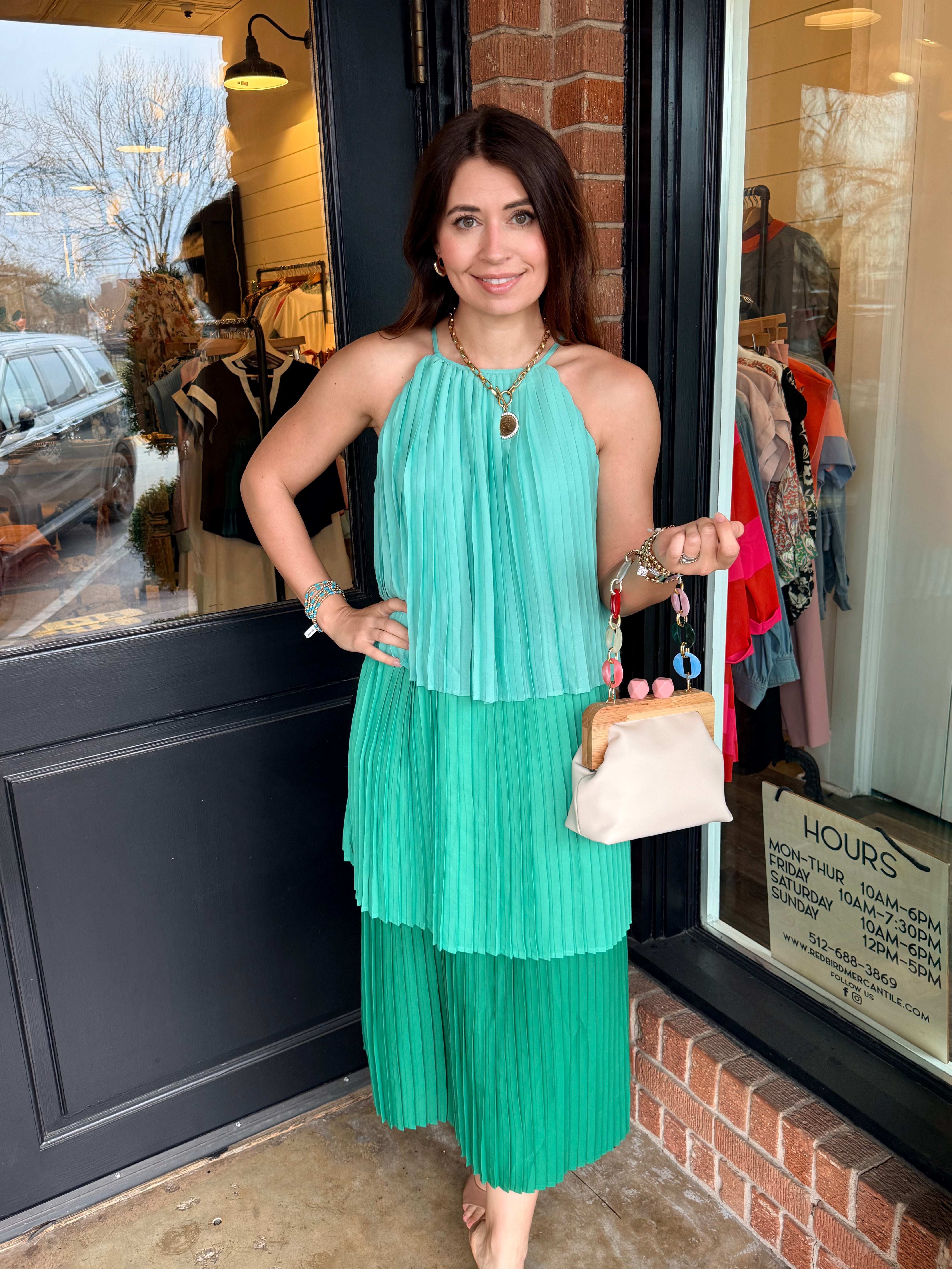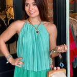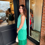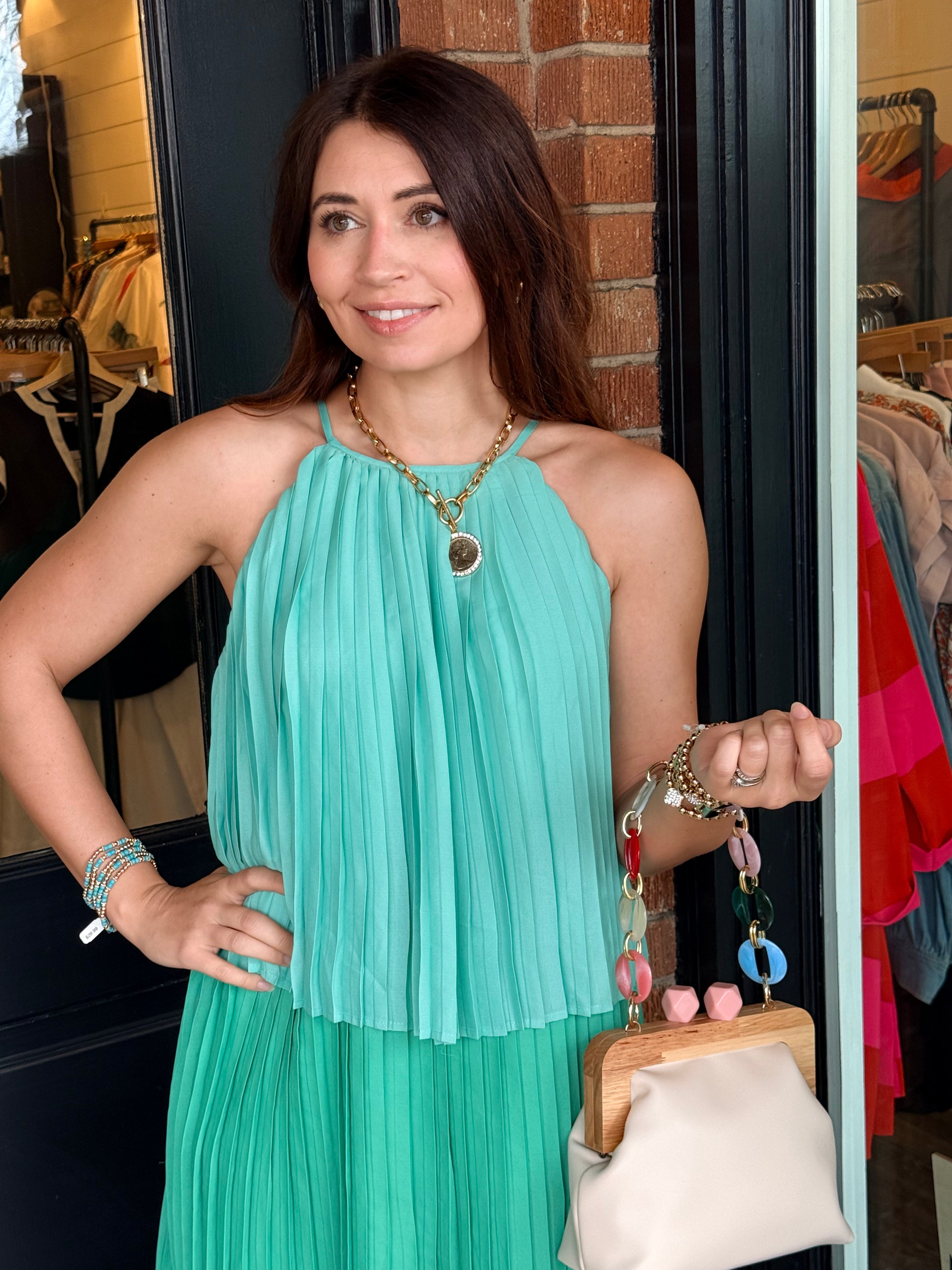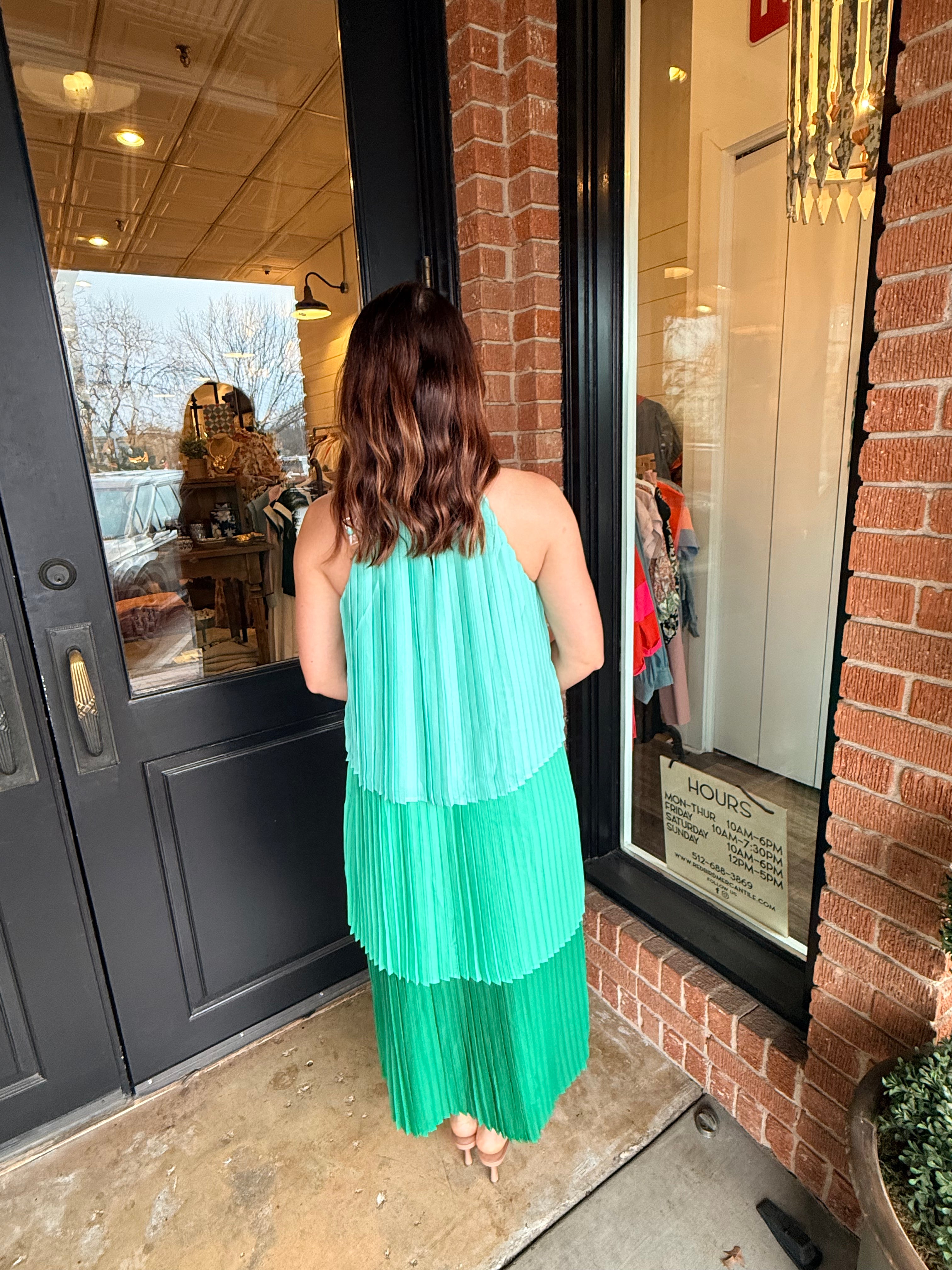 Elegant and effortless, the Dedra Pleated Tiered Midi Dress is designed with a flowing silhouette that moves beautifully with every step. Featuring soft pleating, a tiered skirt, and a sleeveless cut, this midi is finished with a back button neck closure for a clean, refined look. Fully lined for comfort, it’s an easy choice for everything from daytime events to dressier occasions.