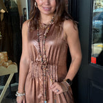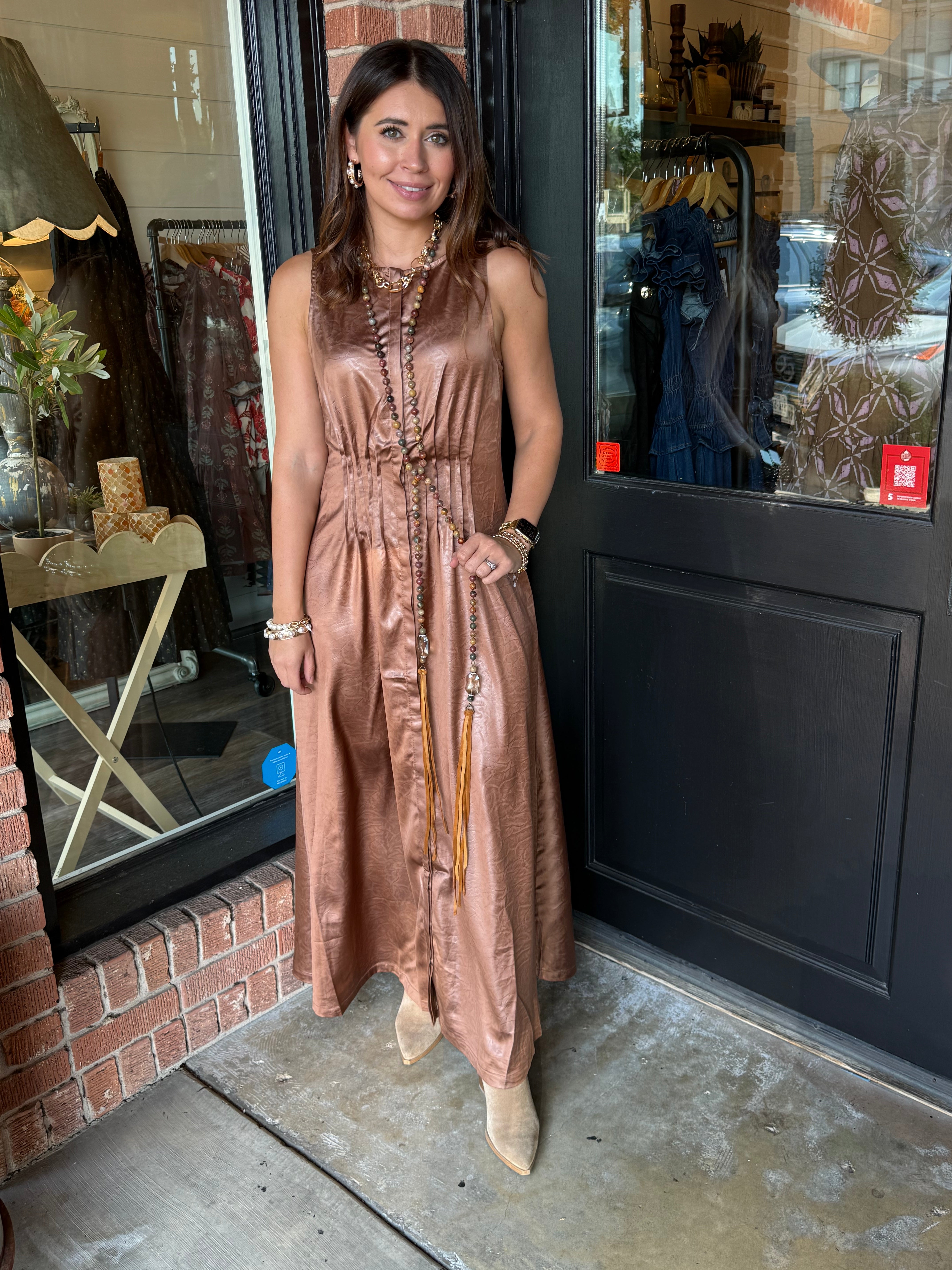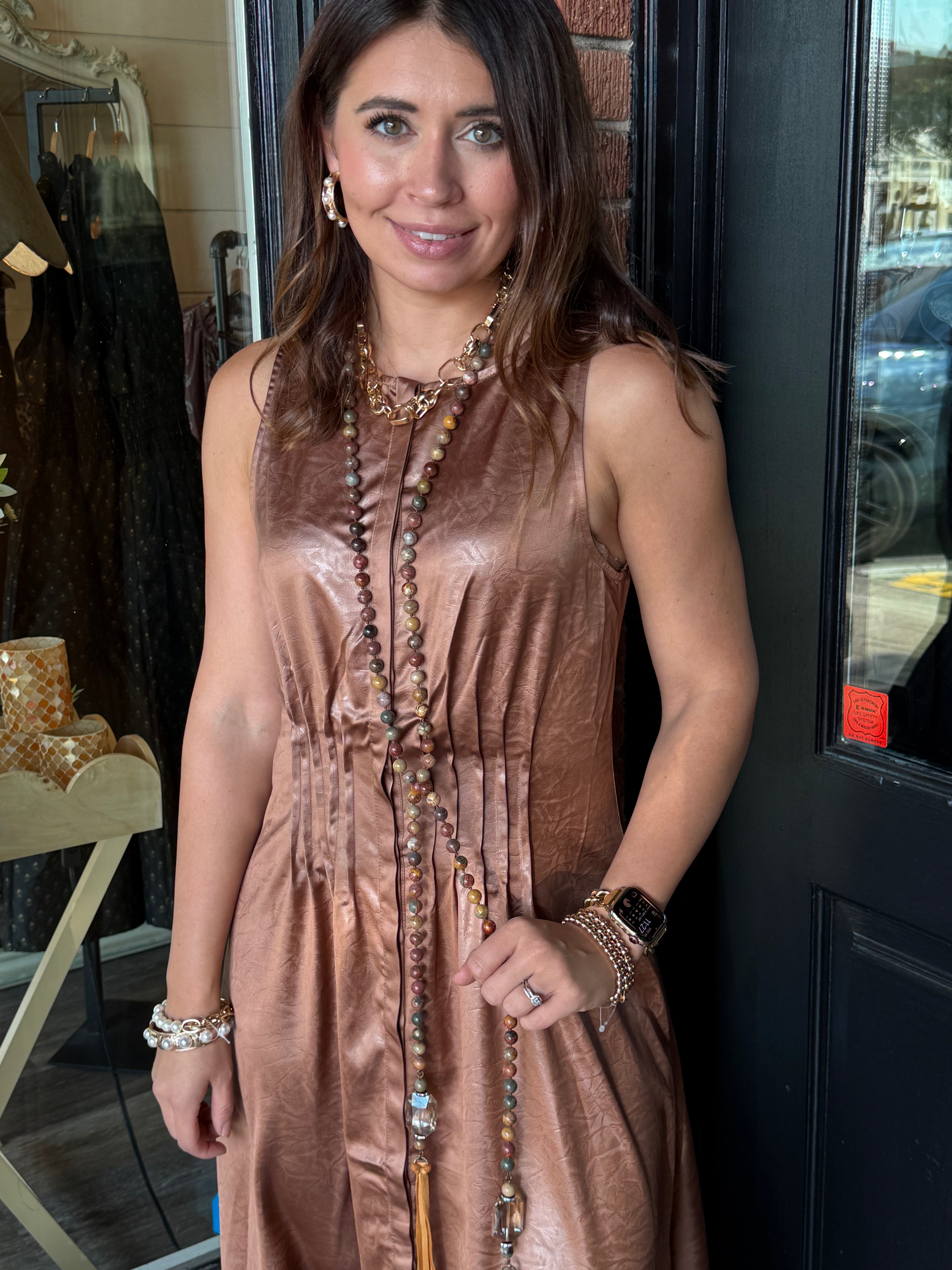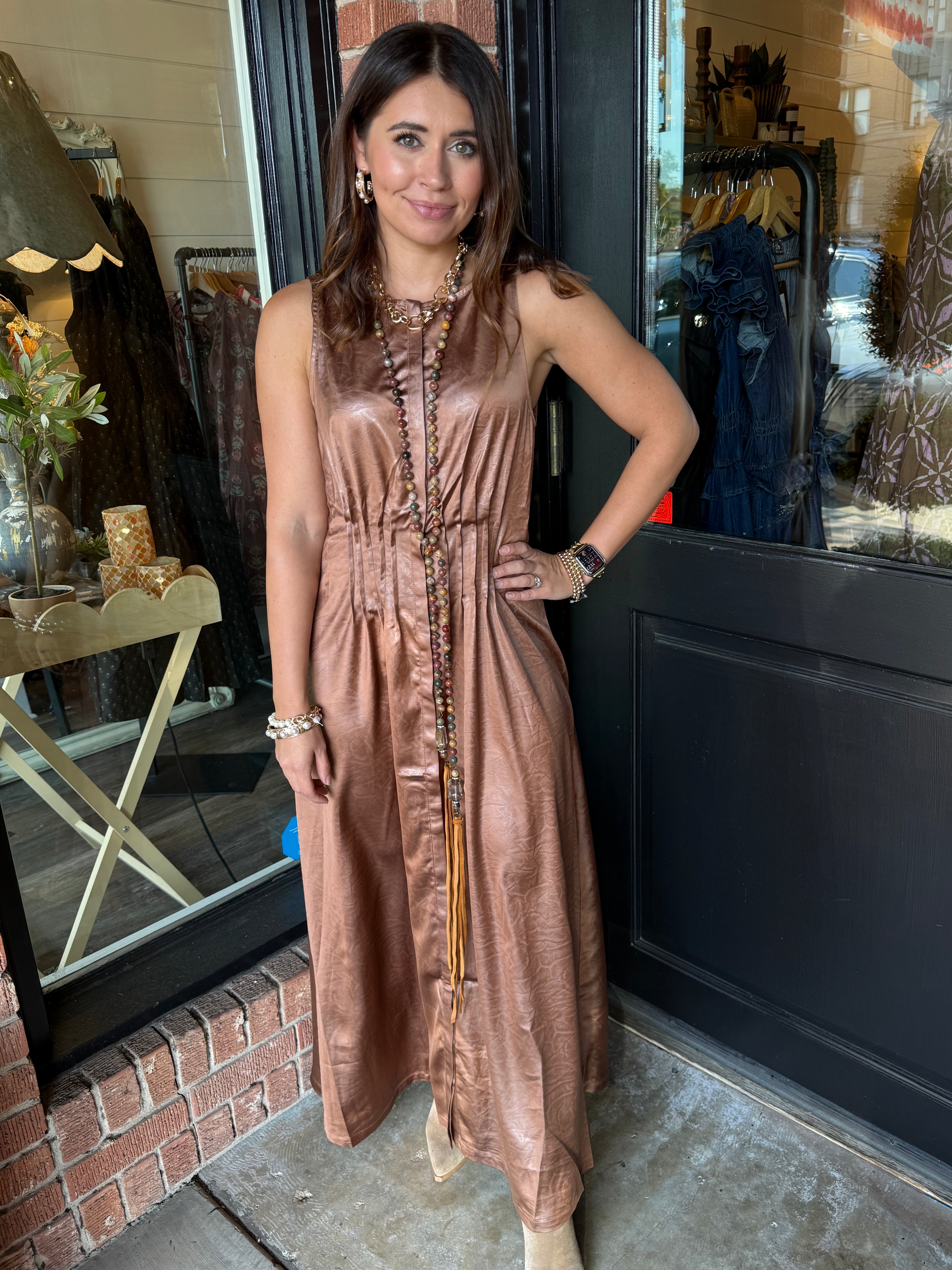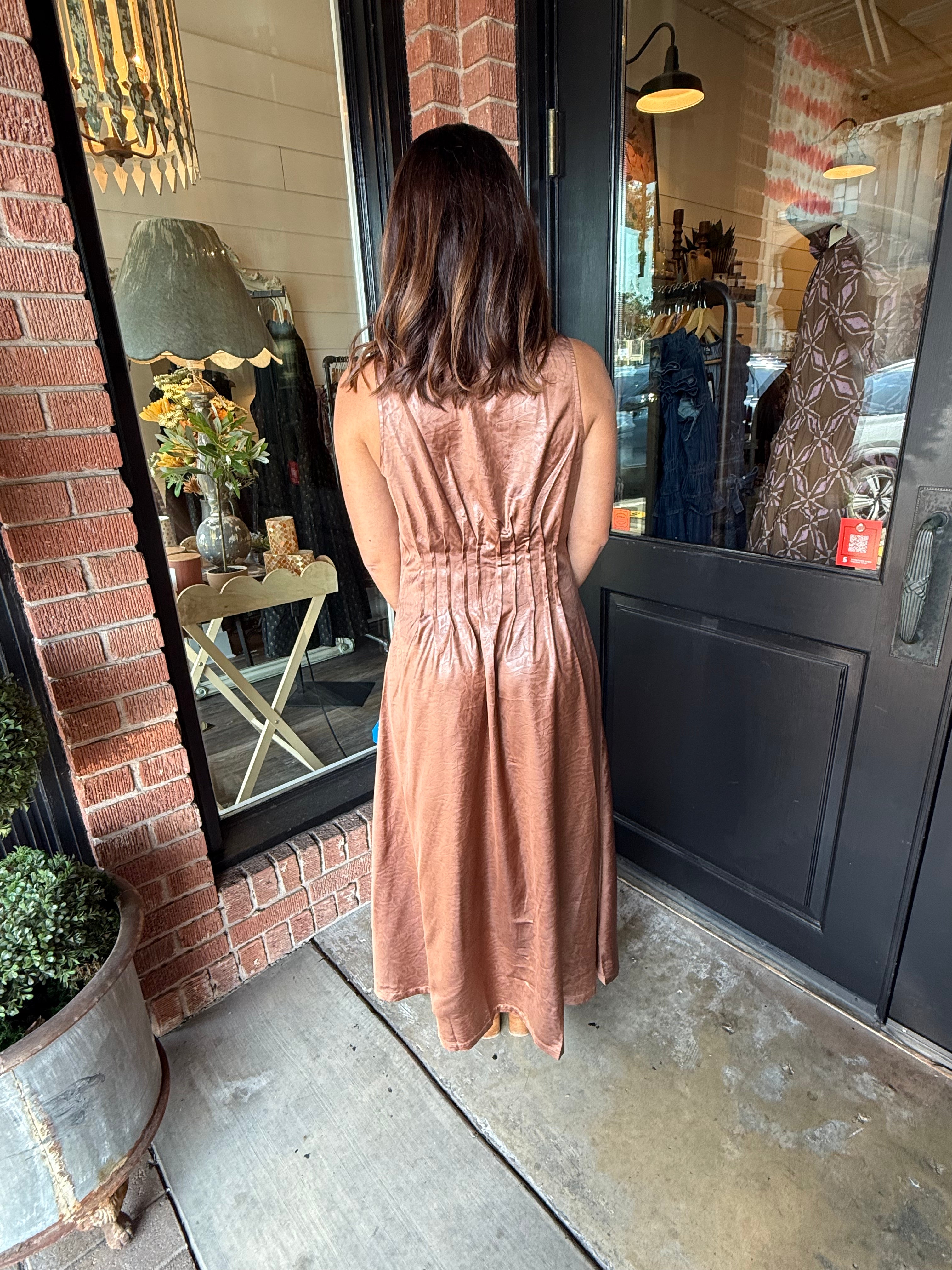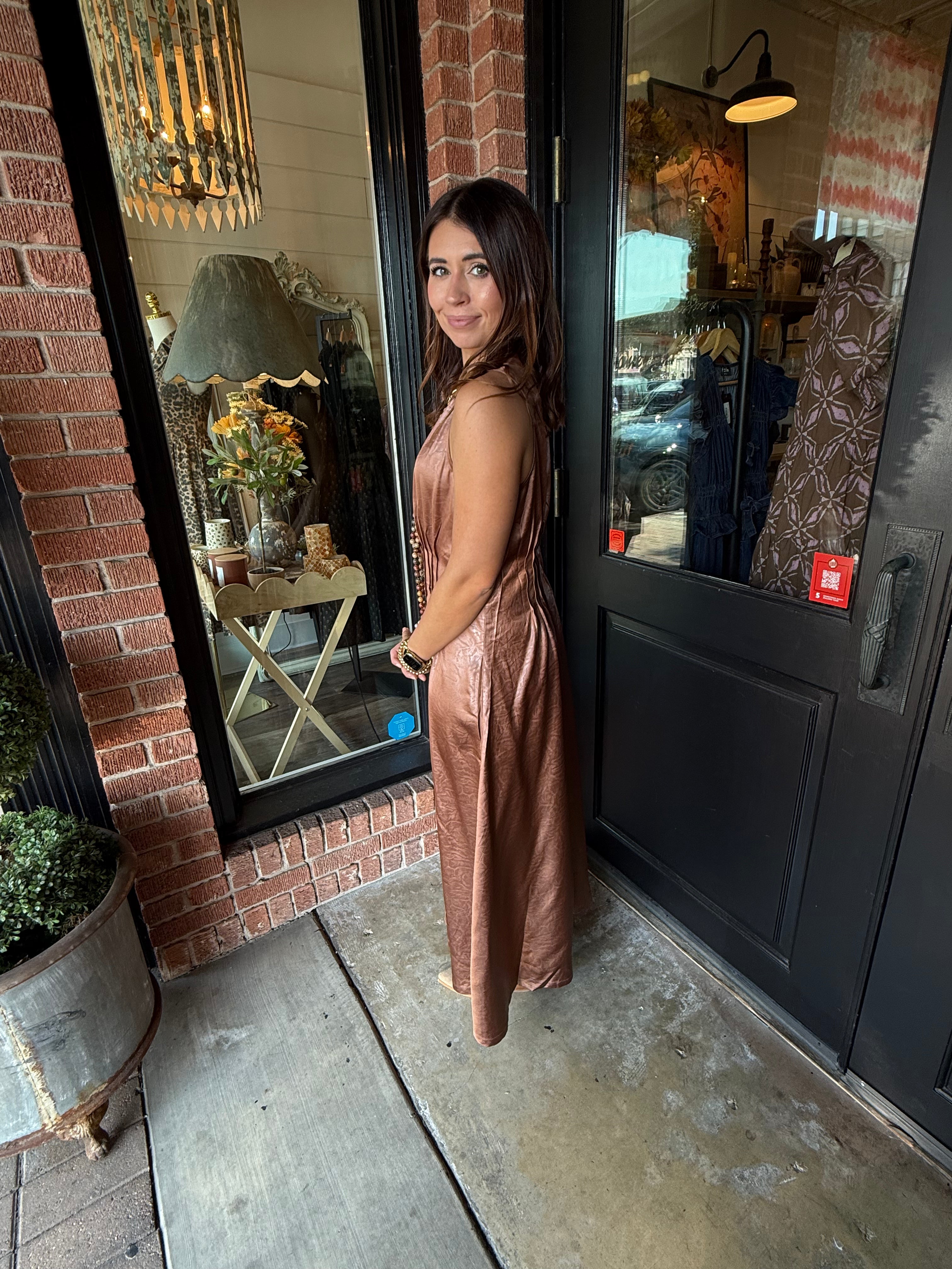 Turn heads in the Delaney Maxi Dress. This sleeveless, pleated silhouette flows beautifully with every step, creating a graceful and elongating effect. Crafted from lightweight woven polyester, it’s perfect for brunches, special occasions, or effortless everyday style.