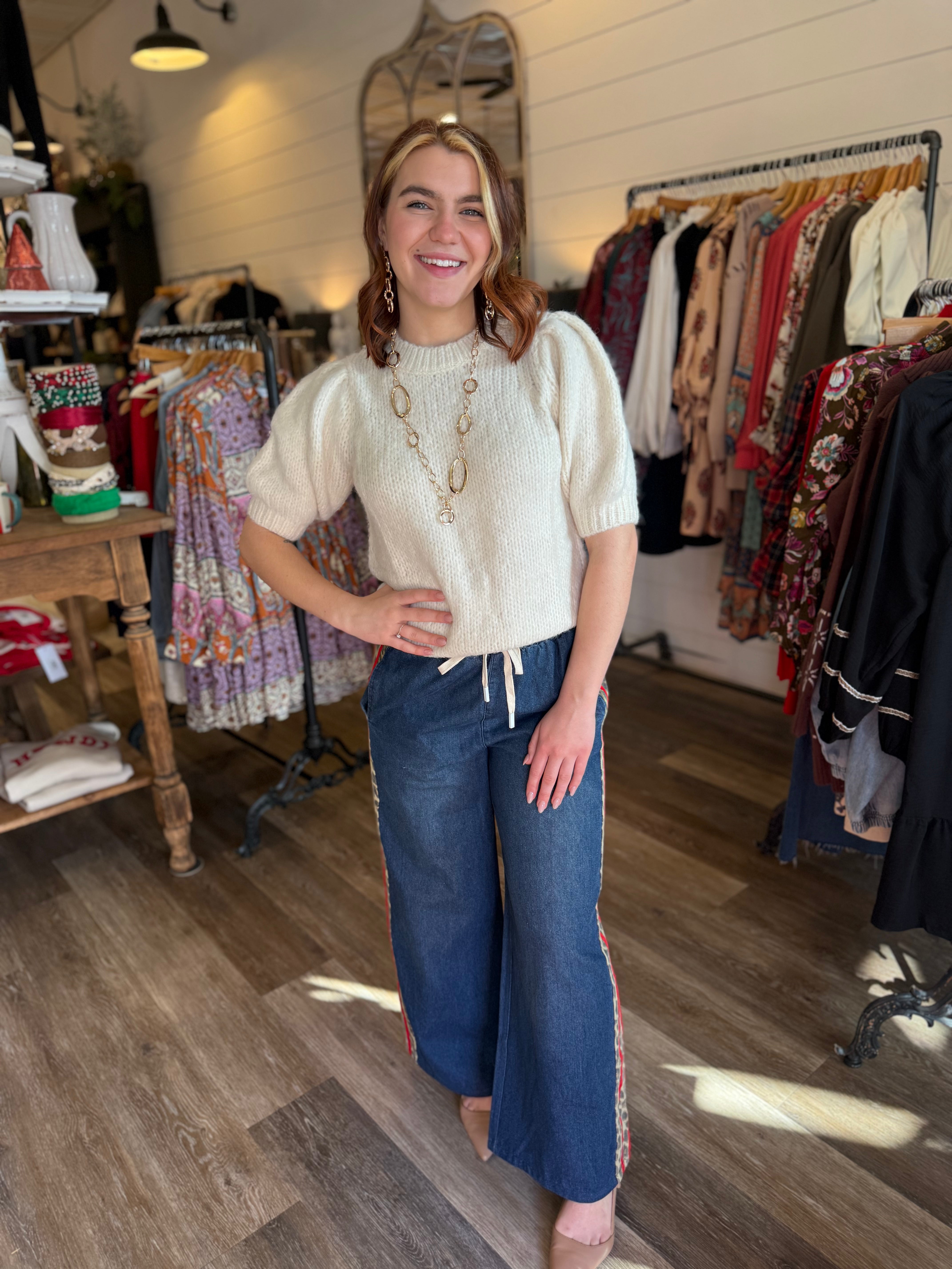 Casual comfort meets bold style in the Delaney Denim Pants — the perfect statement denim for everyday wear. Designed with a relaxed wide leg and an easy drawstring waist, these jeans offer an effortless, laid-back fit you’ll reach for again and again.