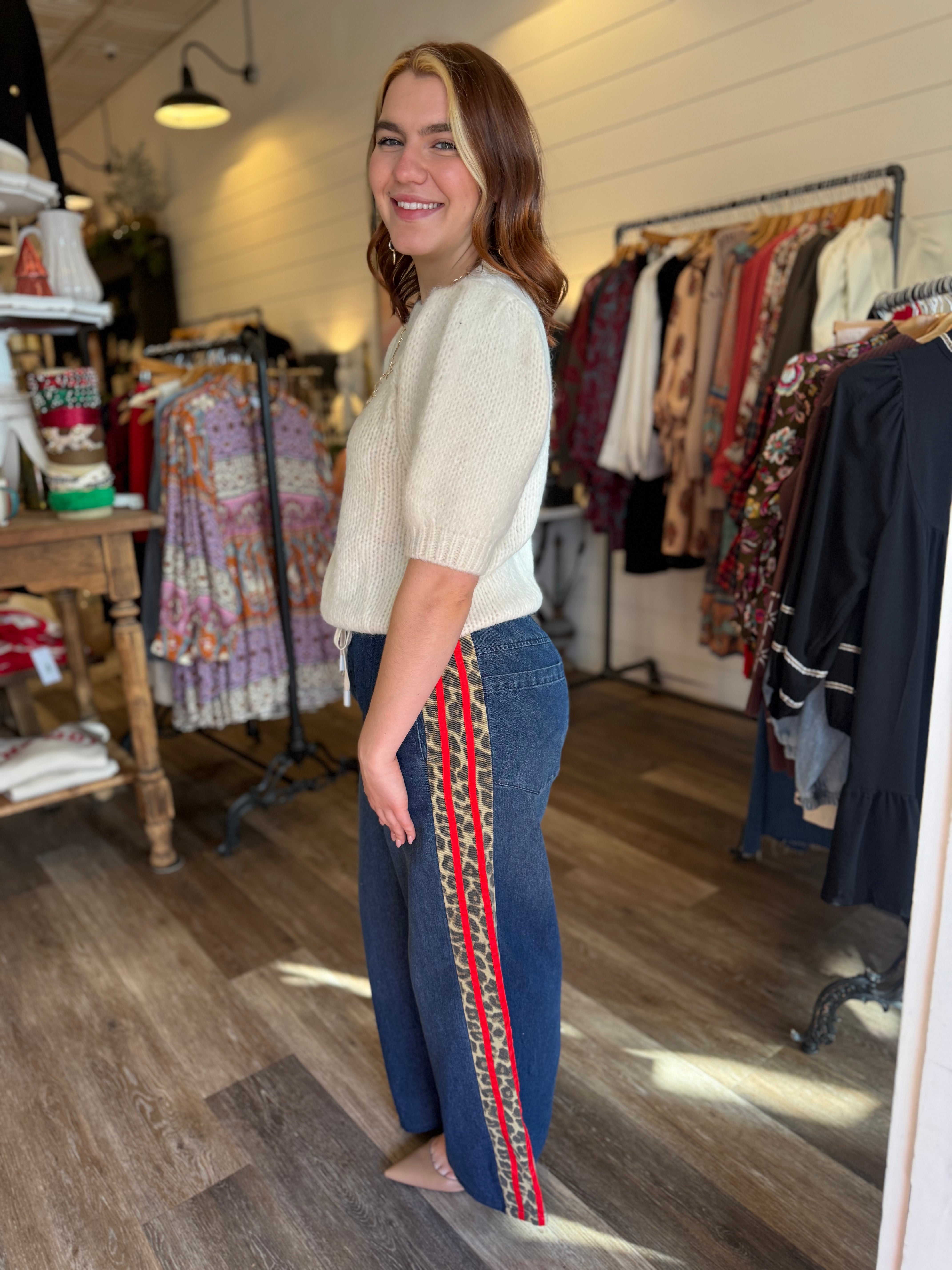 Running down each leg is a striking leopard contrast accent framed with vibrant red striping, giving these pants a fun, fashion-forward edge. Finished with side pockets, they’re cute, comfy, and ready for anything from errands to weekend outings.
