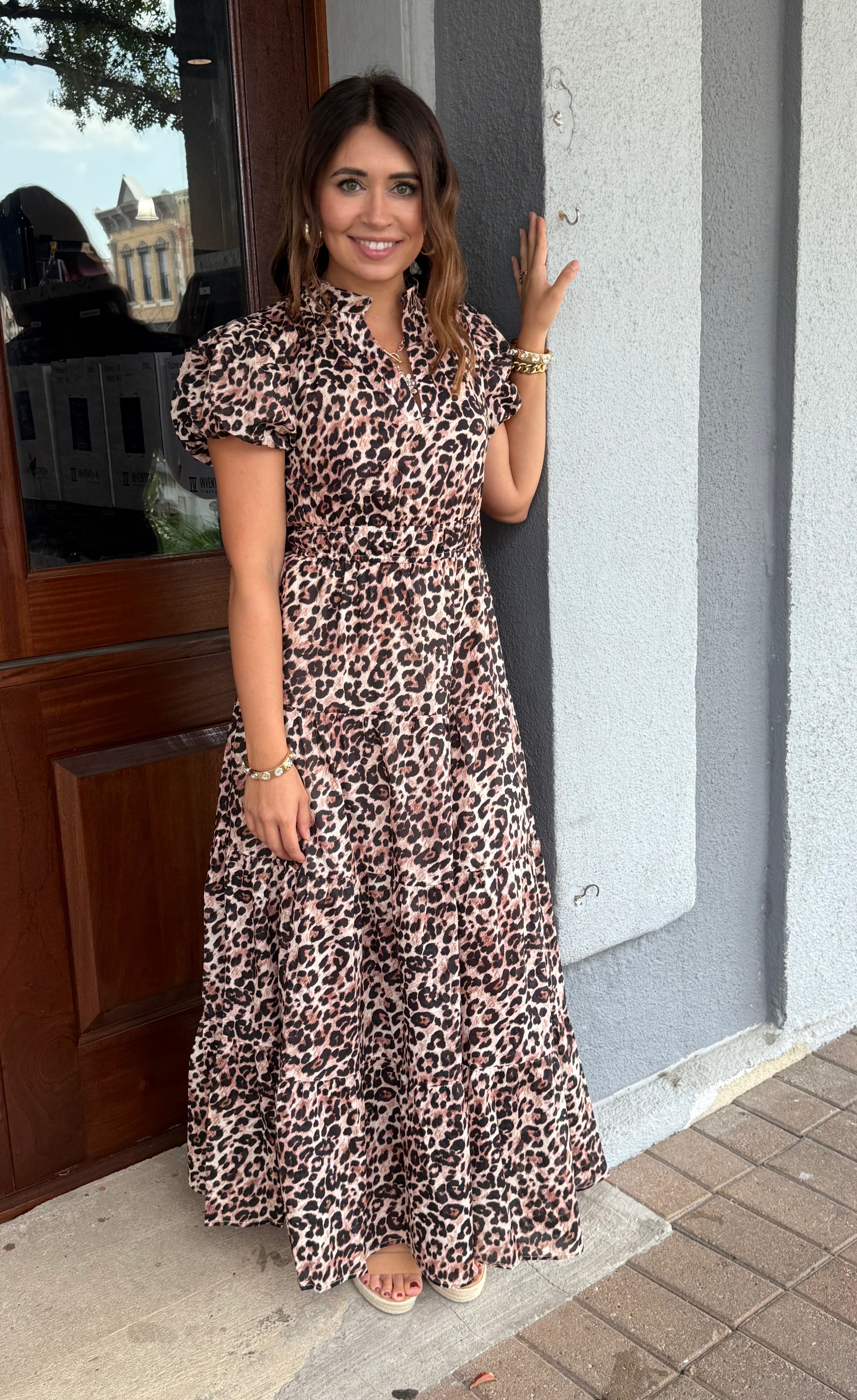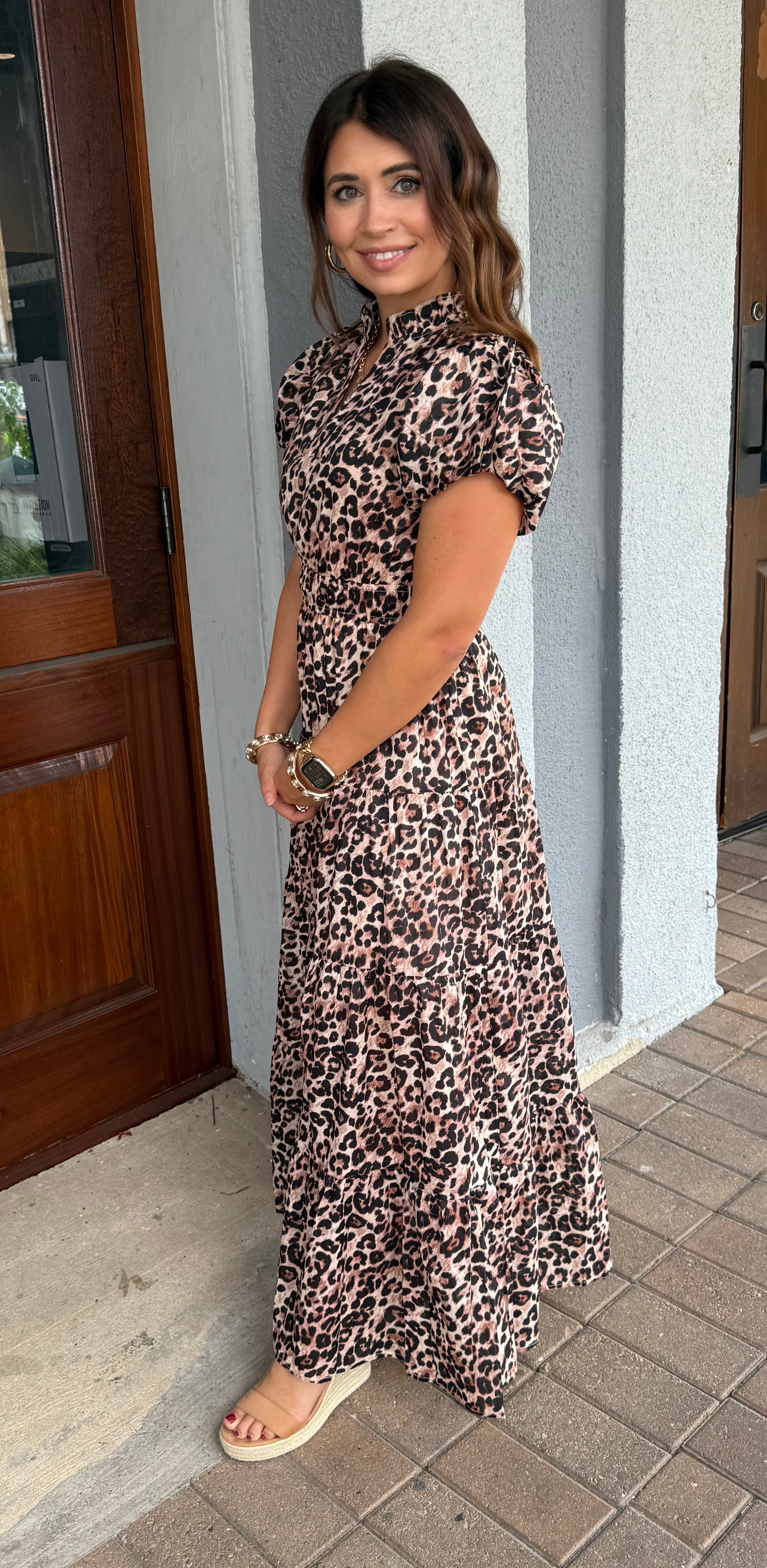 Fierce and feminine, the Dixie Animal Print Dress is a must-have statement piece. Featuring a bold animal print, this dress combines playful details with an easy, flattering fit. The split neckline with ruffle trim and puff sleeves add charm, while the elastic waist creates a comfortable, cinched silhouette. A tiered hem brings movement to the partially lined design, making it perfect for everything from casual outings to dinner dates.