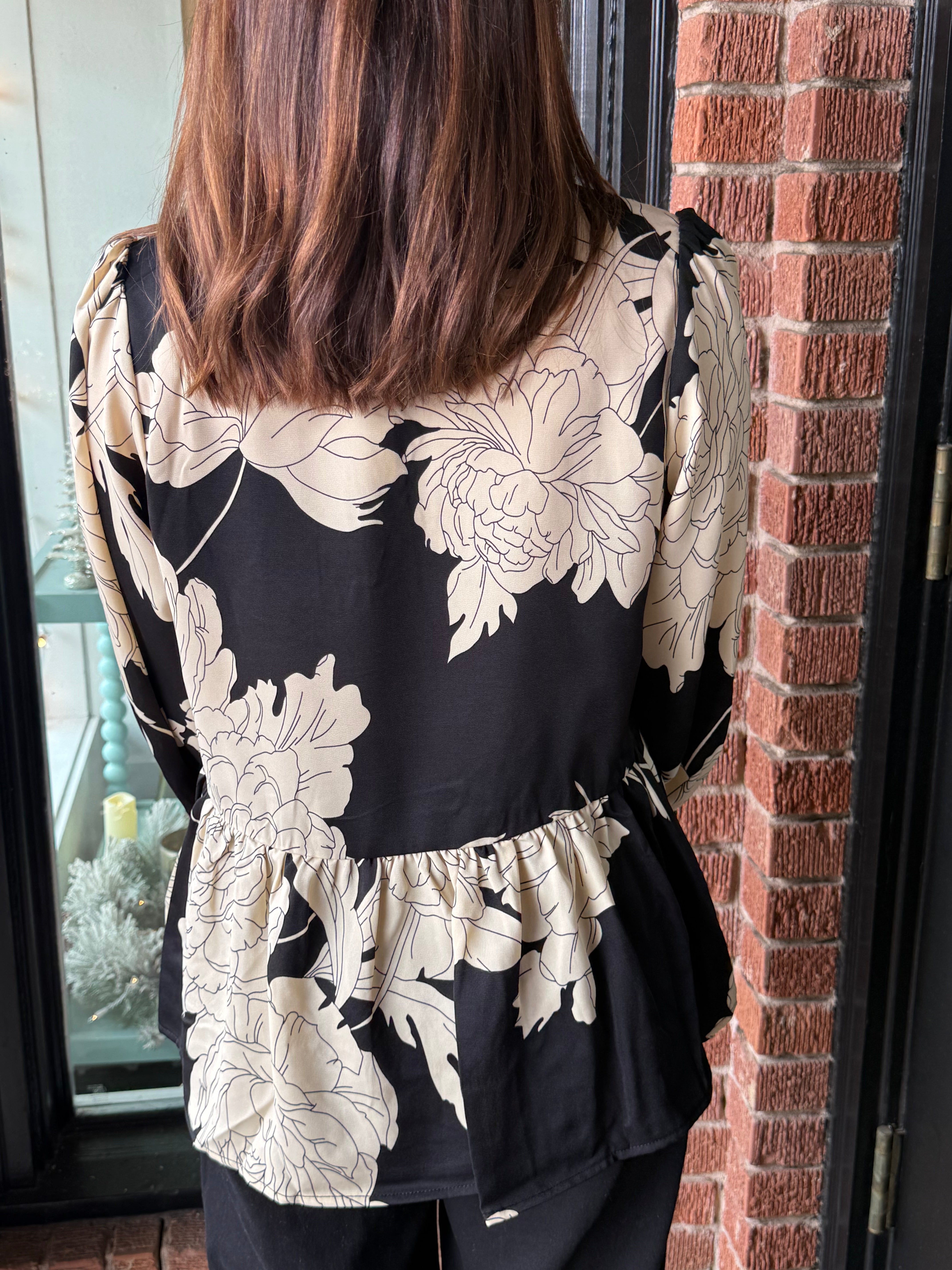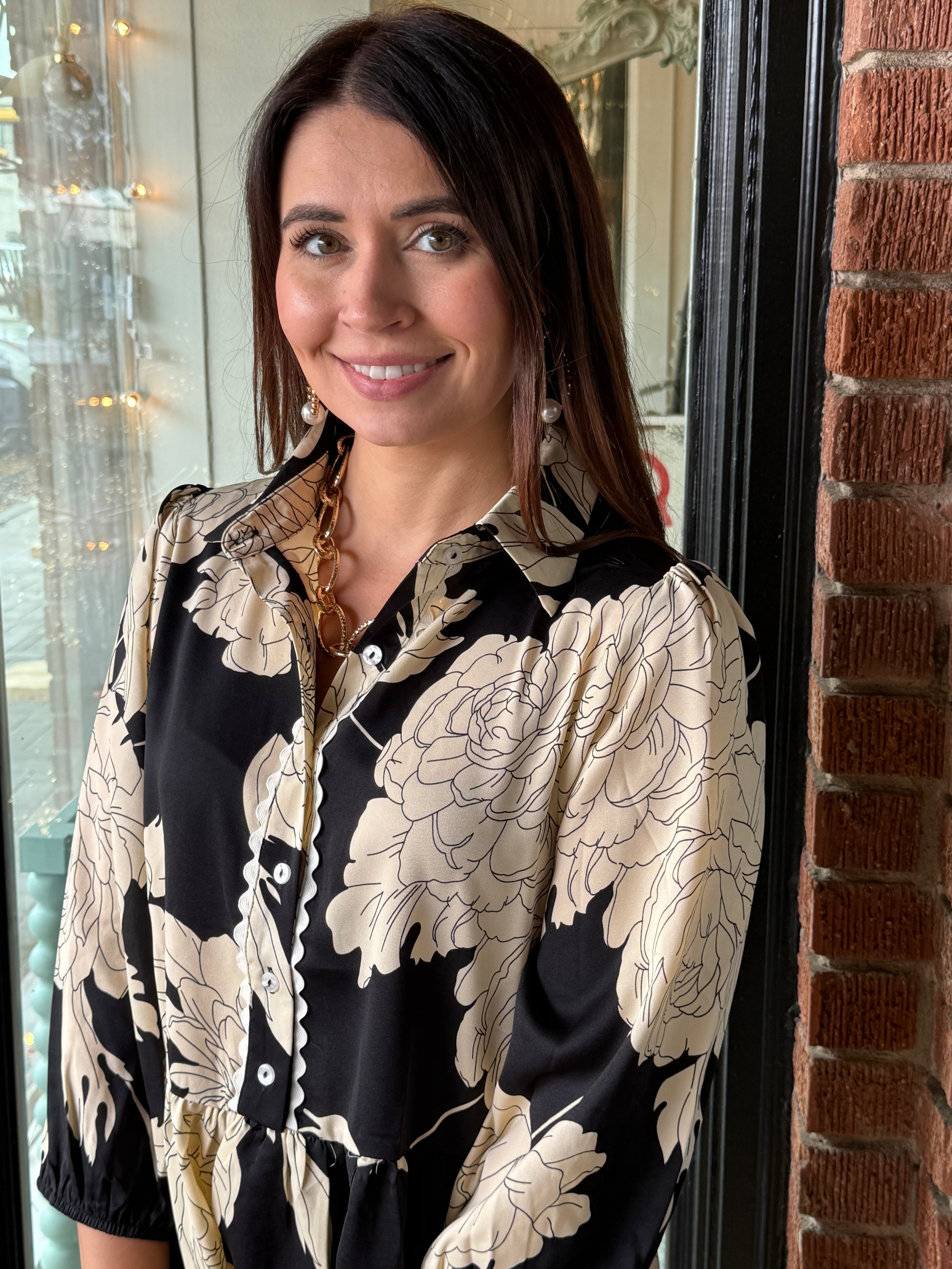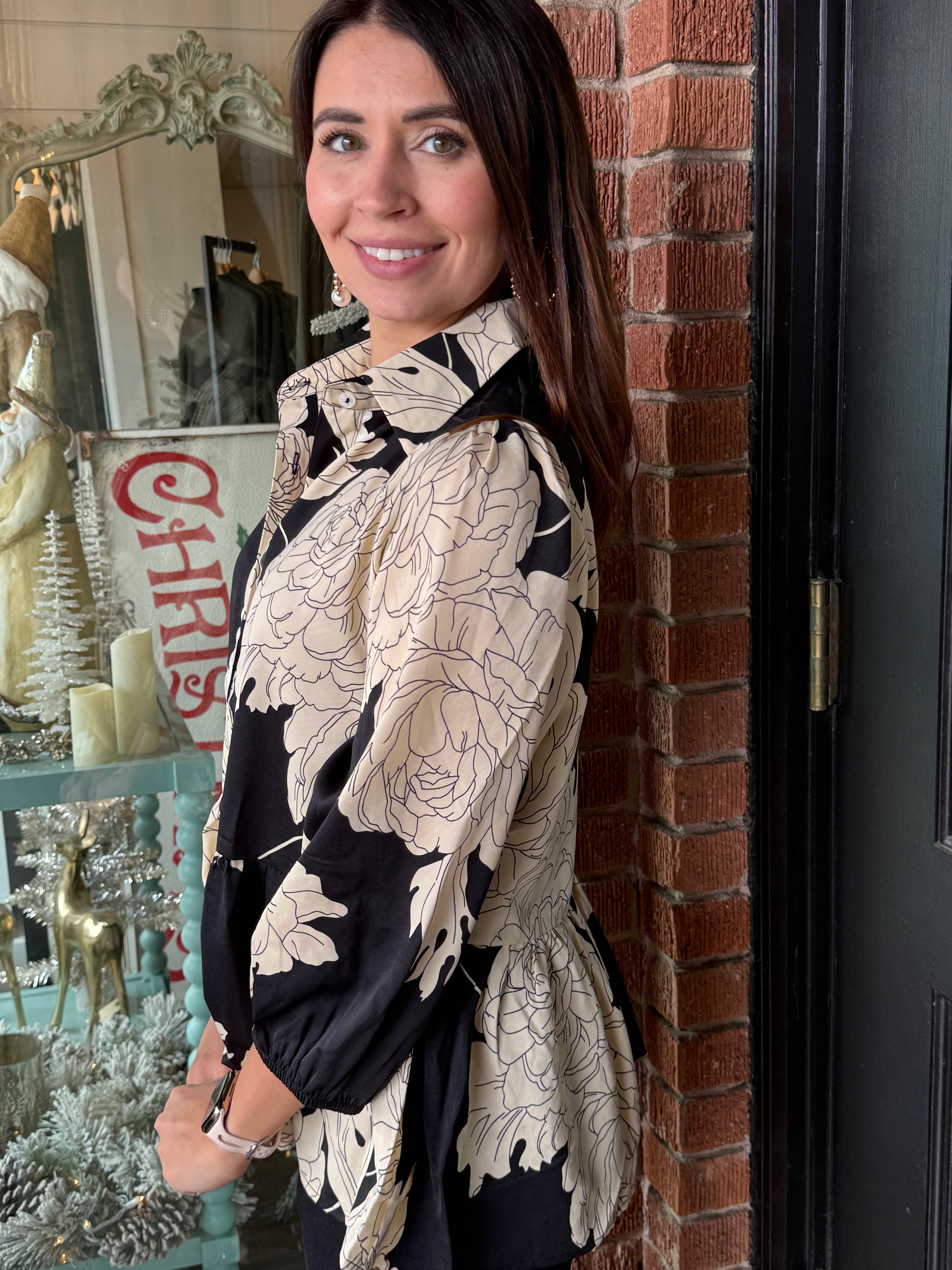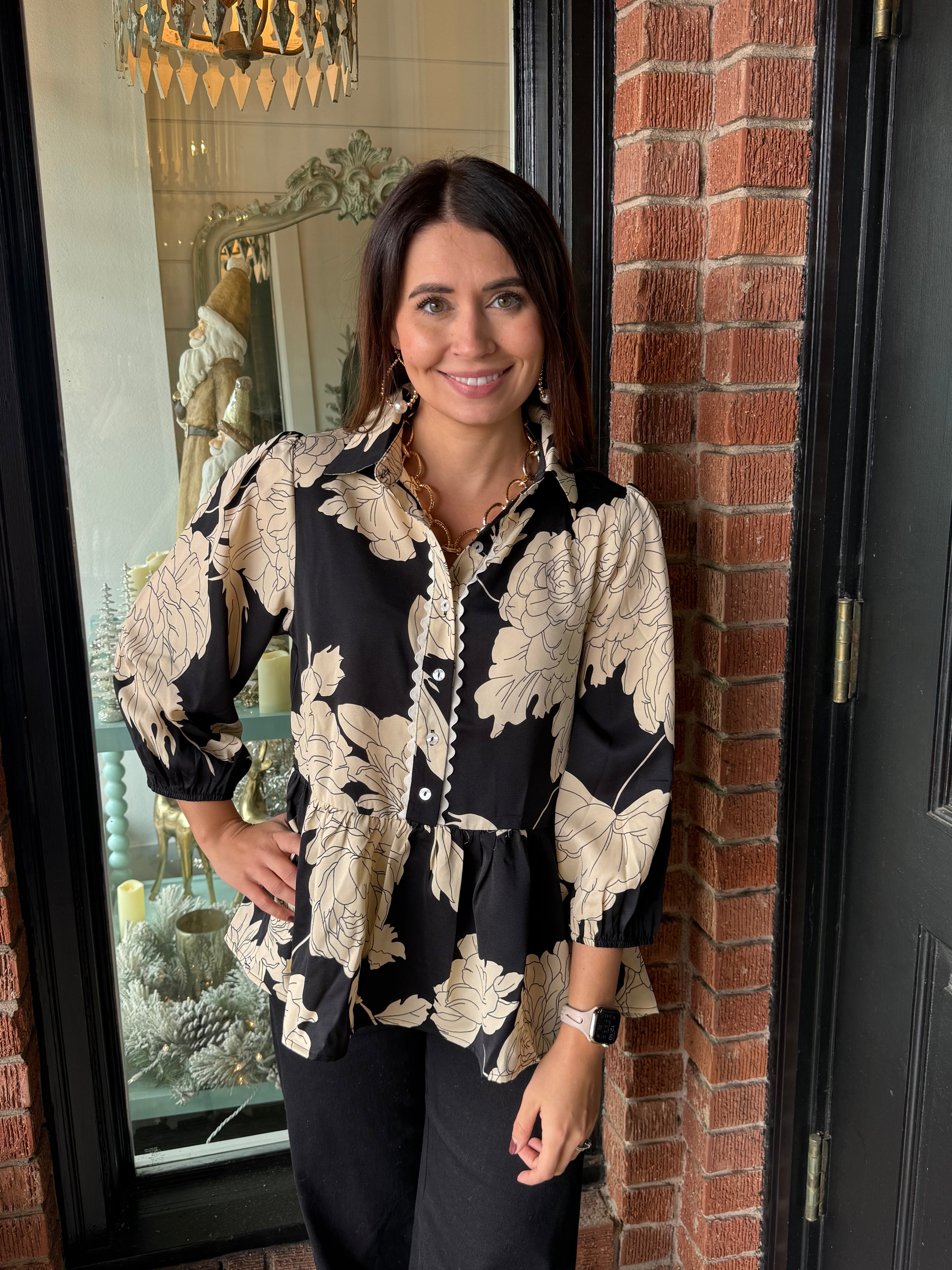 Soft, elegant, and beautifully detailed — the Elise Printed Button Down Top features a striking floral print paired with charming scalloped trim for a feminine finish. Designed with 3/4 sleeves, a classic collared neckline, and a relaxed peplum-style hem, this woven top drapes effortlessly for a flattering silhouette.