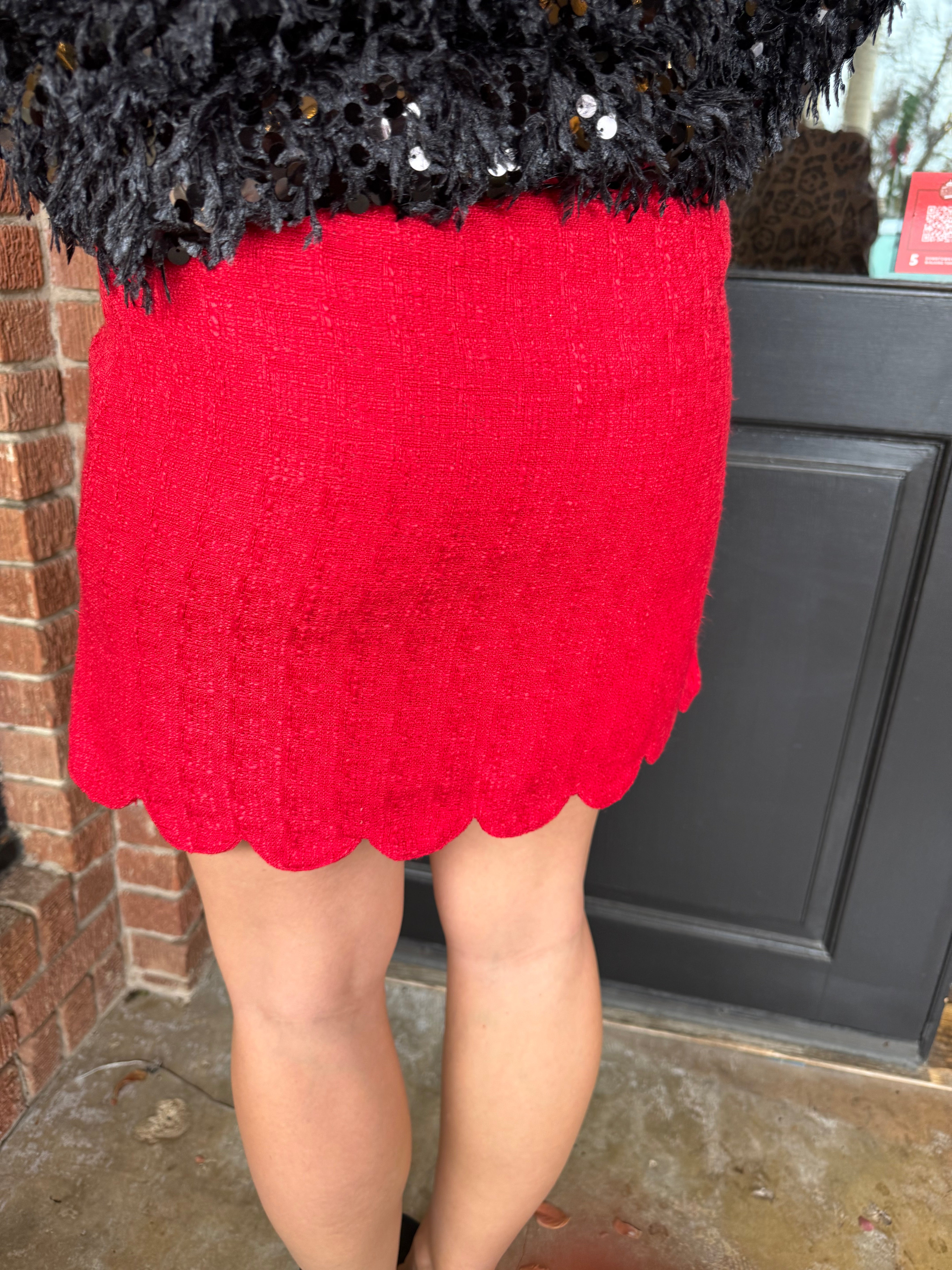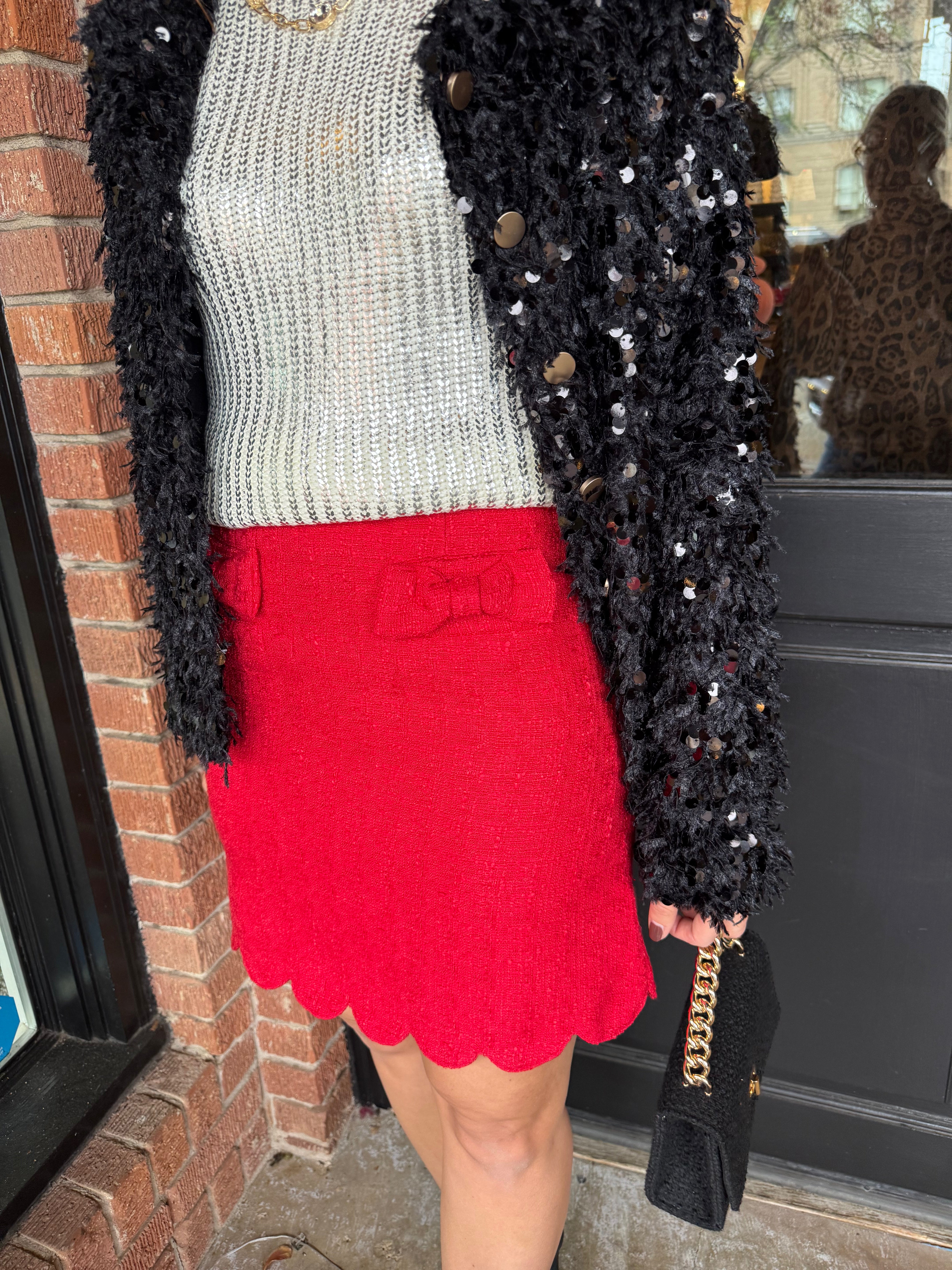 The Ella Skirt is a charming statement piece with classic texture and feminine detail. Designed in a timeless tweed fabric, this skirt features delicate bow trim accents and scalloped edge detailing for a polished, elevated look. Perfect for holiday events, dinners, and dressed-up days, it pairs beautifully with sweaters, blouses, or the matching tweed jacket if you’re styling it as a set.