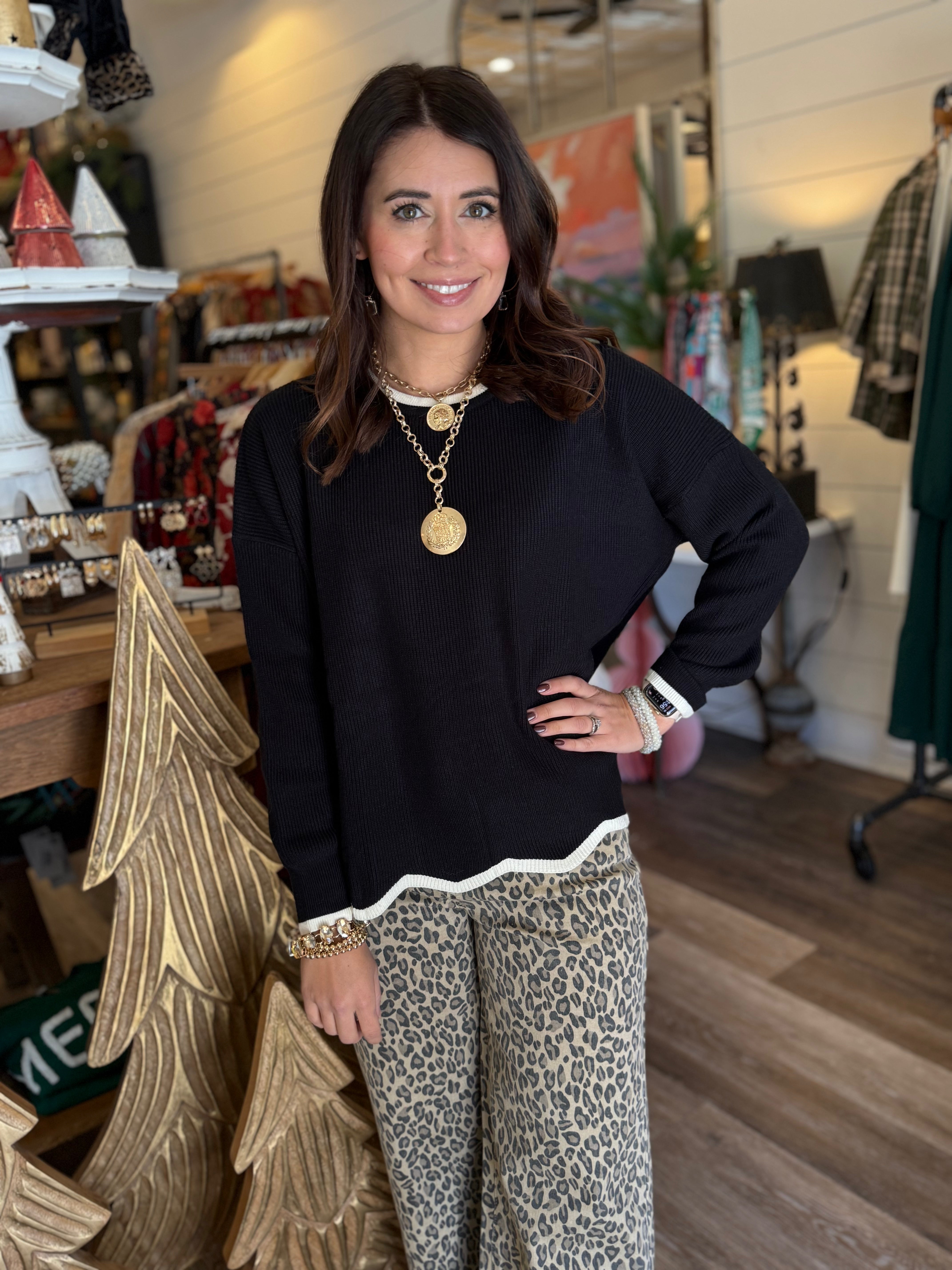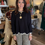 Soft, stylish, and full of playful detail—the Ellie Knit Sweater features a contrasting hem in wavy, sculpted lines that give this cozy knit a unique, elevated finish. Easy to wear and beautifully textured, it’s the perfect everyday sweater with a touch of flair.
