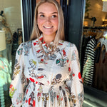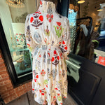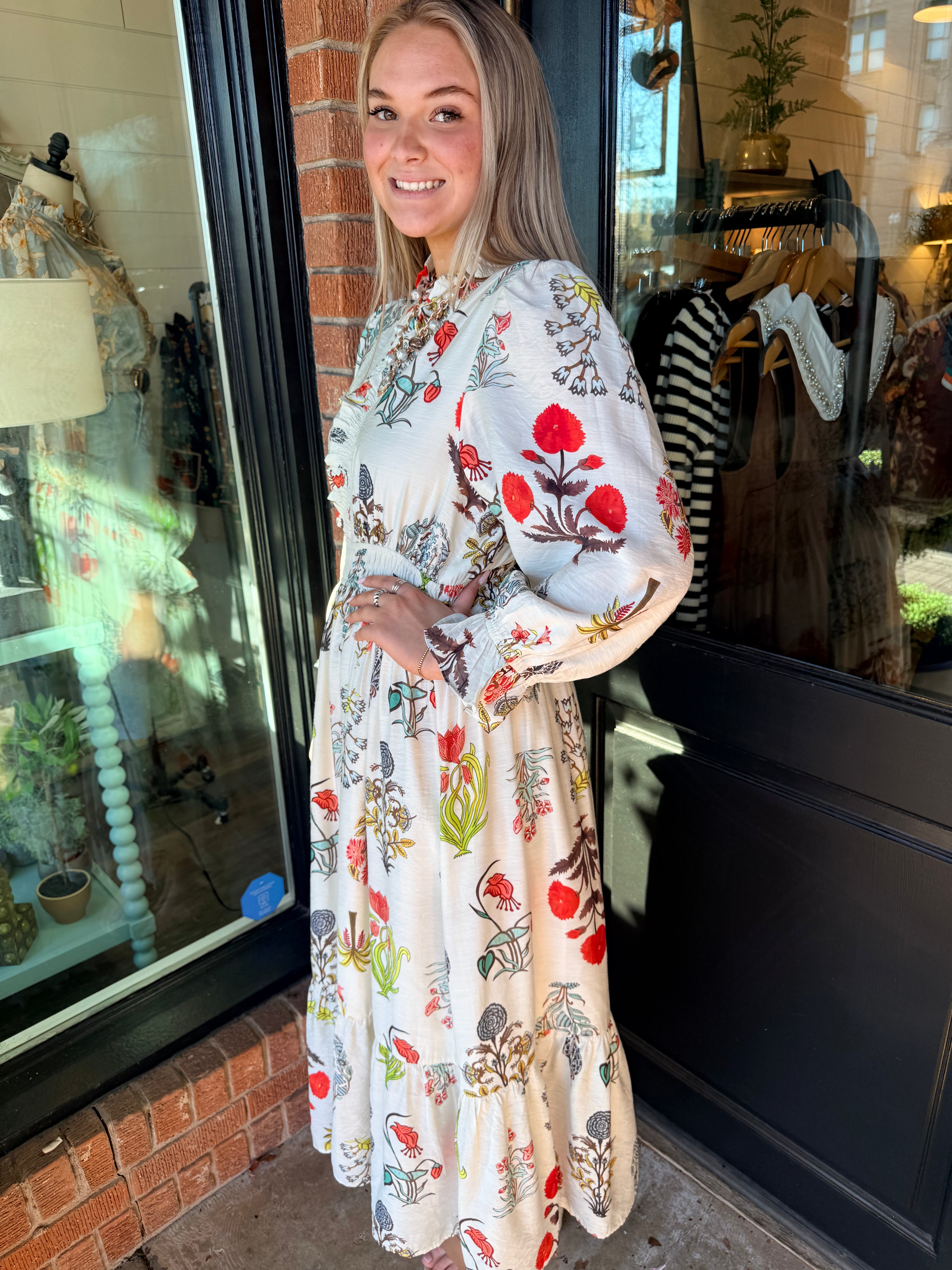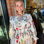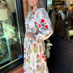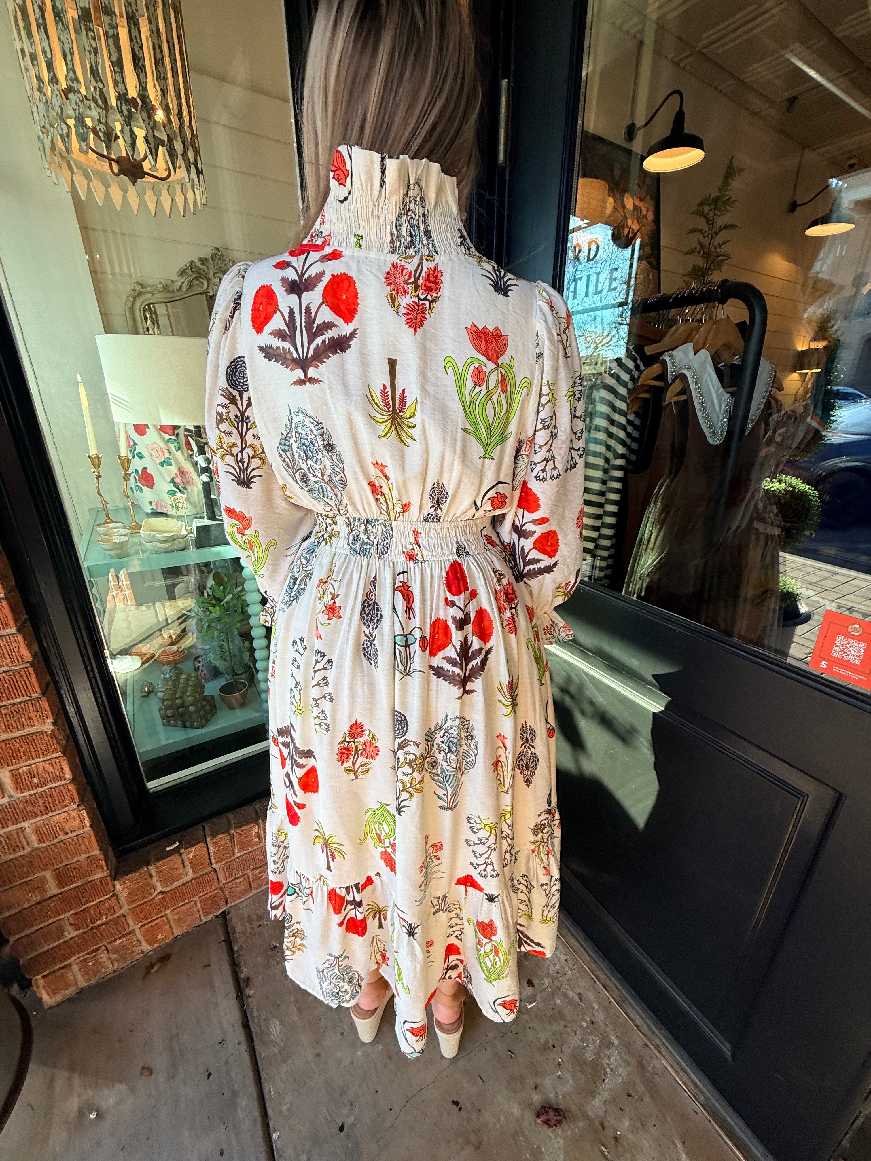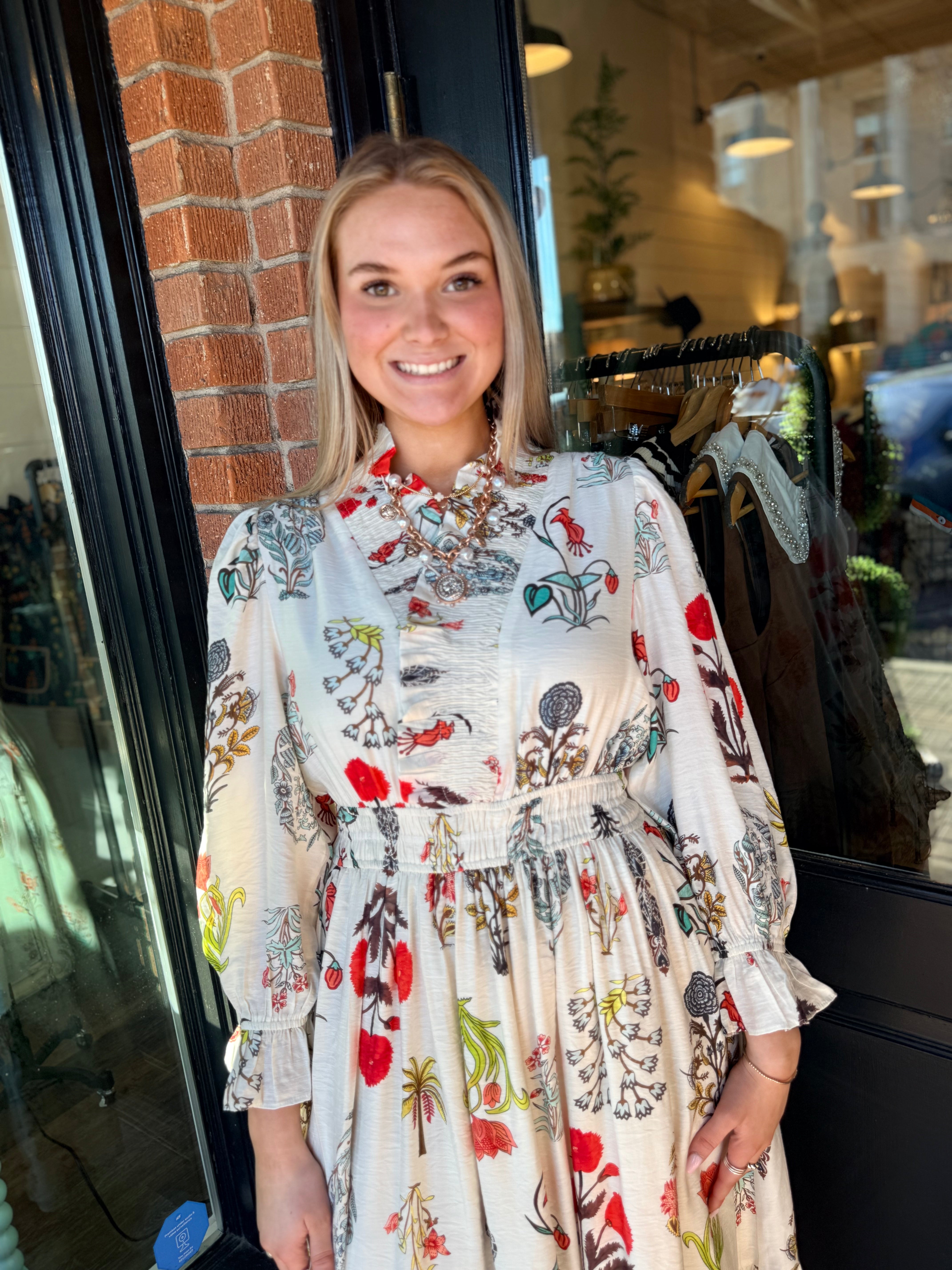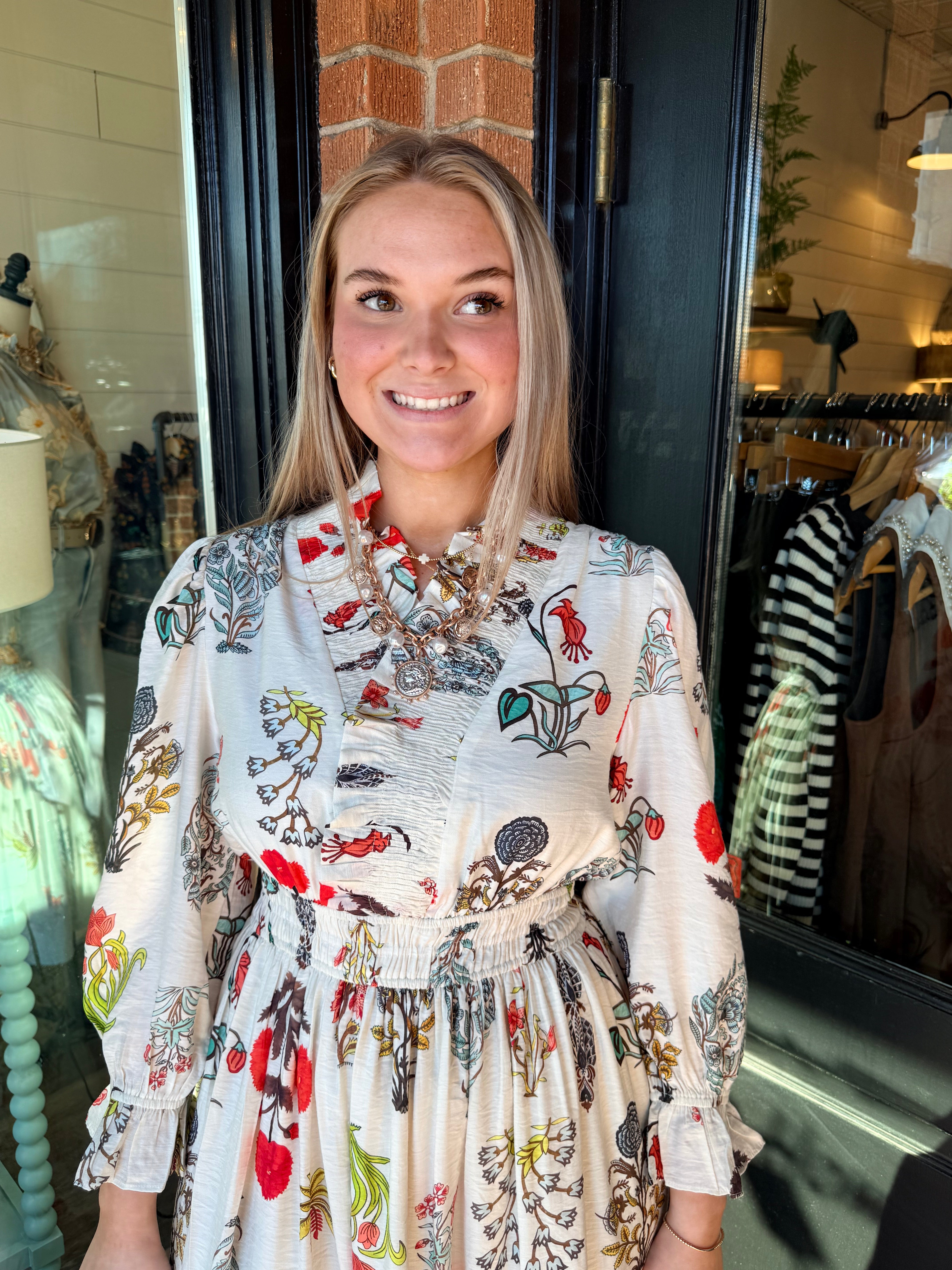 Feminine with beautiful movement, the Elodie Mix Smocked Waist Floral Midi Dress features a charming floral encyclopedia print that feels both timeless and elevated. Designed with a flattering smocked waist, this midi dress creates a defined yet comfortable silhouette. The ruffle-trim split neckline and 3/4 sleeves add soft detail, while the tiered skirt flows effortlessly. Fully lined for coverage, it’s perfect for everything from daytime events to special occasions.