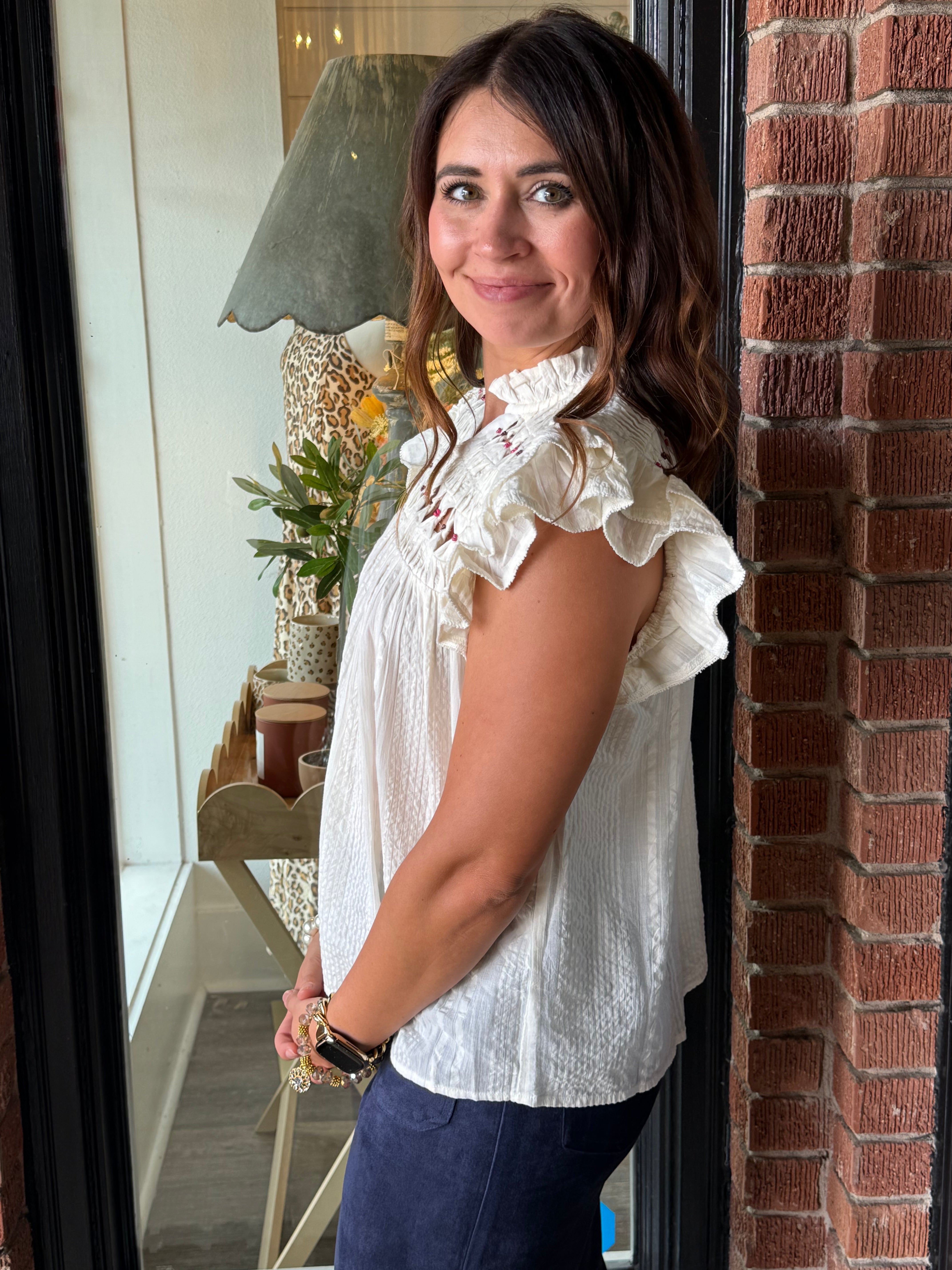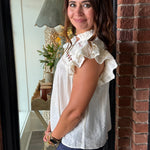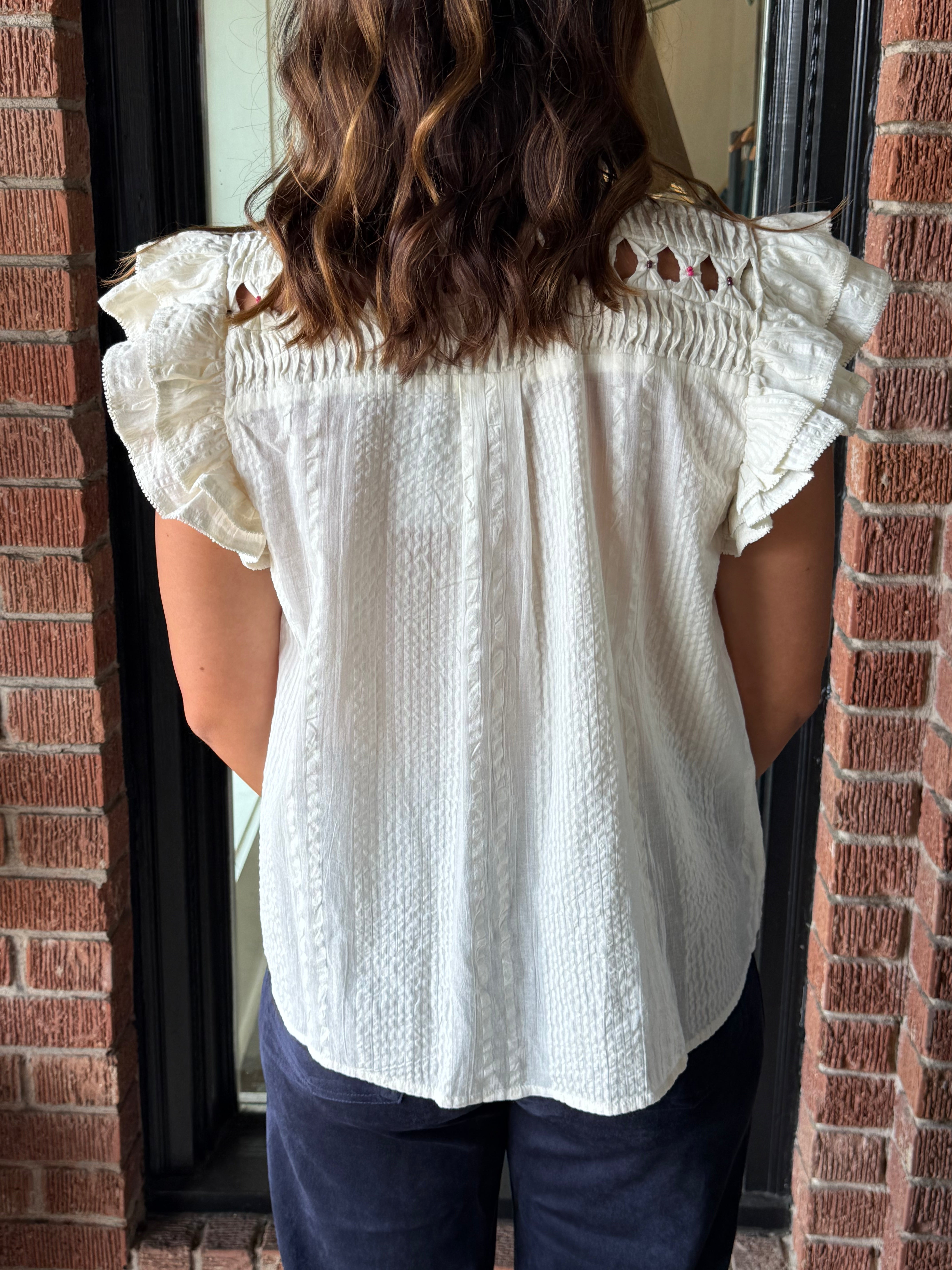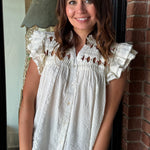 Emery Embroidered Cutout Ruffle Sleeve Button Top