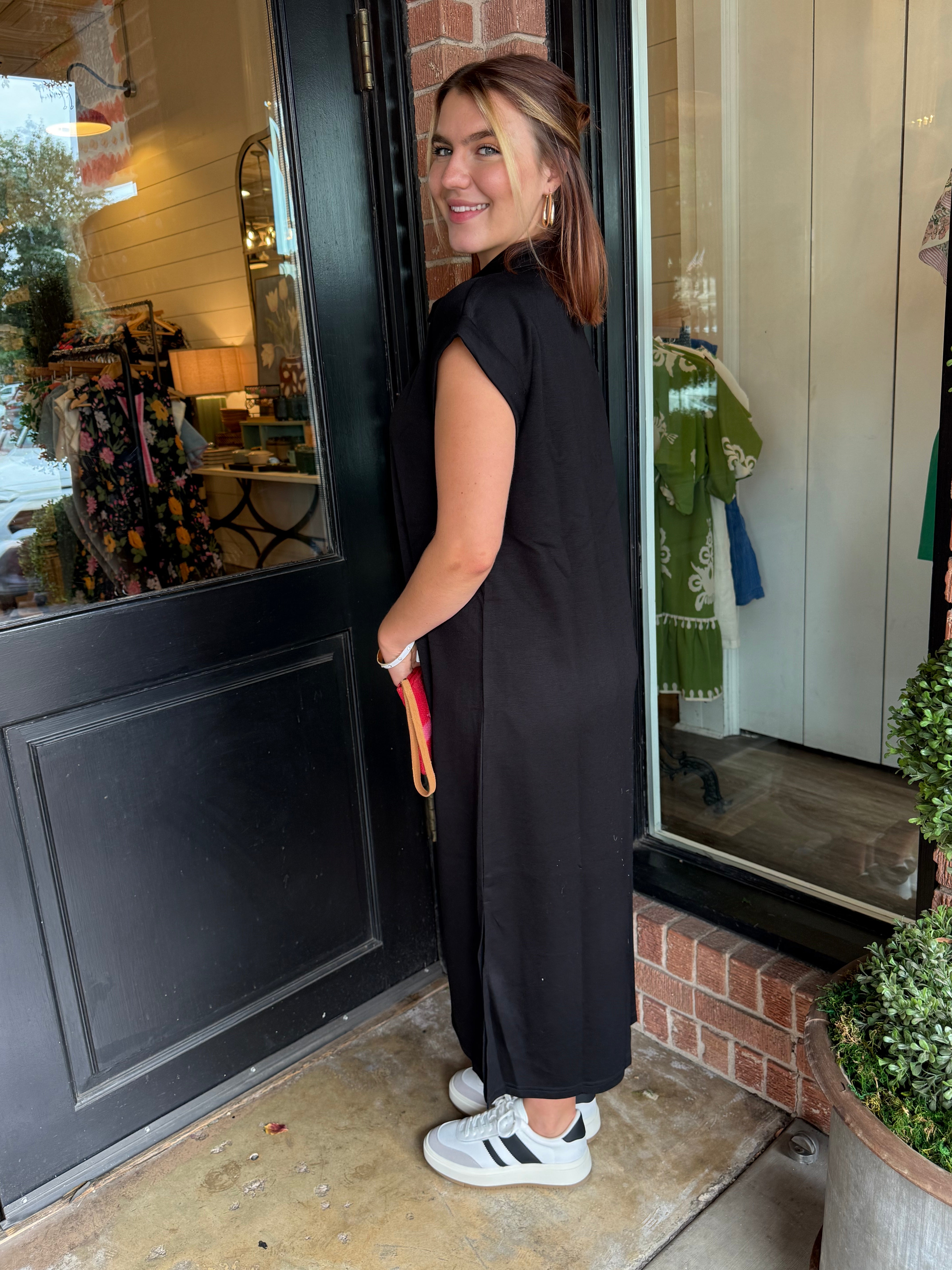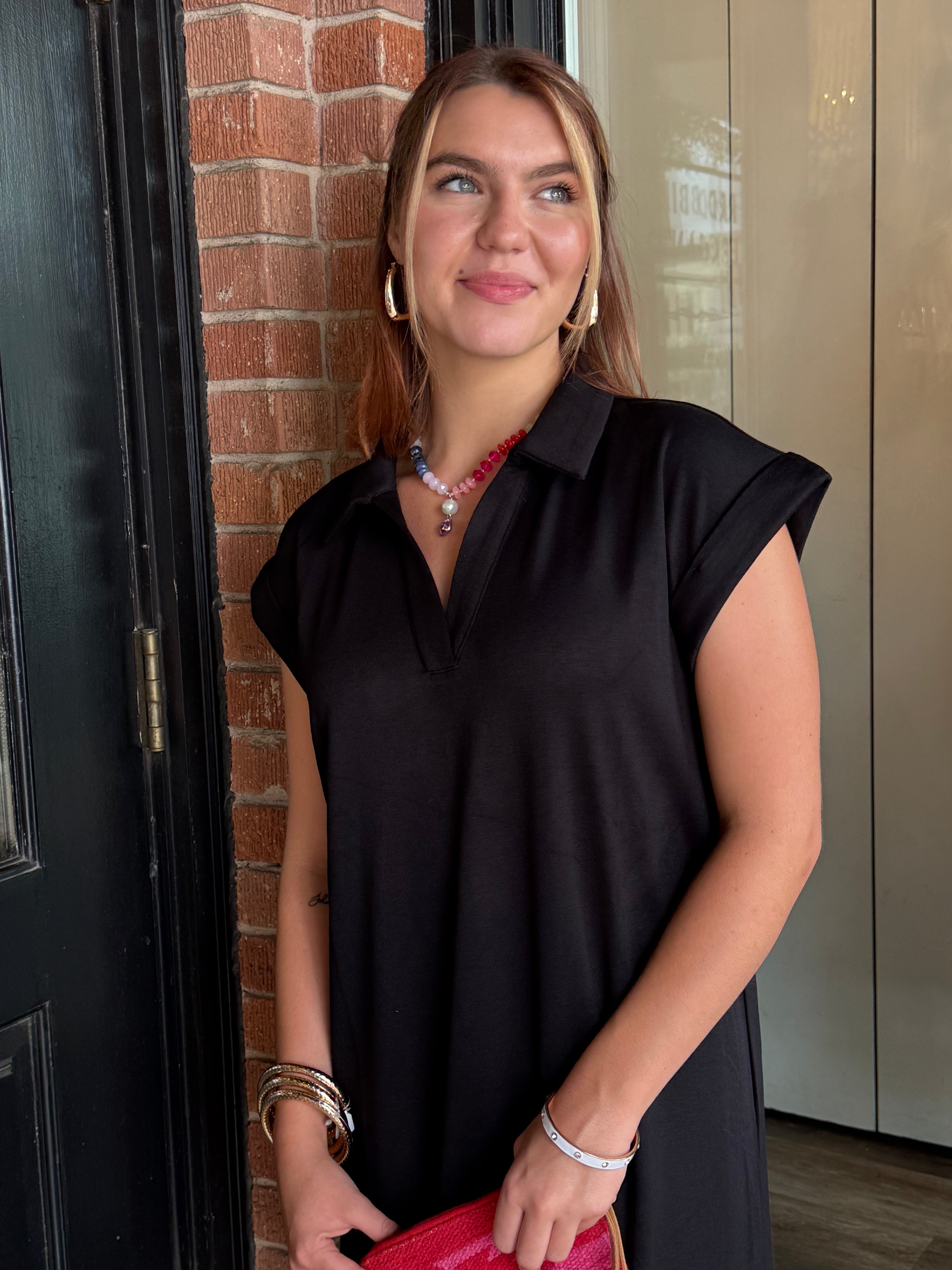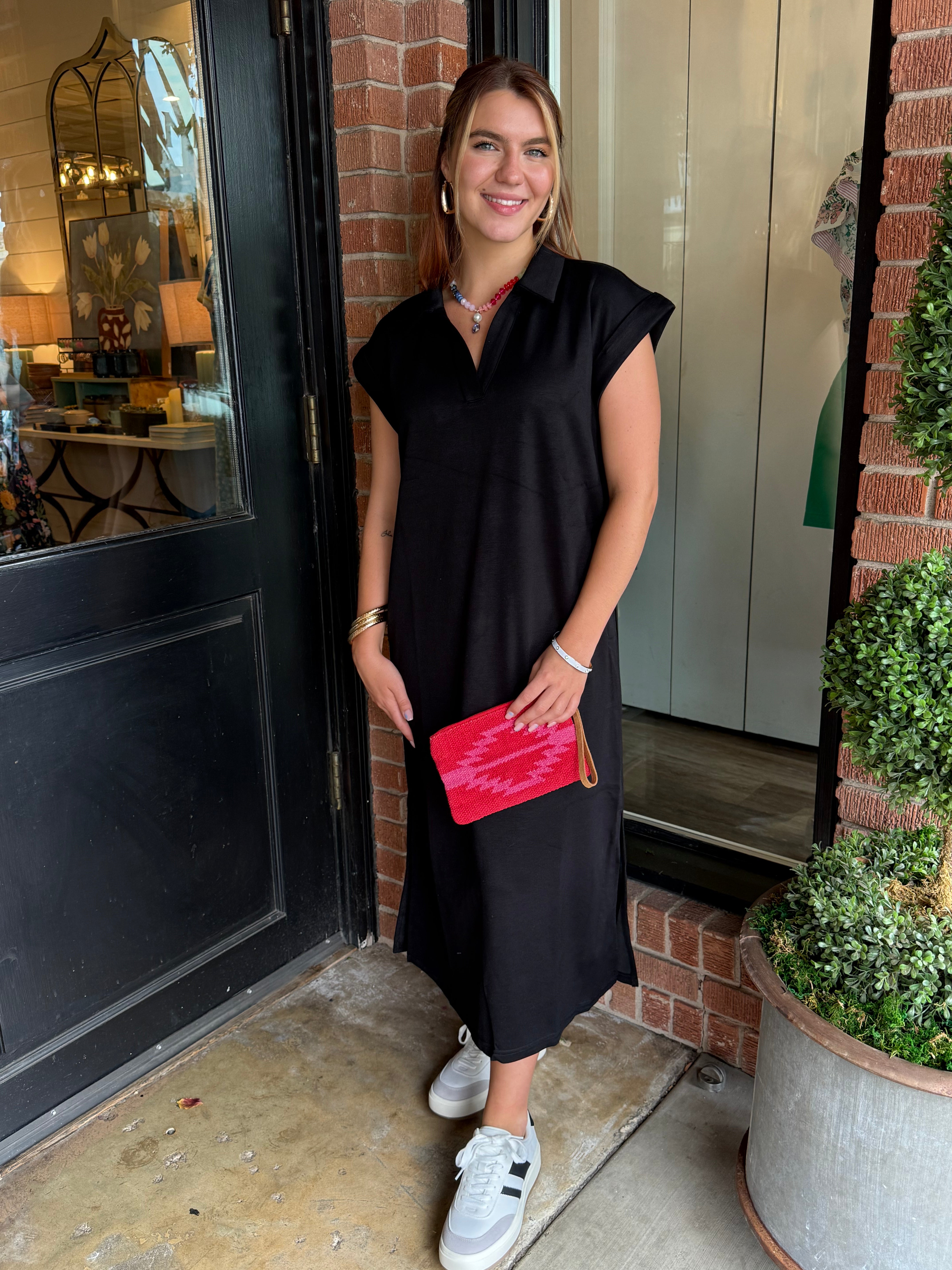 Effortless and versatile, the Fiona Solid Midi Dress features a flattering open collared neckline, short kimono sleeves with banded cuffs, and a relaxed fit that moves with you. Side slit details and functional pockets add comfort and ease, while the lightweight, non-sheer fabric makes it a go-to for everyday wear.