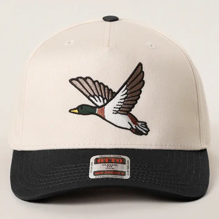 A classic outdoor look with timeless appeal. This two-tone trucker hat features a beautifully detailed Flying Mallard embroidered graphic, bringing a vintage, Americana-inspired feel with a modern edge. Designed on a structured OTTO body cap with a mid-profile fit and slightly curved brim, it offers a clean silhouette and comfortable wear.