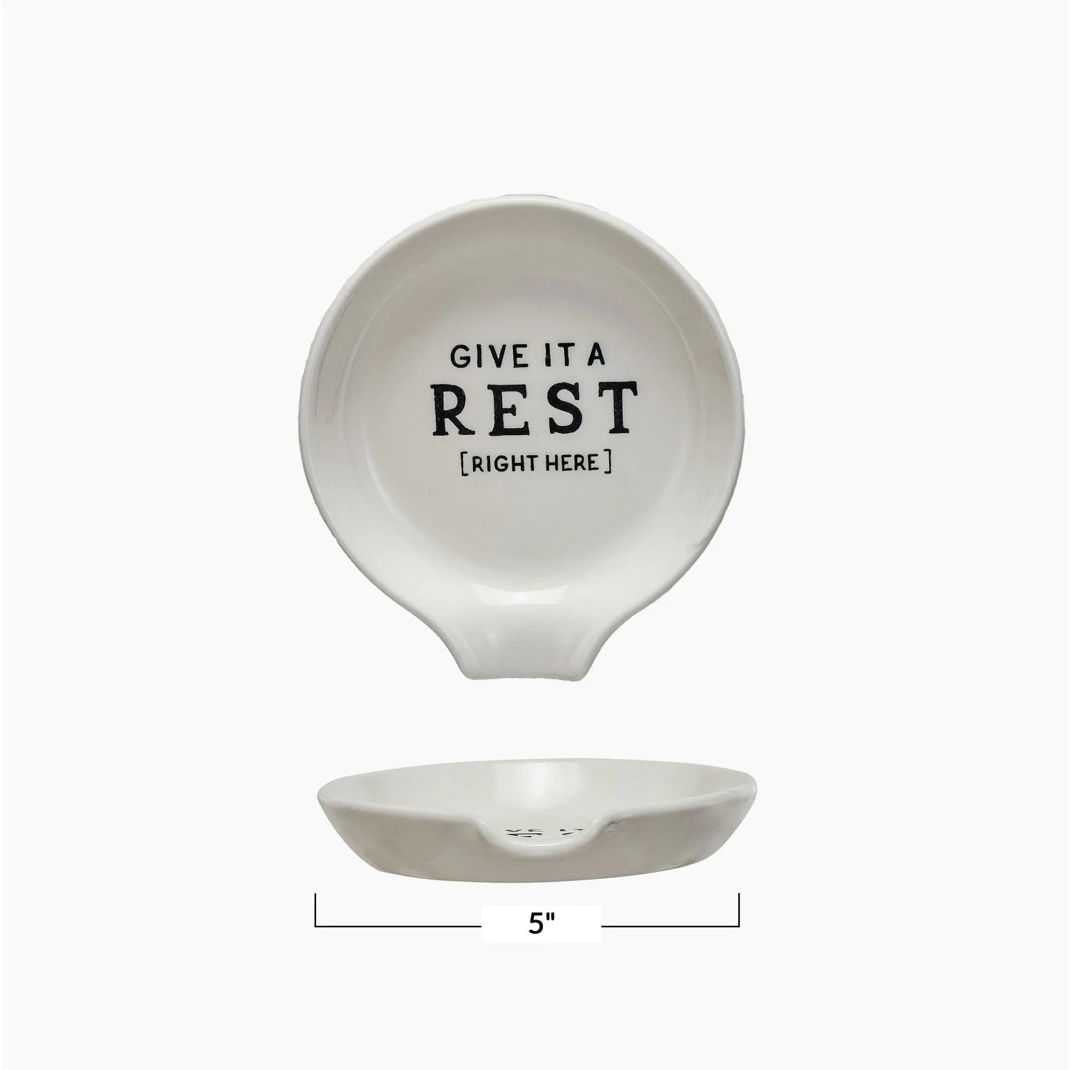 The Give It a Rest Spoon Rest is a must-have for every kitchen. Made of durable stoneware and featuring a wax relief saying "Give It A Rest," this spoon rest is both stylish and functional. Keep your counters clean while adding a touch of humor to your cooking routine. Dimensions are 5"L x 4-1/2"W.