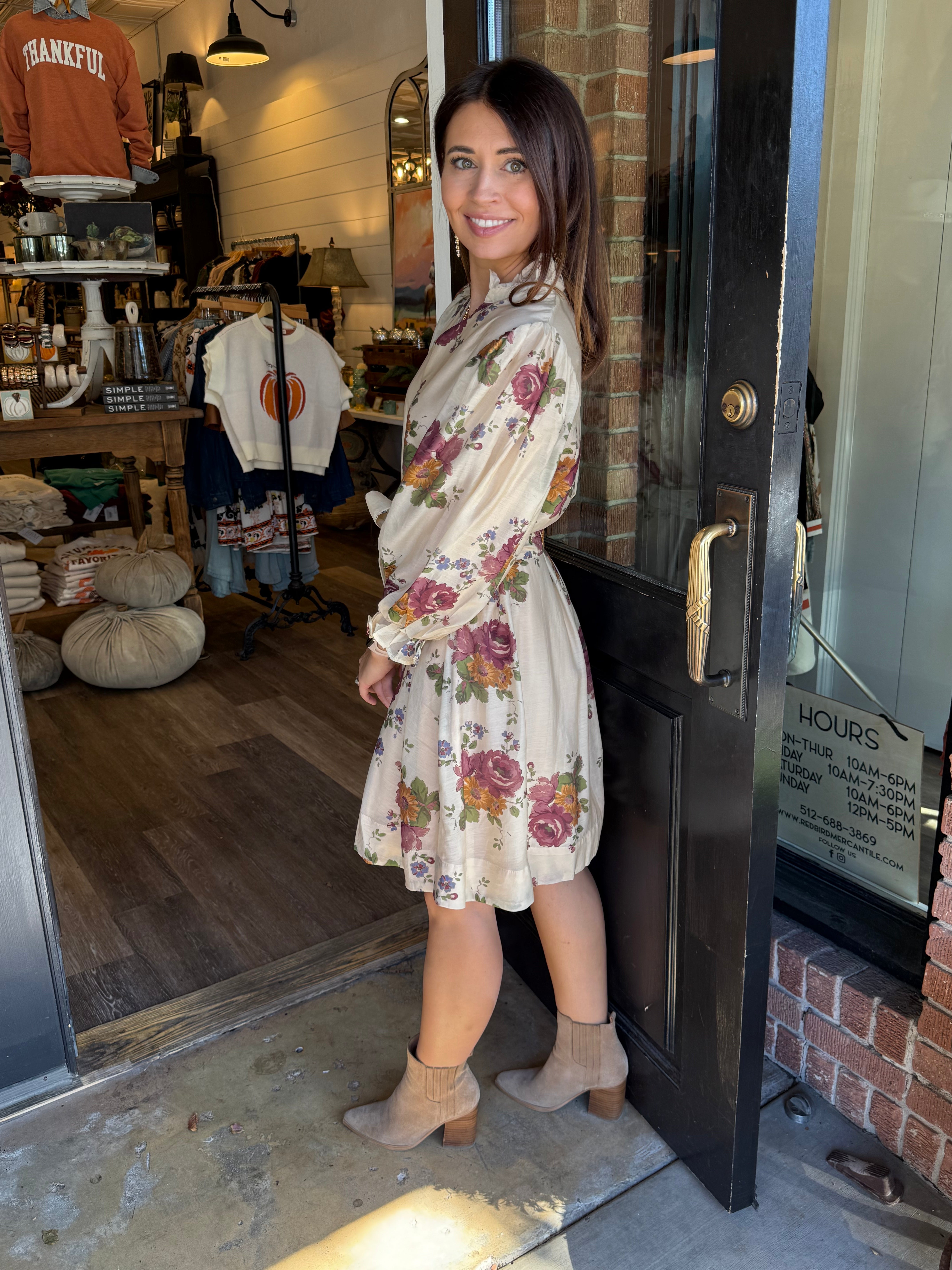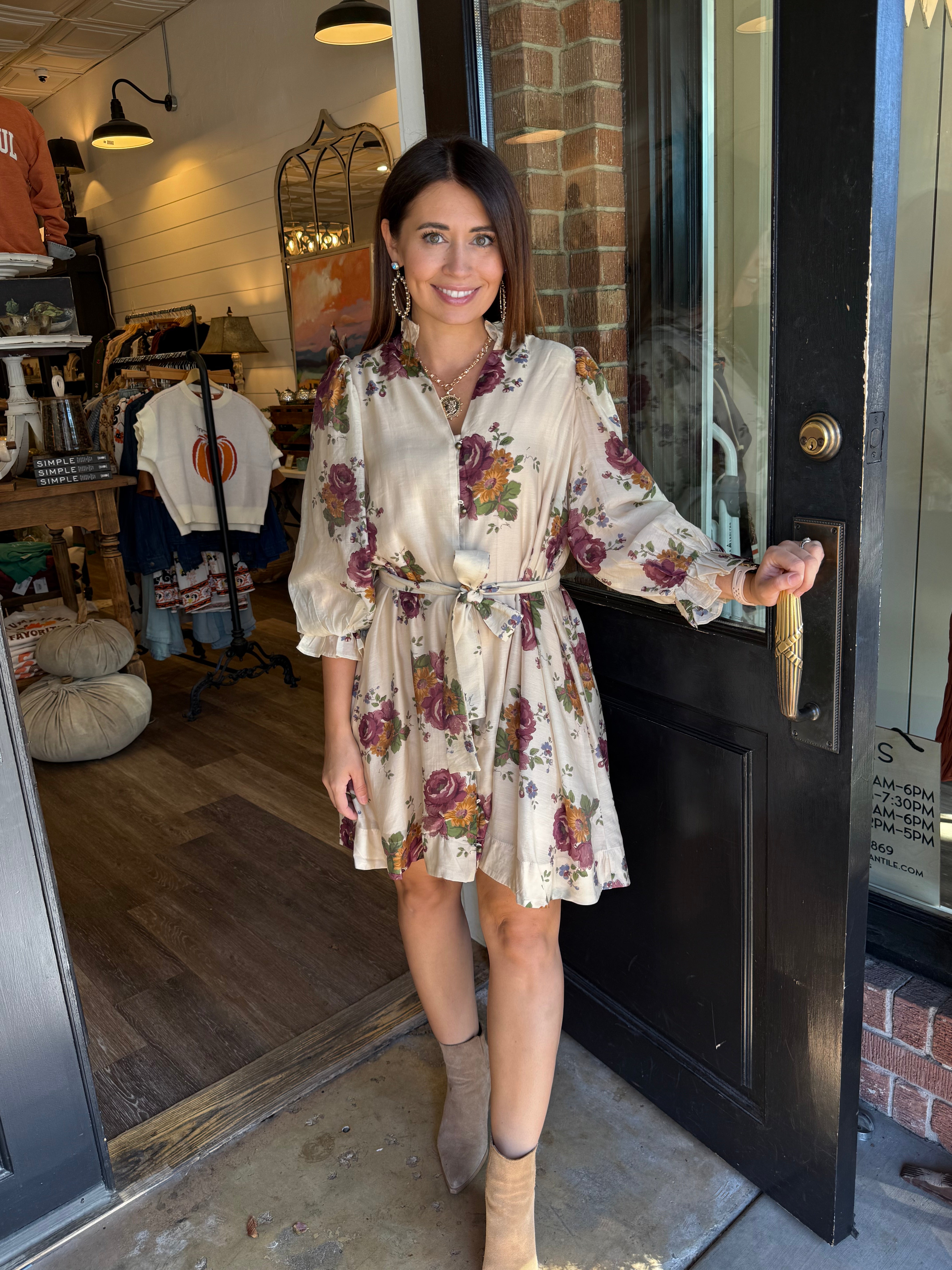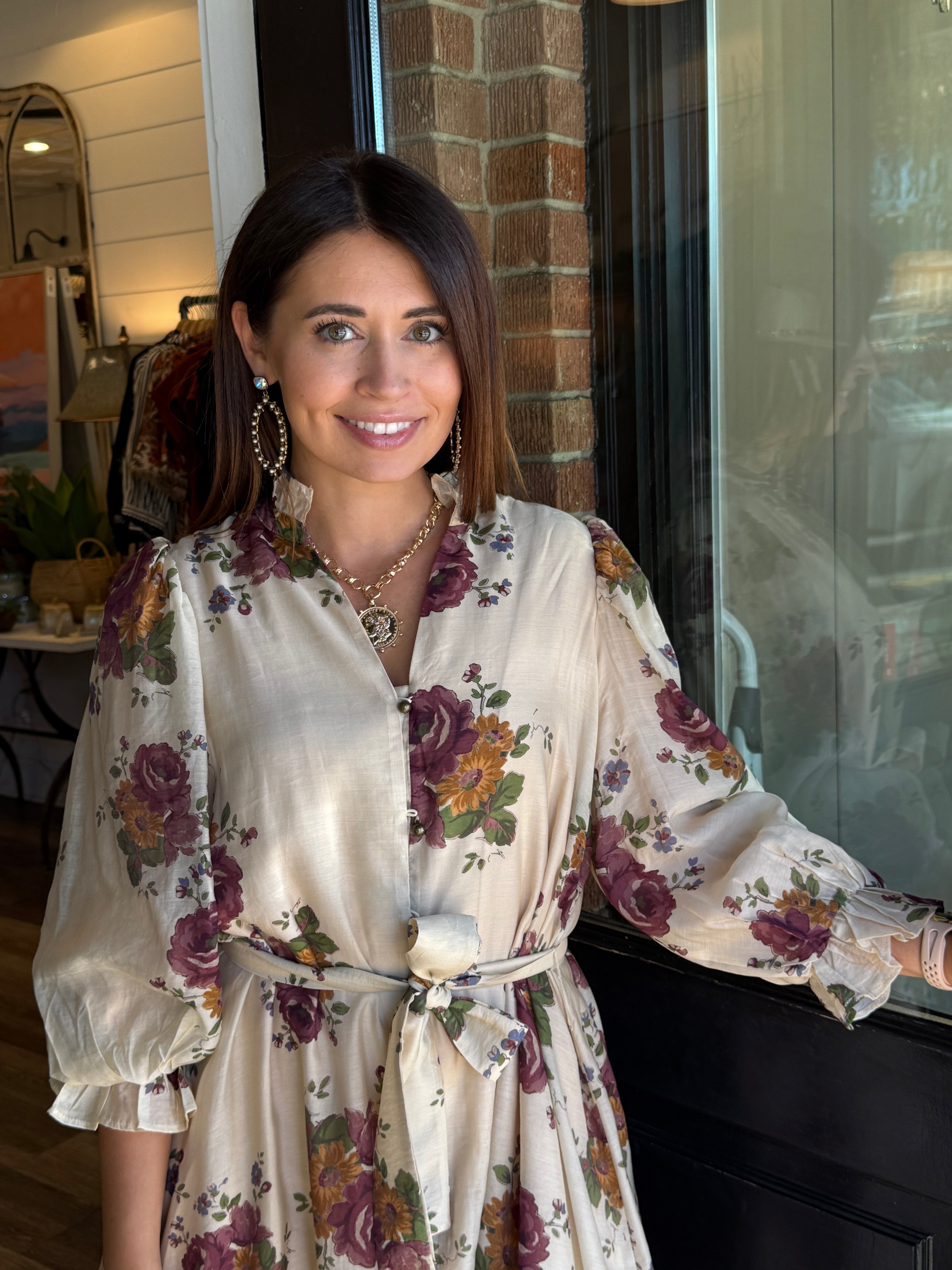 Romantic and refined, the Hadley Floral Print Dress is a timeless favorite for every season. Featuring a delicate floral print, soft ruffled neckline, and full hook button-down front, this elegant dress is designed to flatter. The ¾ sleeves and tie belt create a feminine silhouette that’s both comfortable and polished — perfect for workdays, brunch, or special occasions.