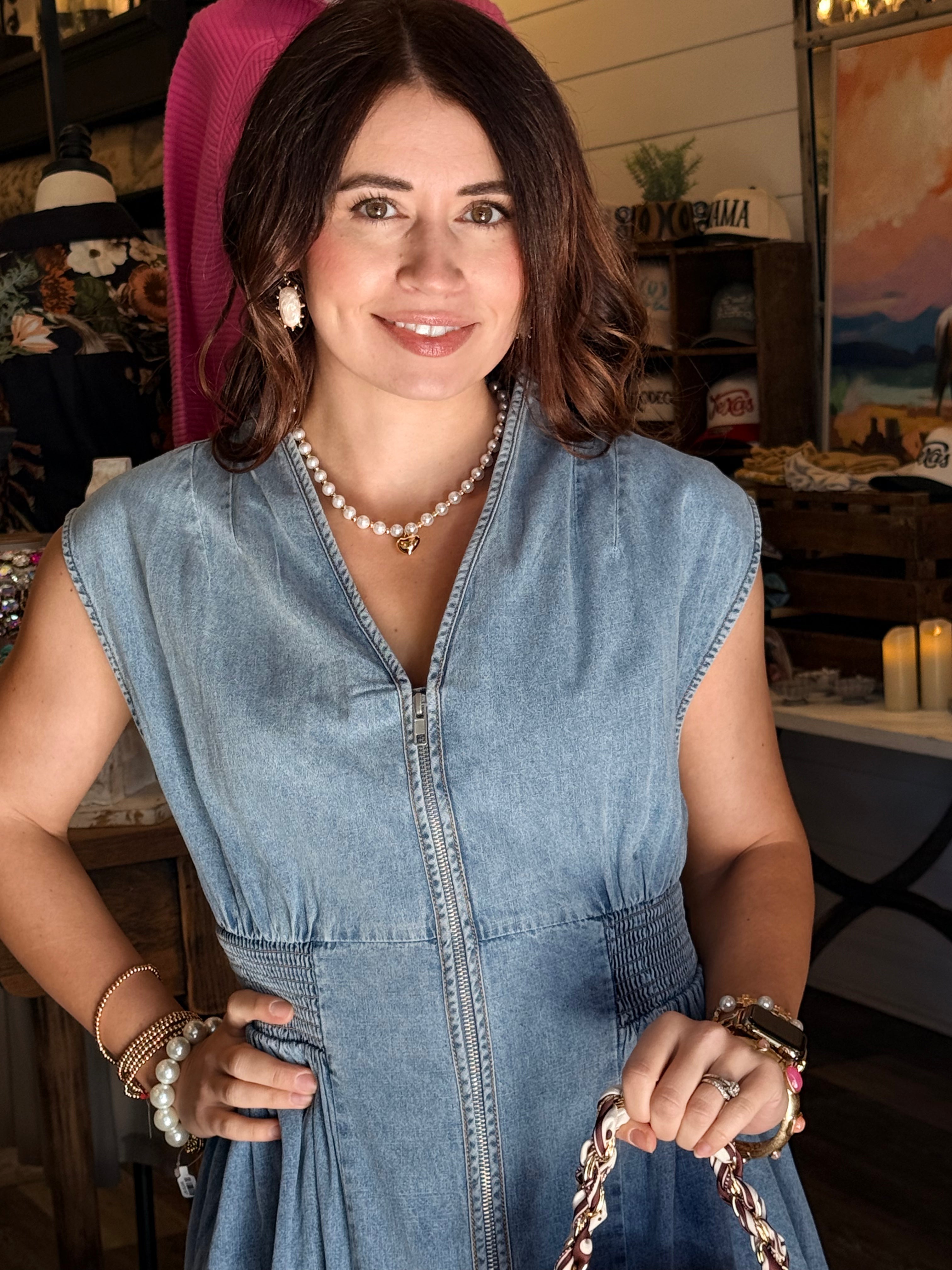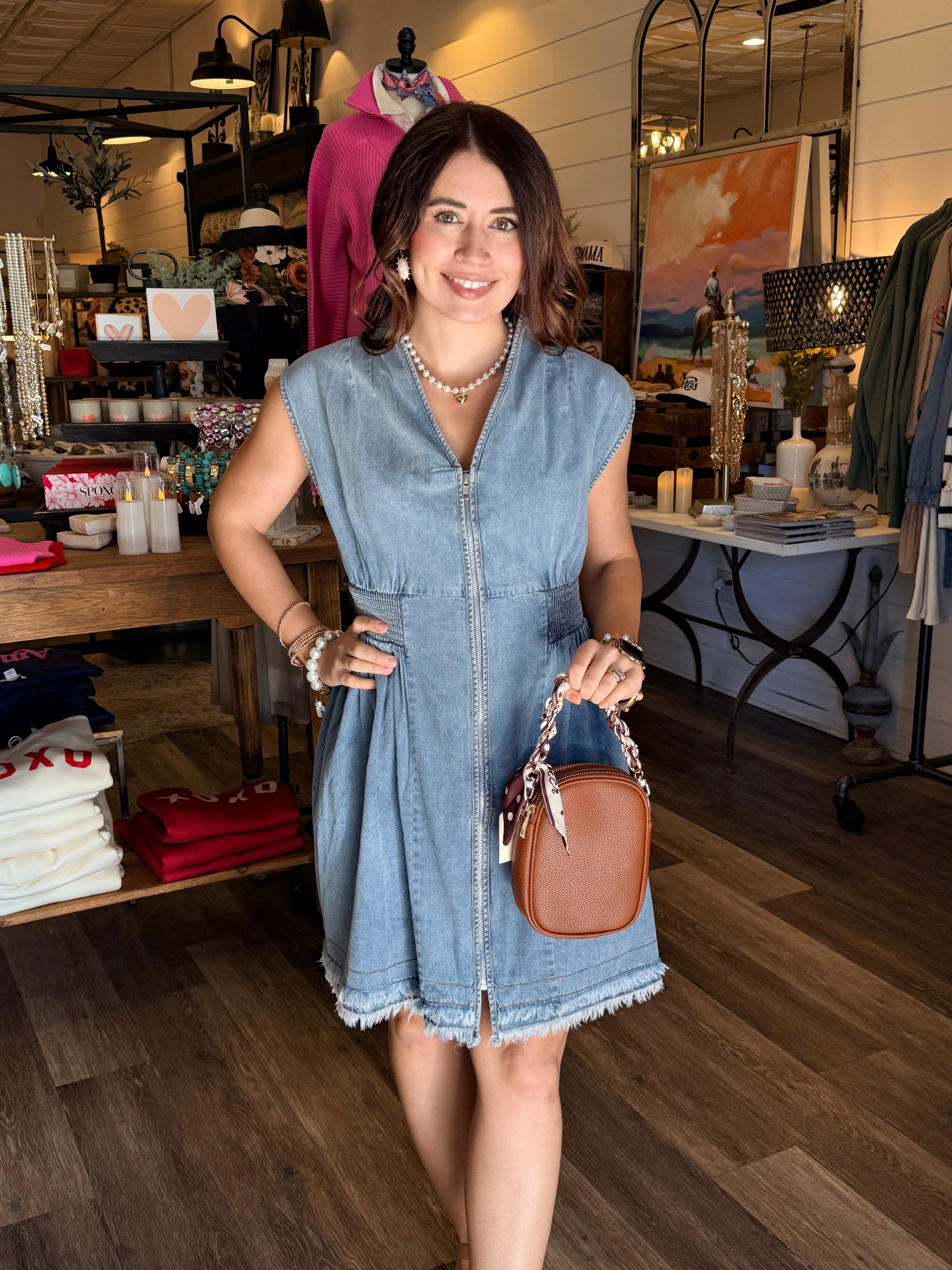 Easy, flattering, and full of character—the Hannah Stone Wash Denim Mini Dress is a fun take on classic denim. Designed with a zip-front closure and a smocked waistband for a comfortable, cinched fit, this mini dress is finished with a fringe hem that adds just the right amount of edge.