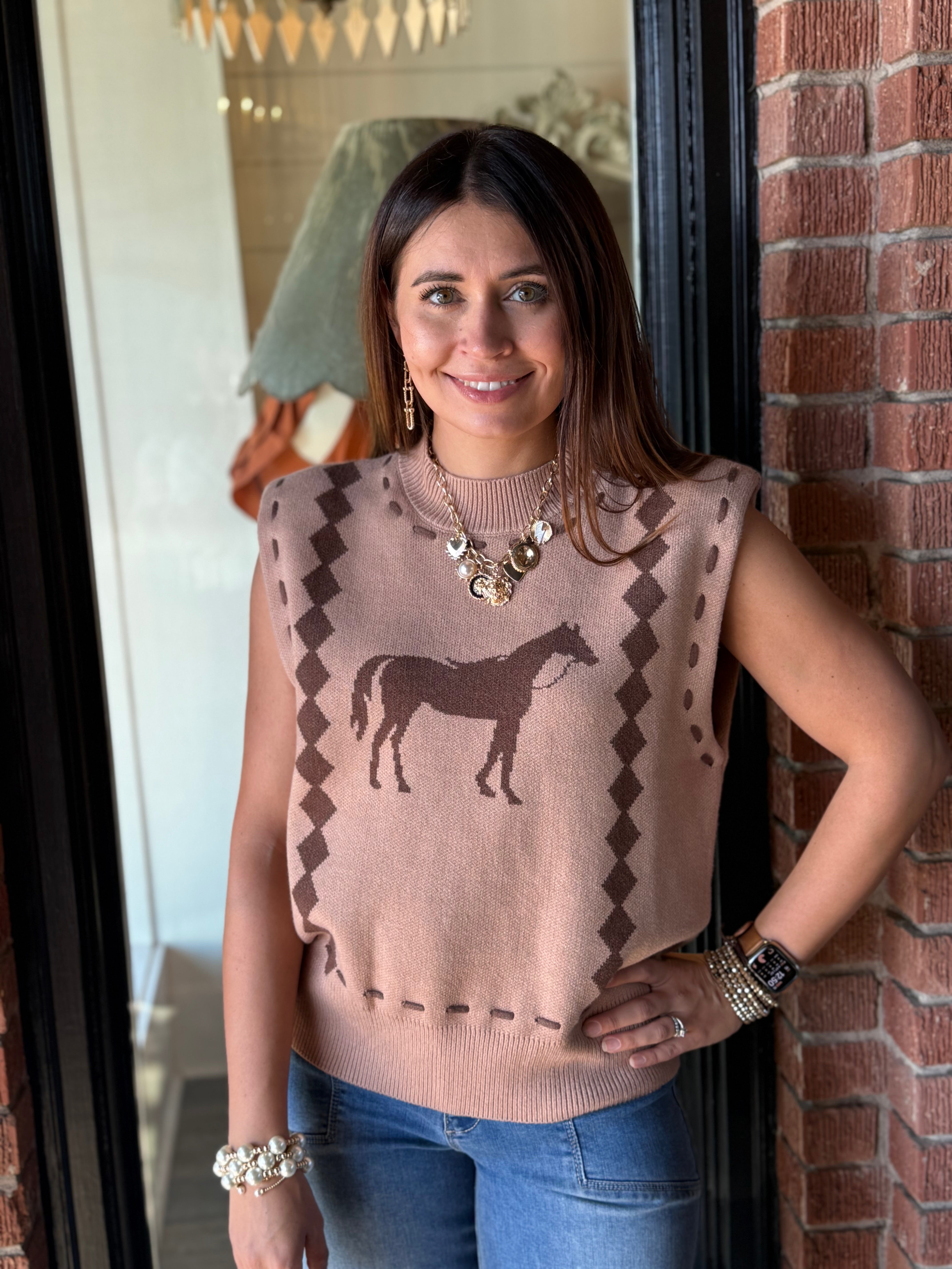 A modern take on western charm. The Hannah Horse Knit Vest combines comfort and personality with a sleek silhouette and playful equestrian-inspired design. Perfect for layering through every season.