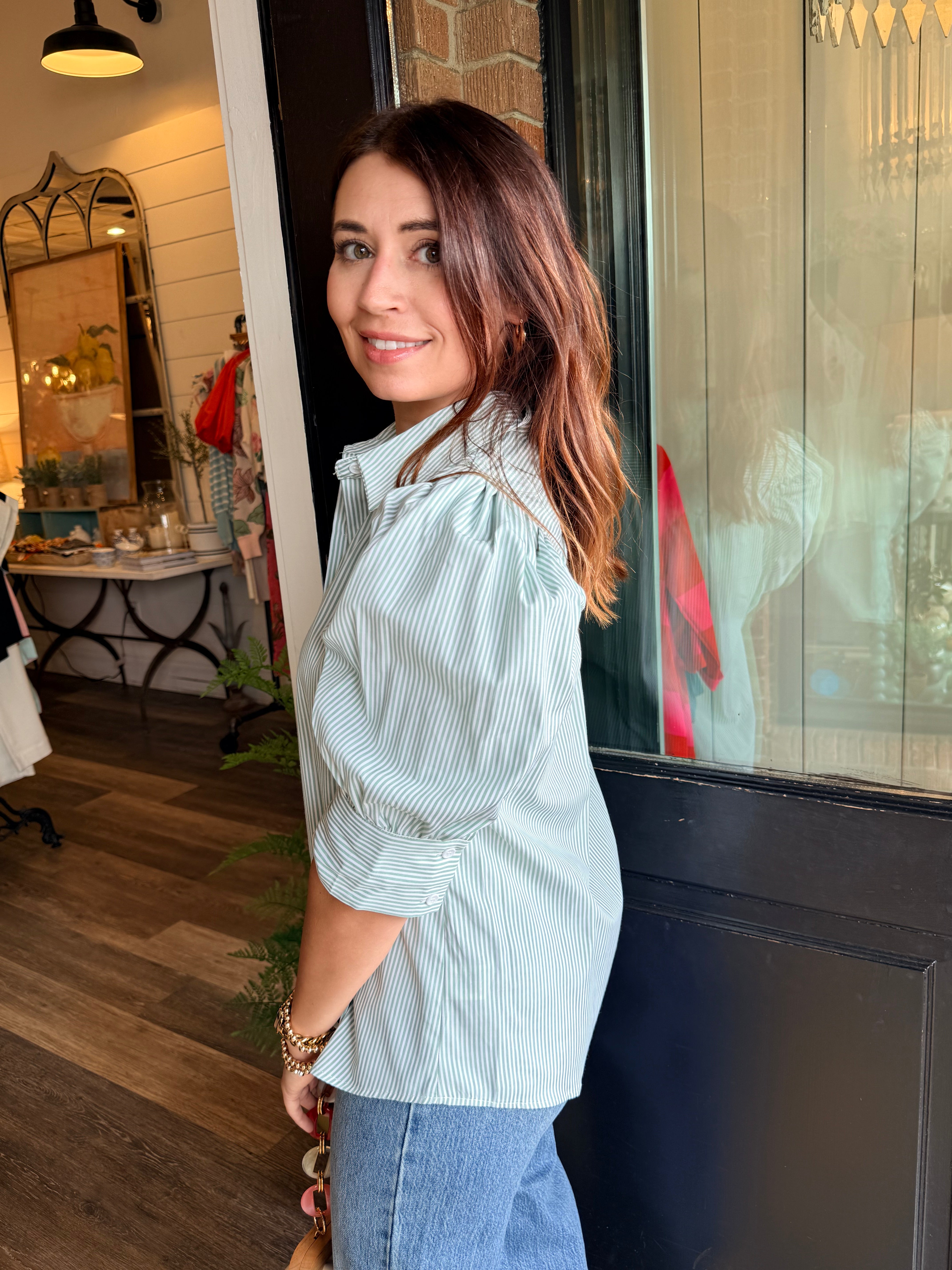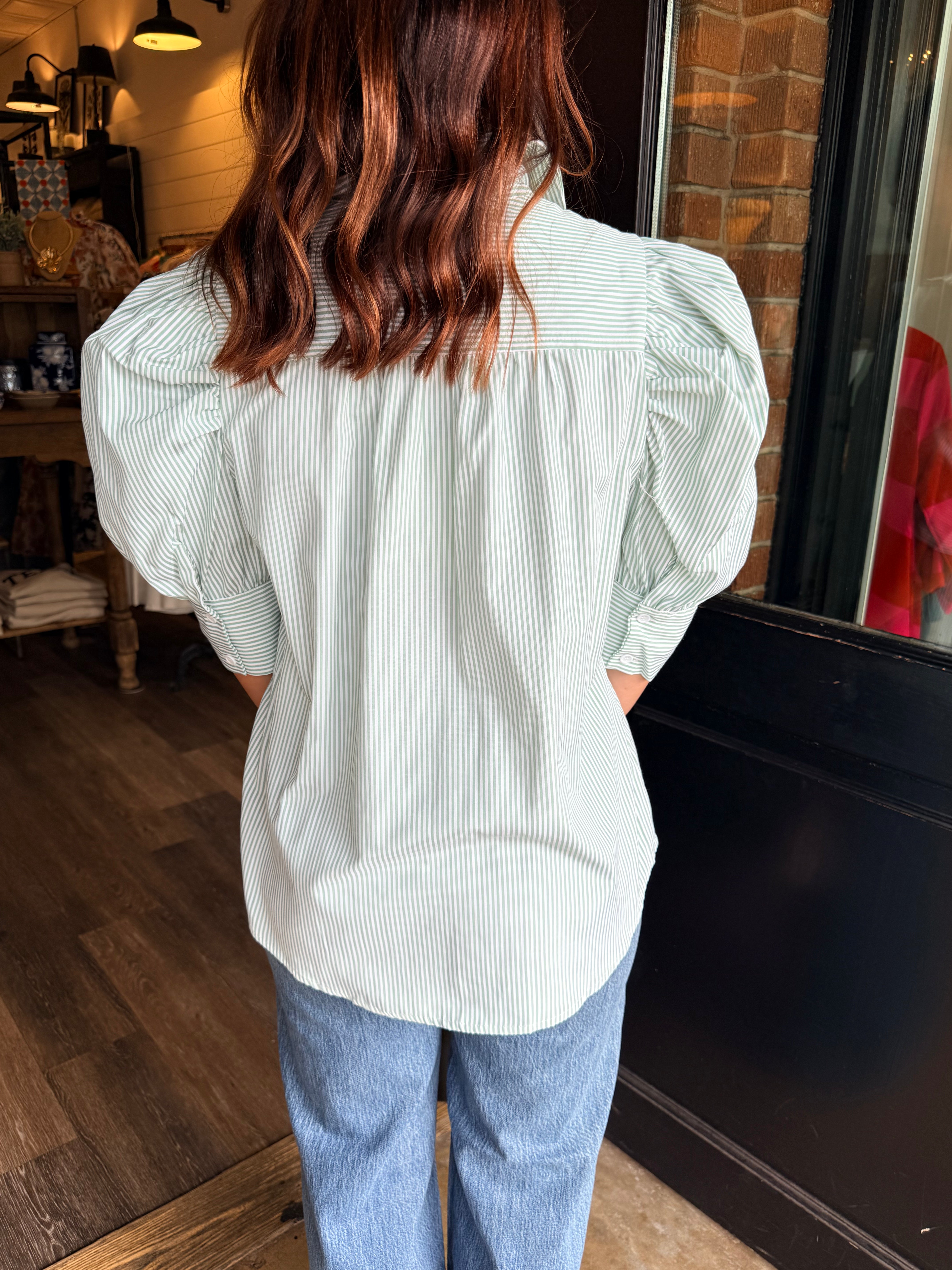 Classic stripes meet easy, everyday polish in this must-have blouse. Designed with a collared neckline, button-front closure, and soft puff sleeves, this top gives you that effortless “put together” look without sacrificing comfort. Lightweight and breathable, it’s perfect for workdays, weekends, and everything in between — no wonder it’s a best seller.