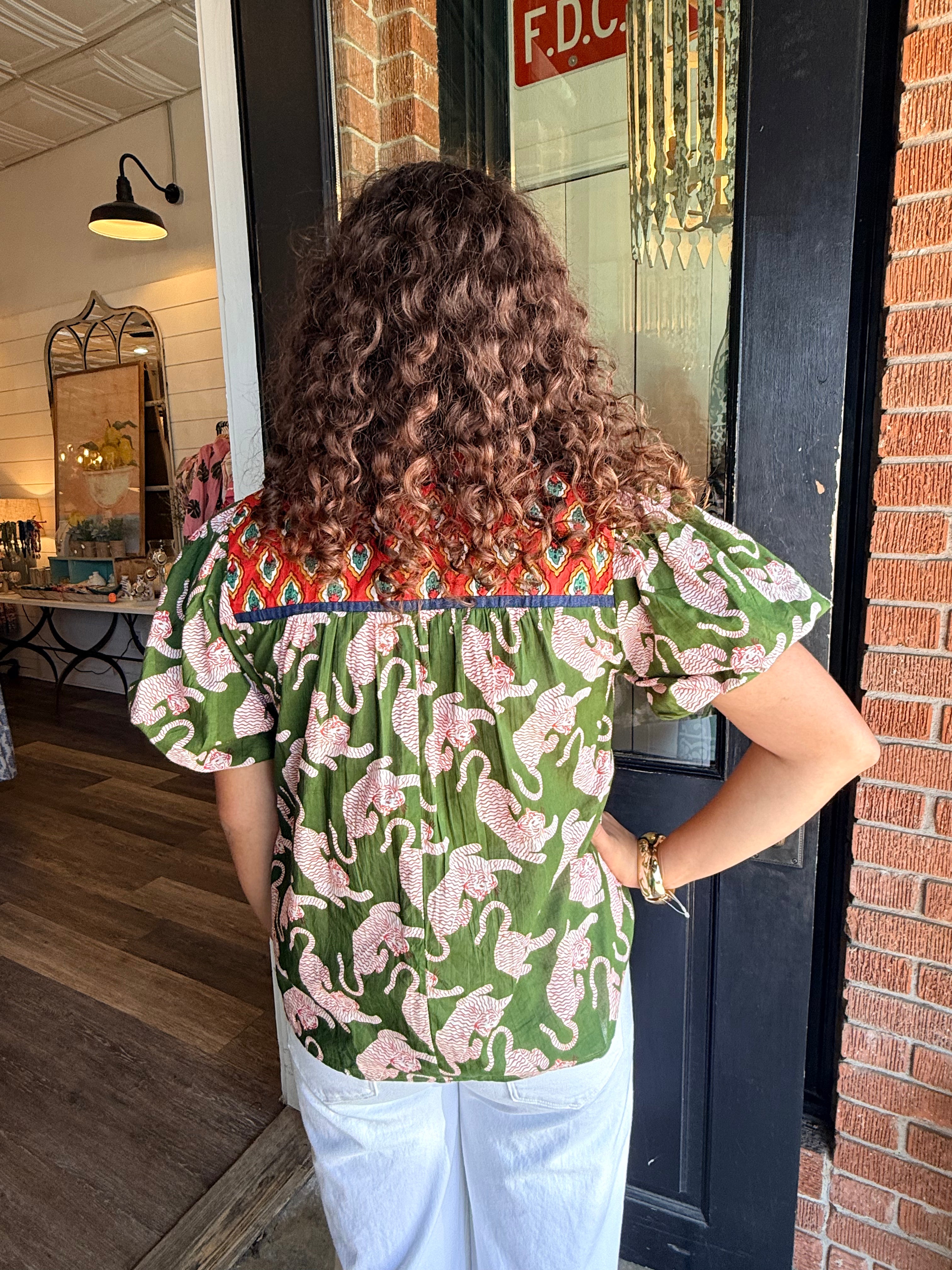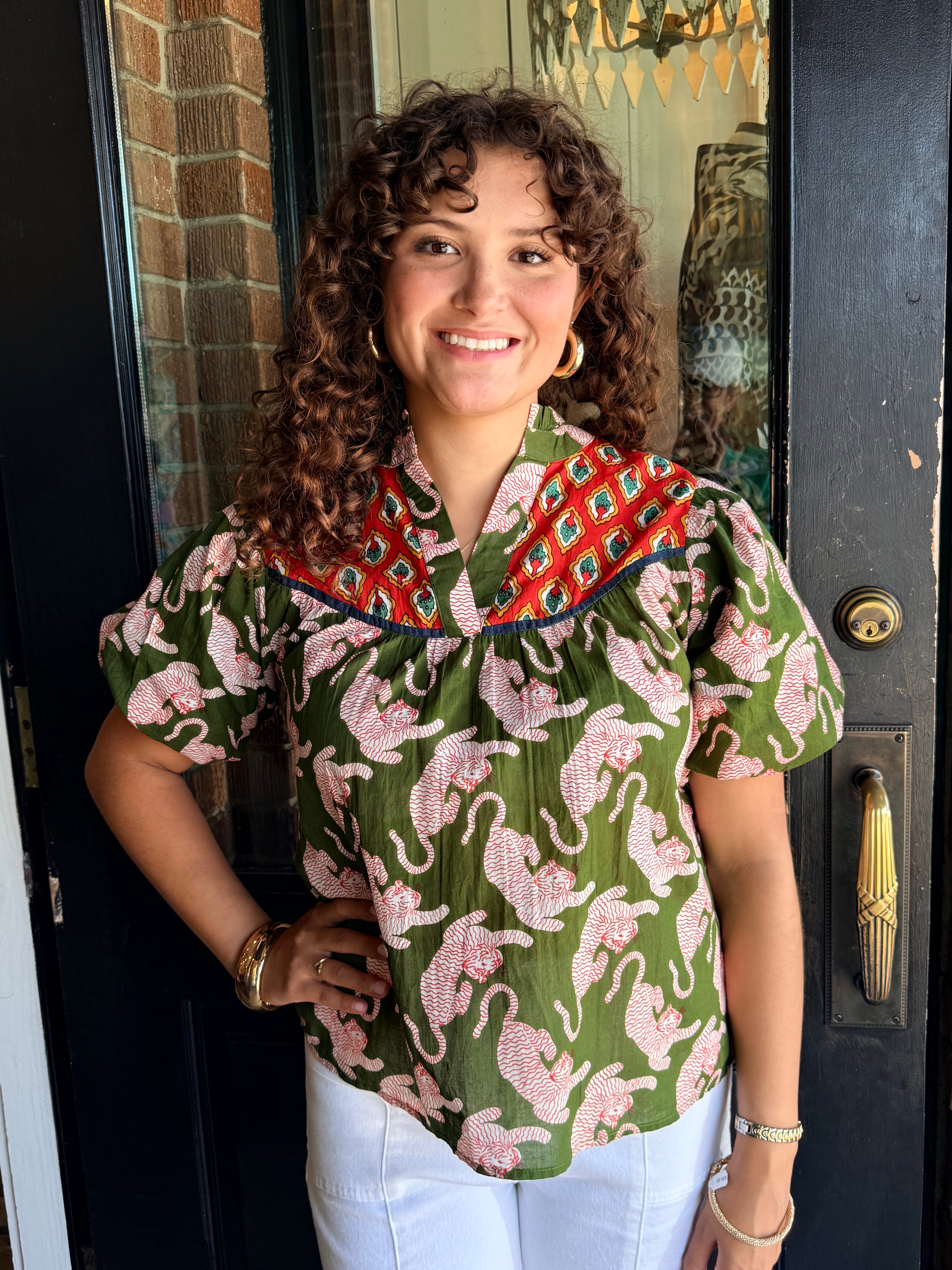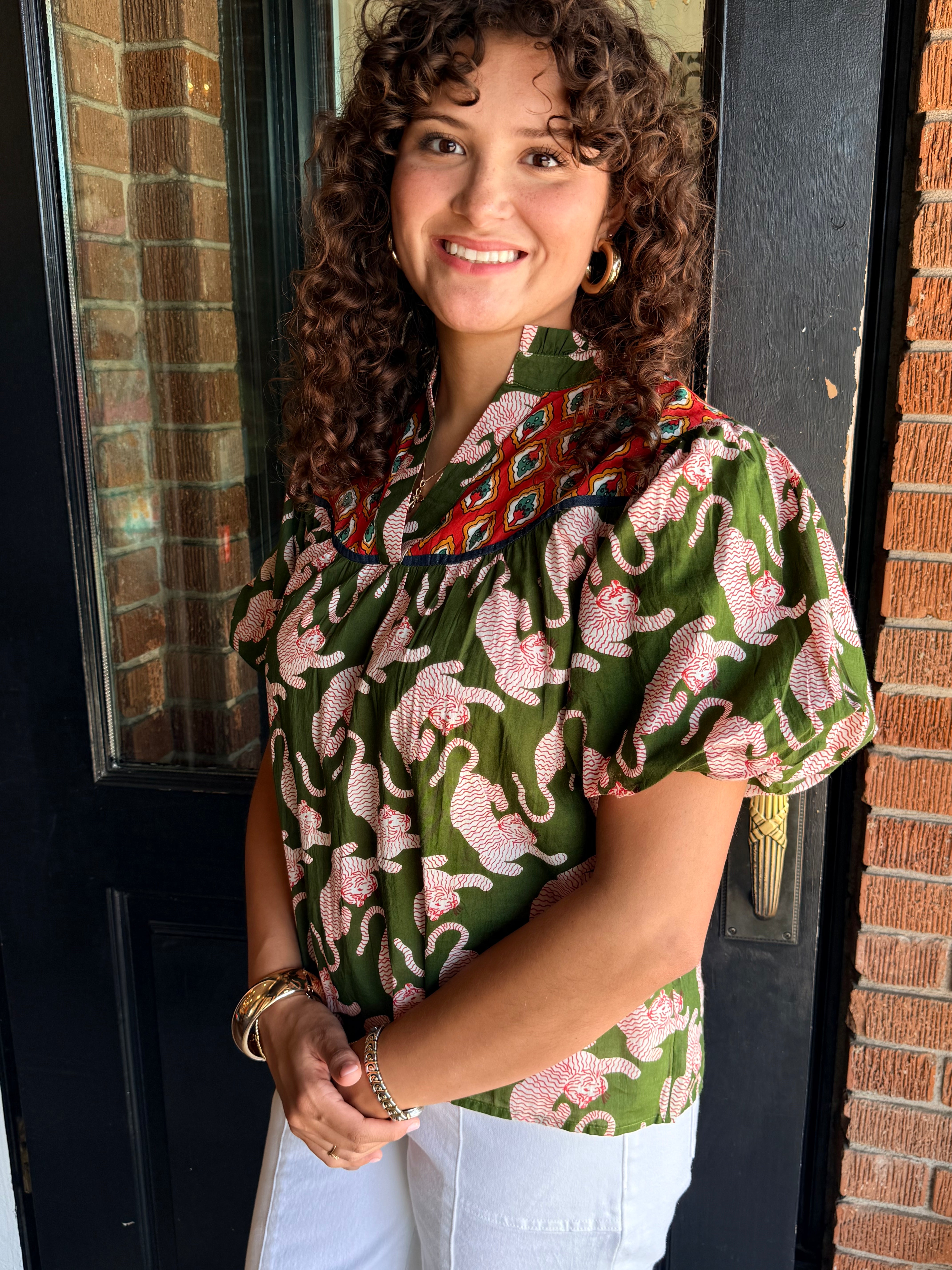 A fun, standout top with a bold twist. The Harper Tiger Print Top features an eye-catching tiger print and soft puff sleeves that add just the right amount of shape. Lightweight and easy to style, it’s perfect with denim, shorts, or white jeans.