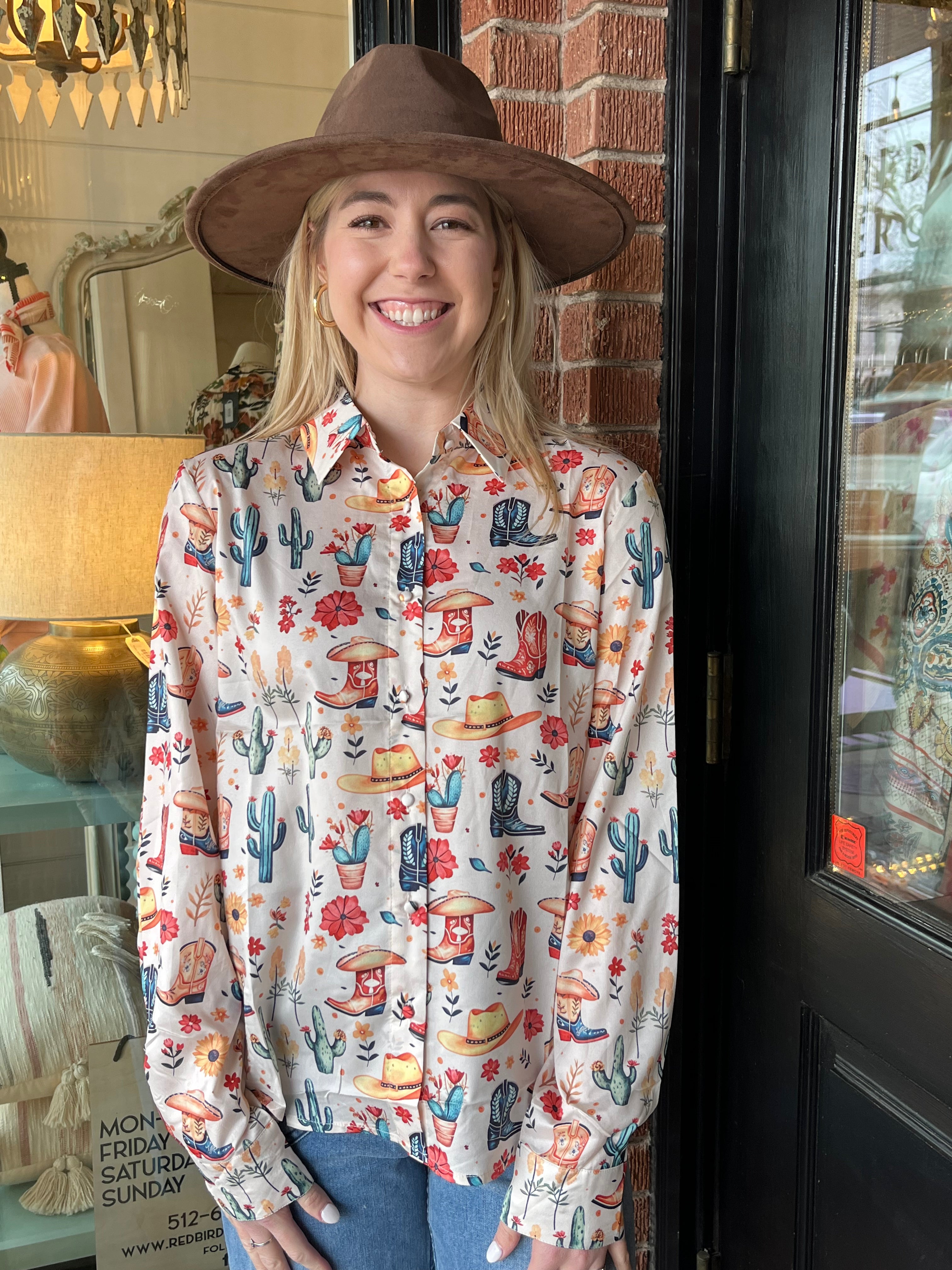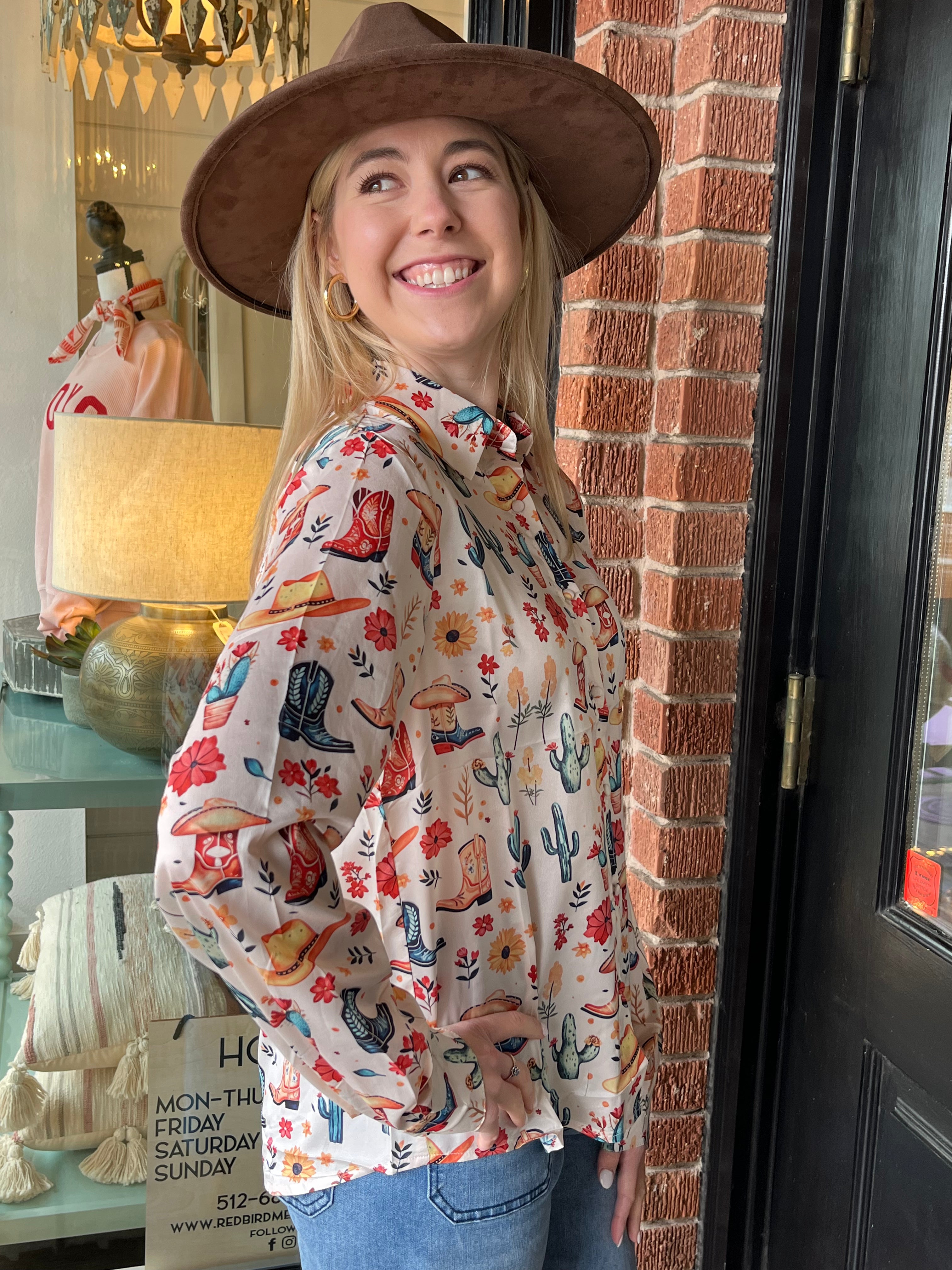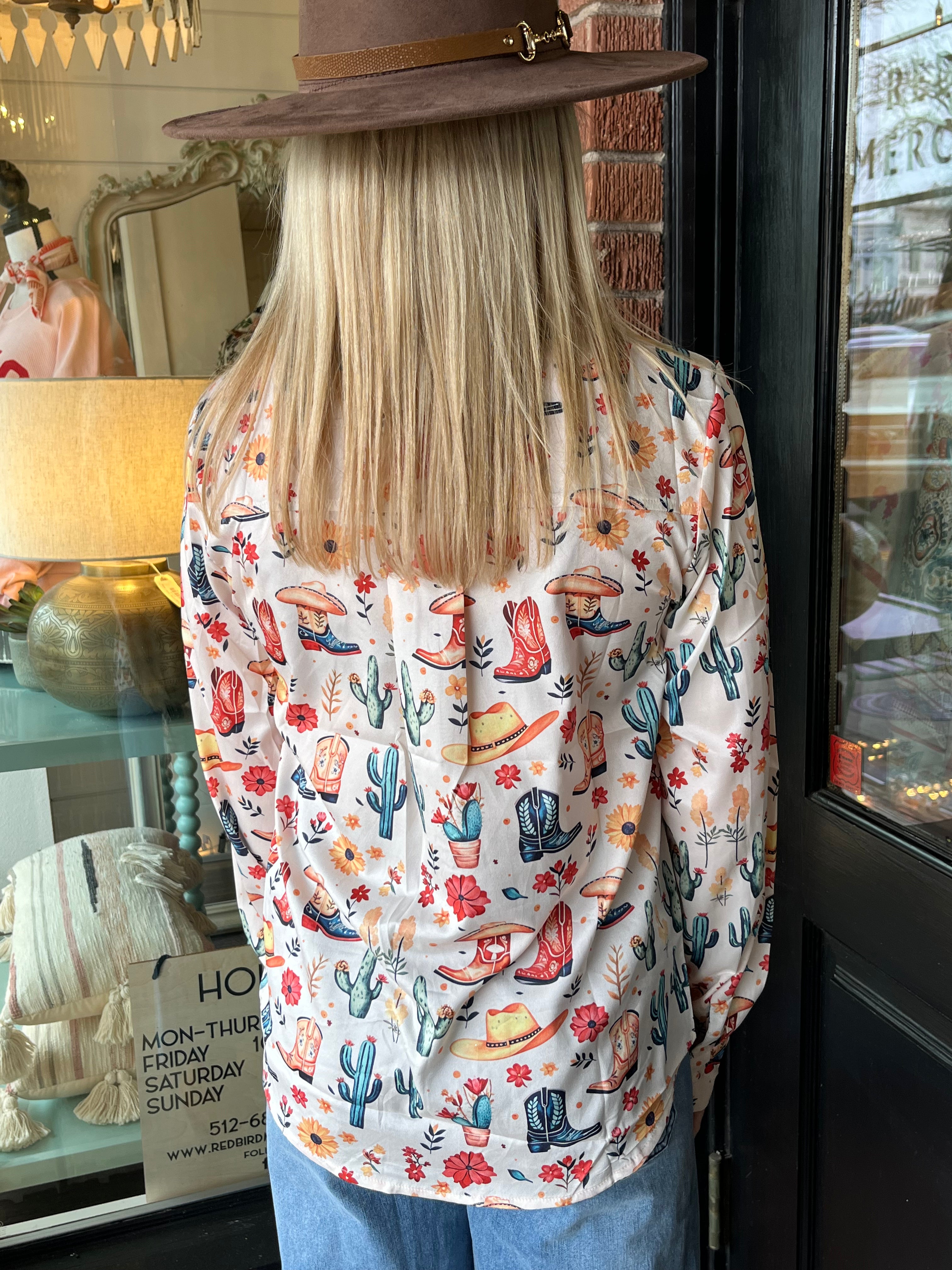 A stylish button-up blouse featuring a bold western motif print, perfect for adding a unique touch to your outfit. Made from lightweight fabric for all-day comfort.