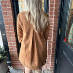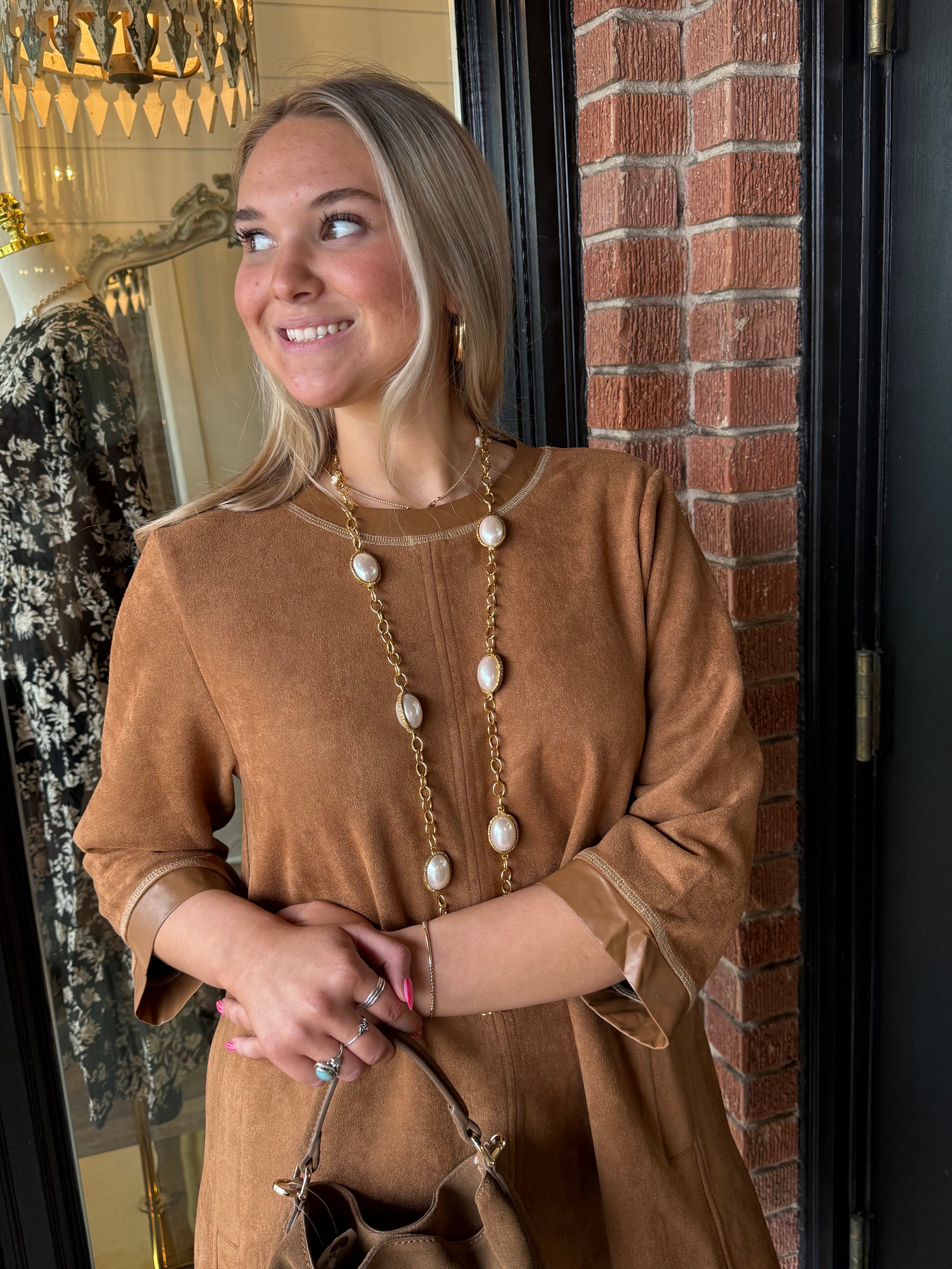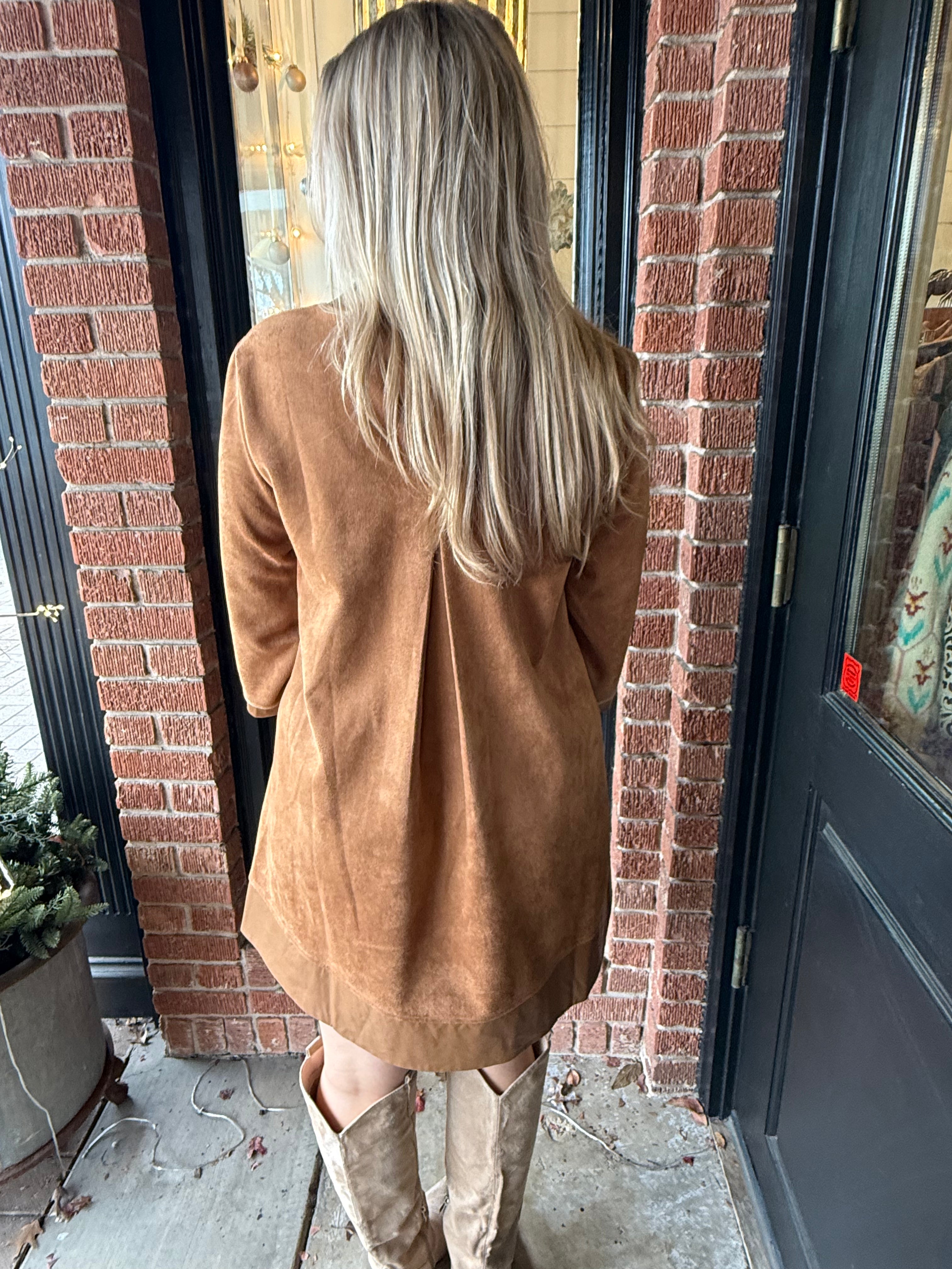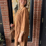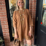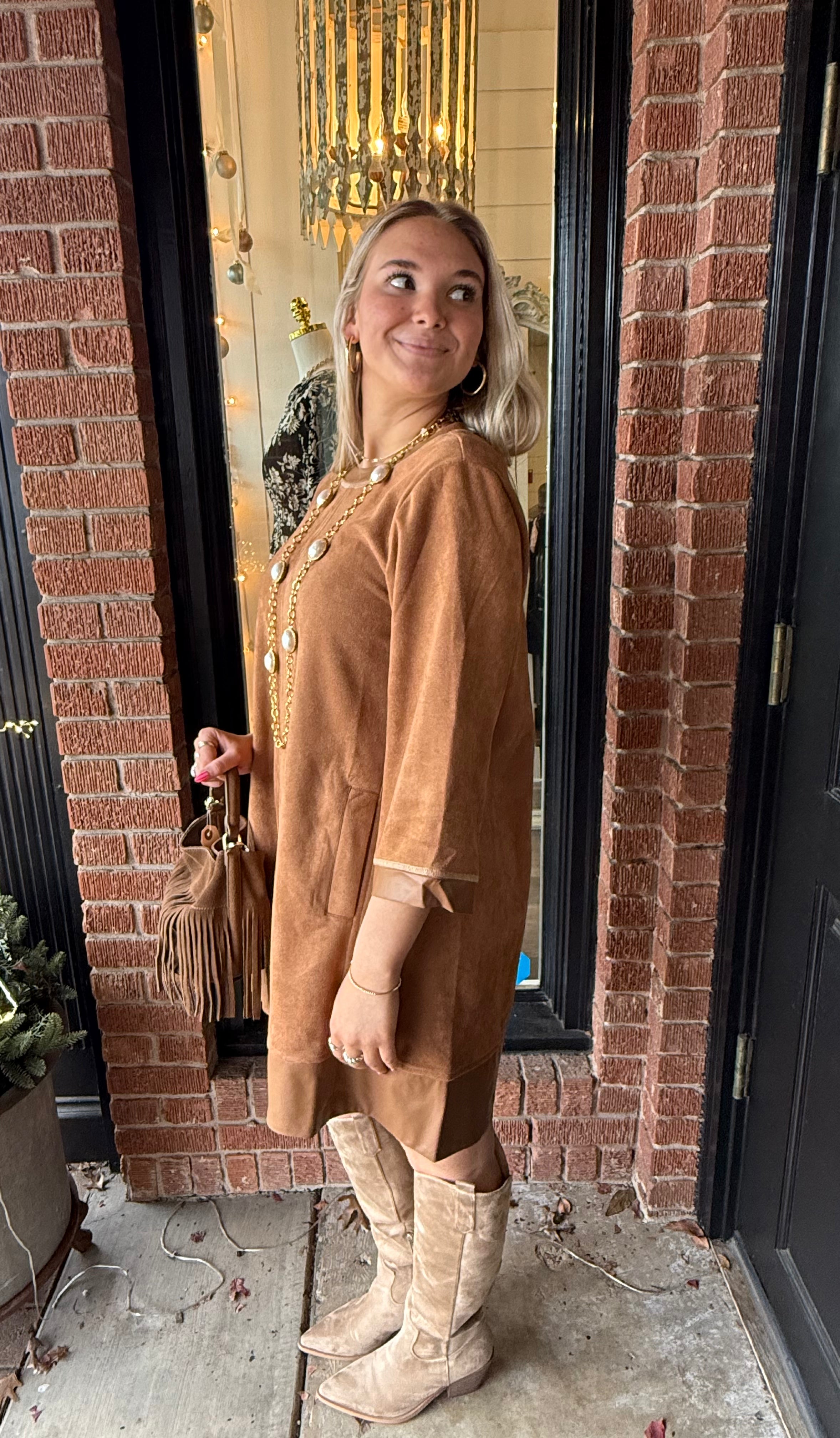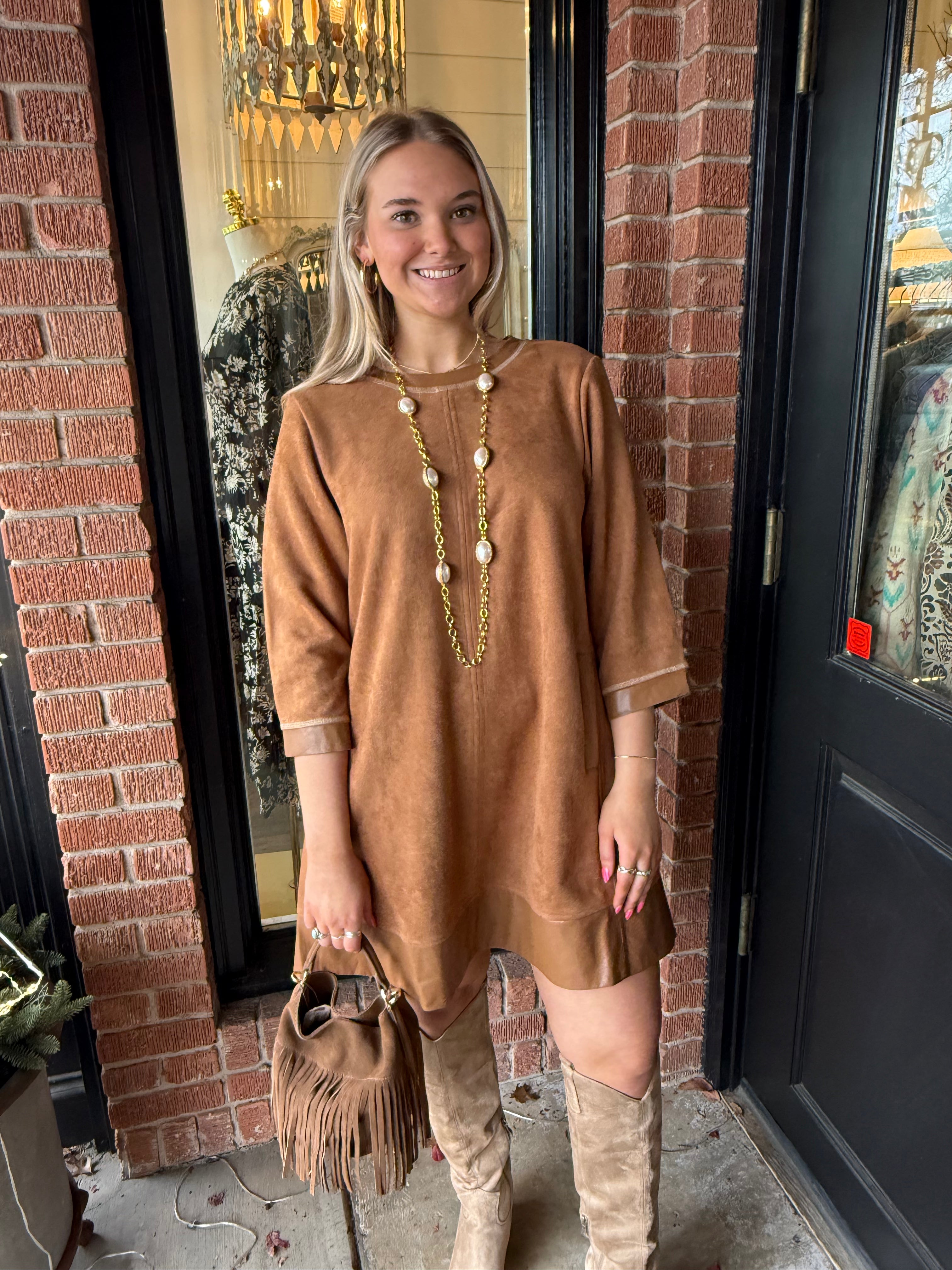 The Hazel Dress is a chic statement piece with rich texture and modern edge. Crafted in a soft suede-like fabric, this mini dress is finished with sleek leather detailing that adds just the right amount of contrast. Easy to style with boots or heels, it’s perfect for dinners, parties, and fall-to-winter events when you want something polished but fun.