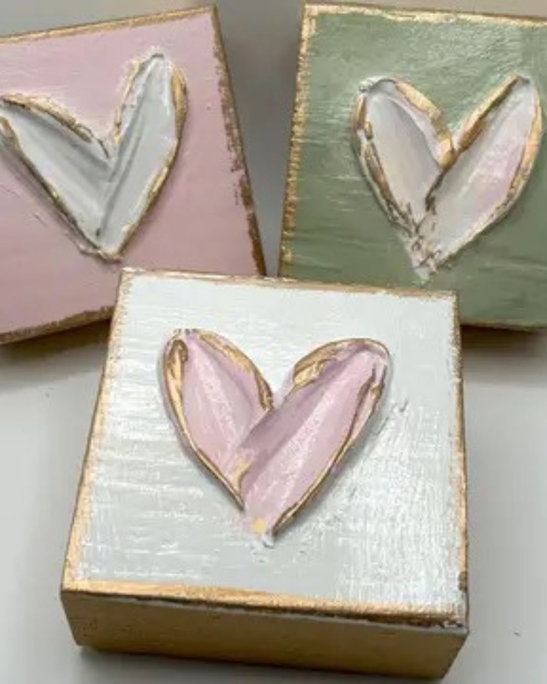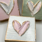 These adorable hand-painted and textured blocks make the sweetest happies, especially for Valentine's Day. Each thick wood block measures 3x3 inches. Designs are in muted colors with rich gold accents. Artist signature and company name are included on the back. Because each design is individually drawn, painted, and textured, each block is unique and will vary slightly.