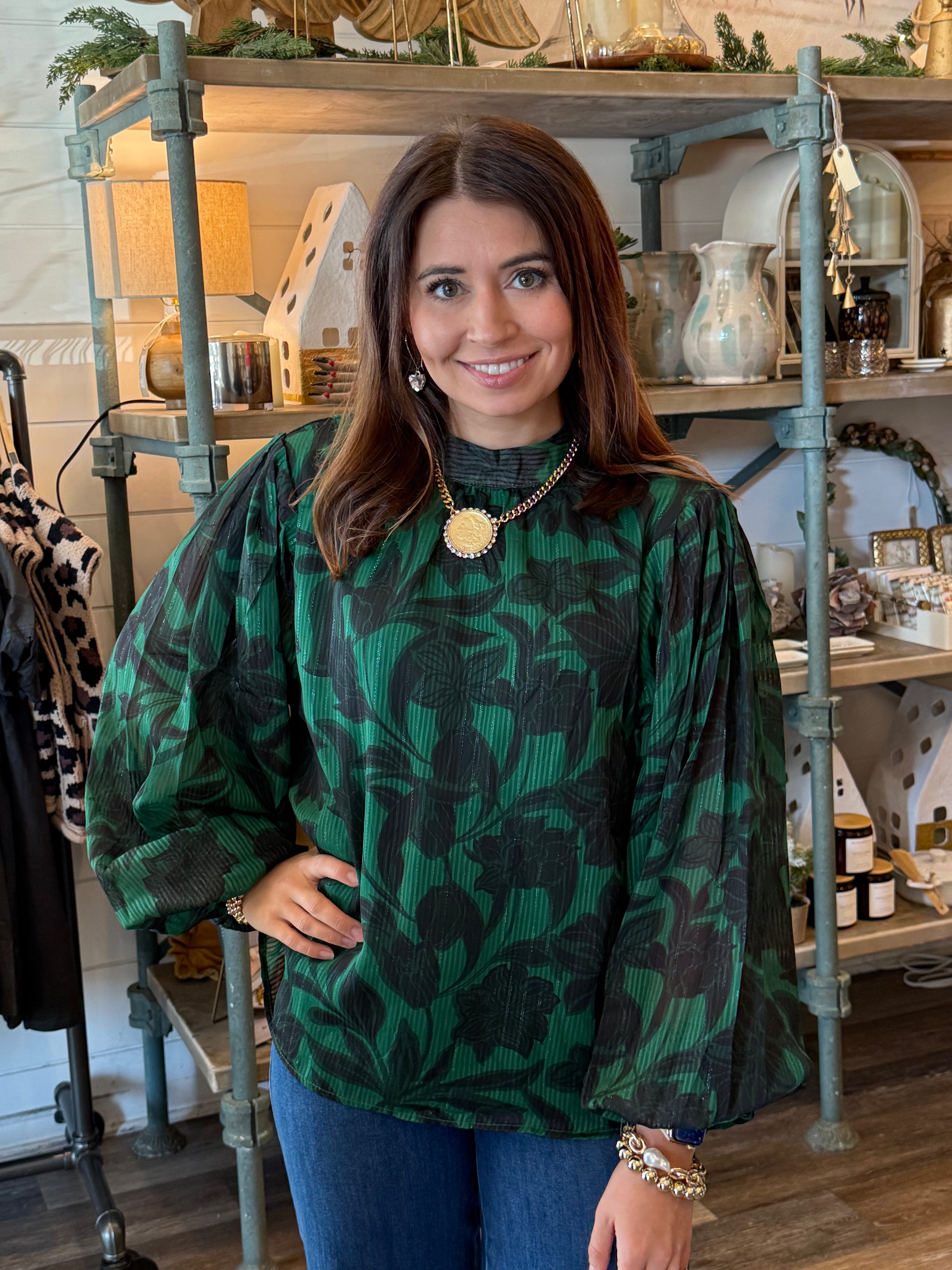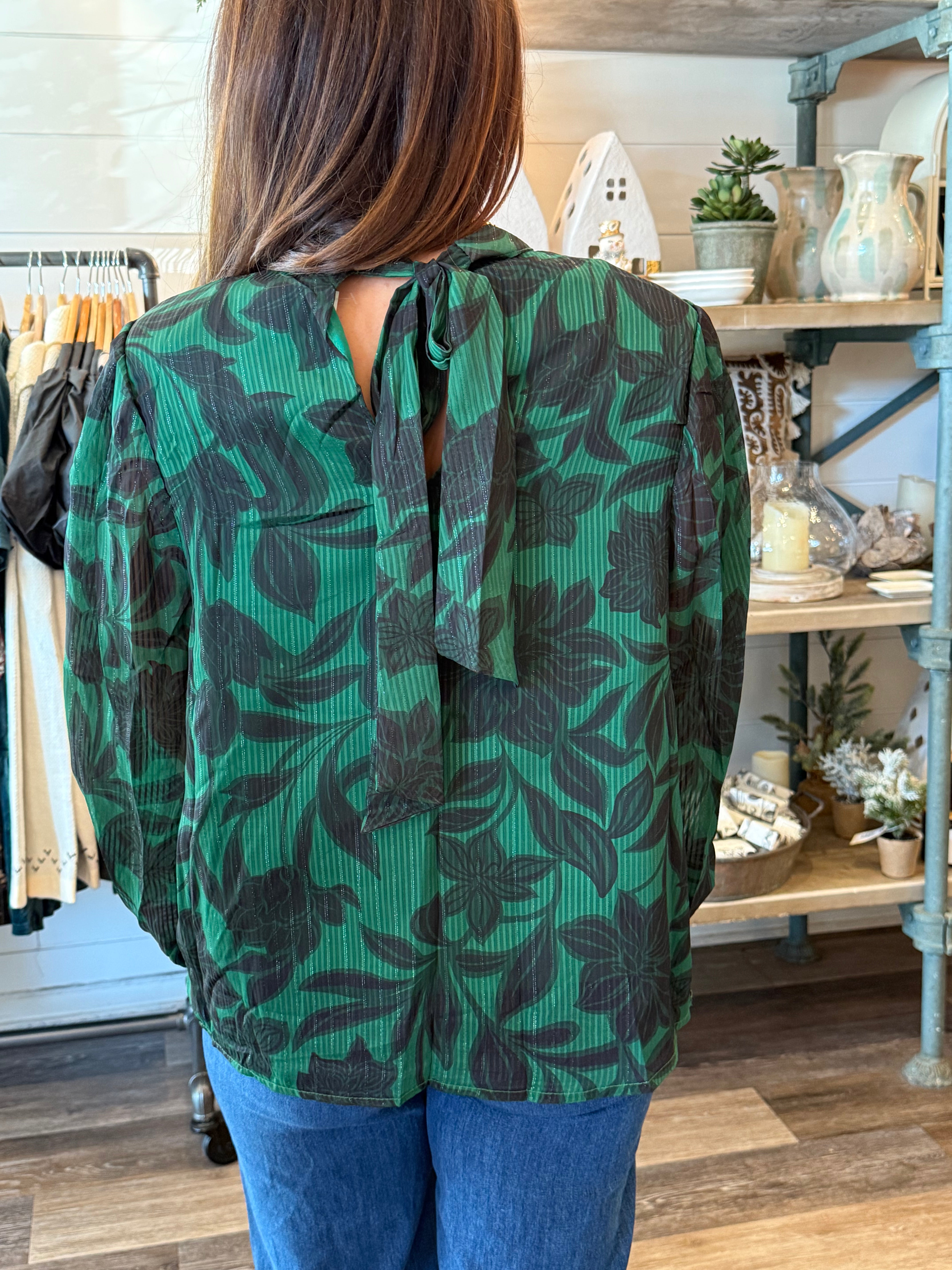 A beautiful green floral blouse with the perfect mix of feminine detail and timeless style. Featuring a high neckline with a back tie closure and long blouson sleeves for an effortlessly elegant look. The lightweight woven fabric is fully lined for comfort and coverage — perfect for dressing up denim or pairing with skirts this season.
