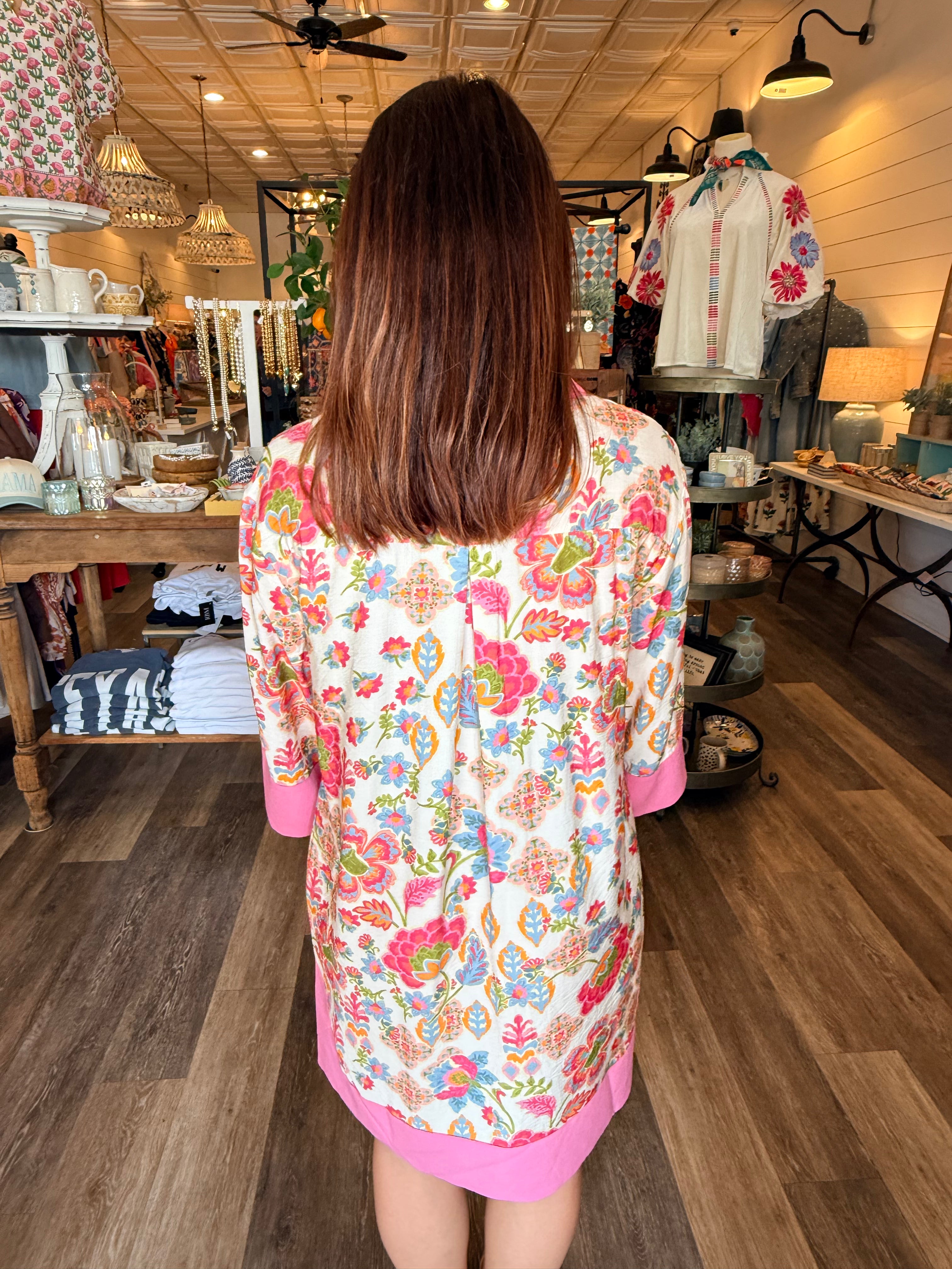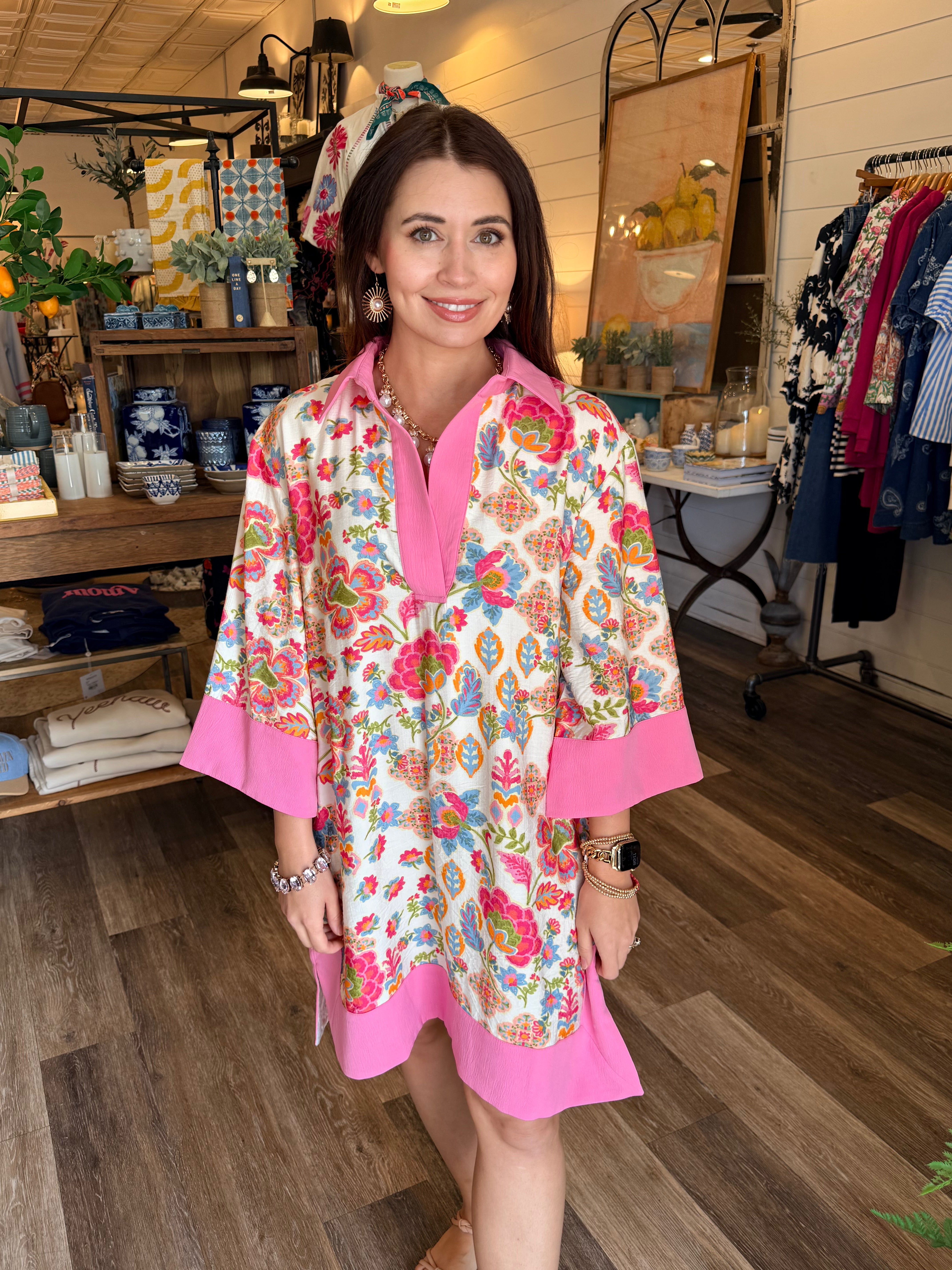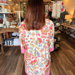 Pretty, easy, and endlessly wearable — the Jena Pink Floral Shirt Dress is a go-to for effortless style. Designed with a soft pink floral print, flattering split neckline, and flowy 3/4 sleeves, this dress blends comfort with feminine charm. The split hem adds movement and a relaxed feel, while the lightweight rayon blend keeps it breathable and comfortable all day long.