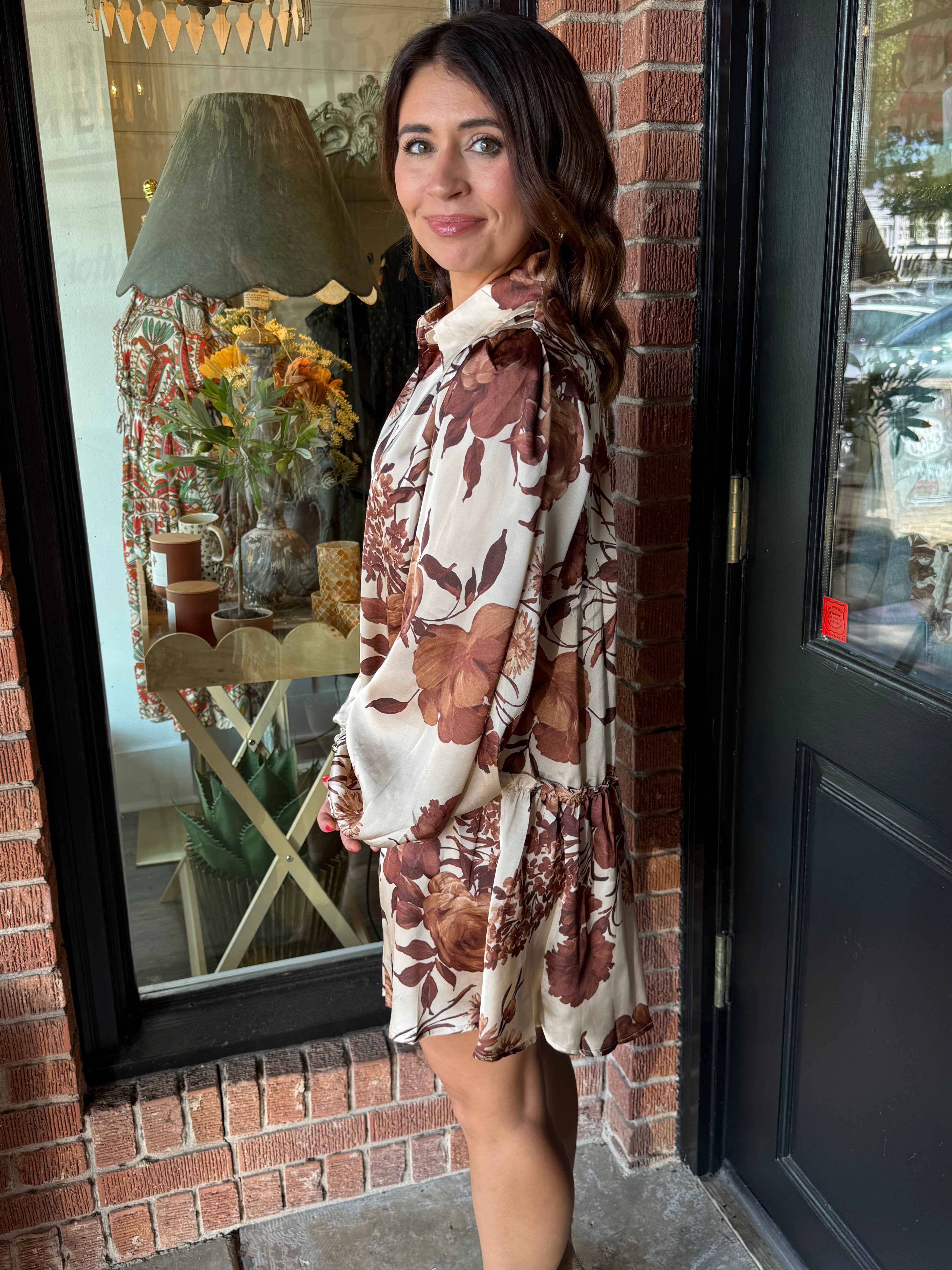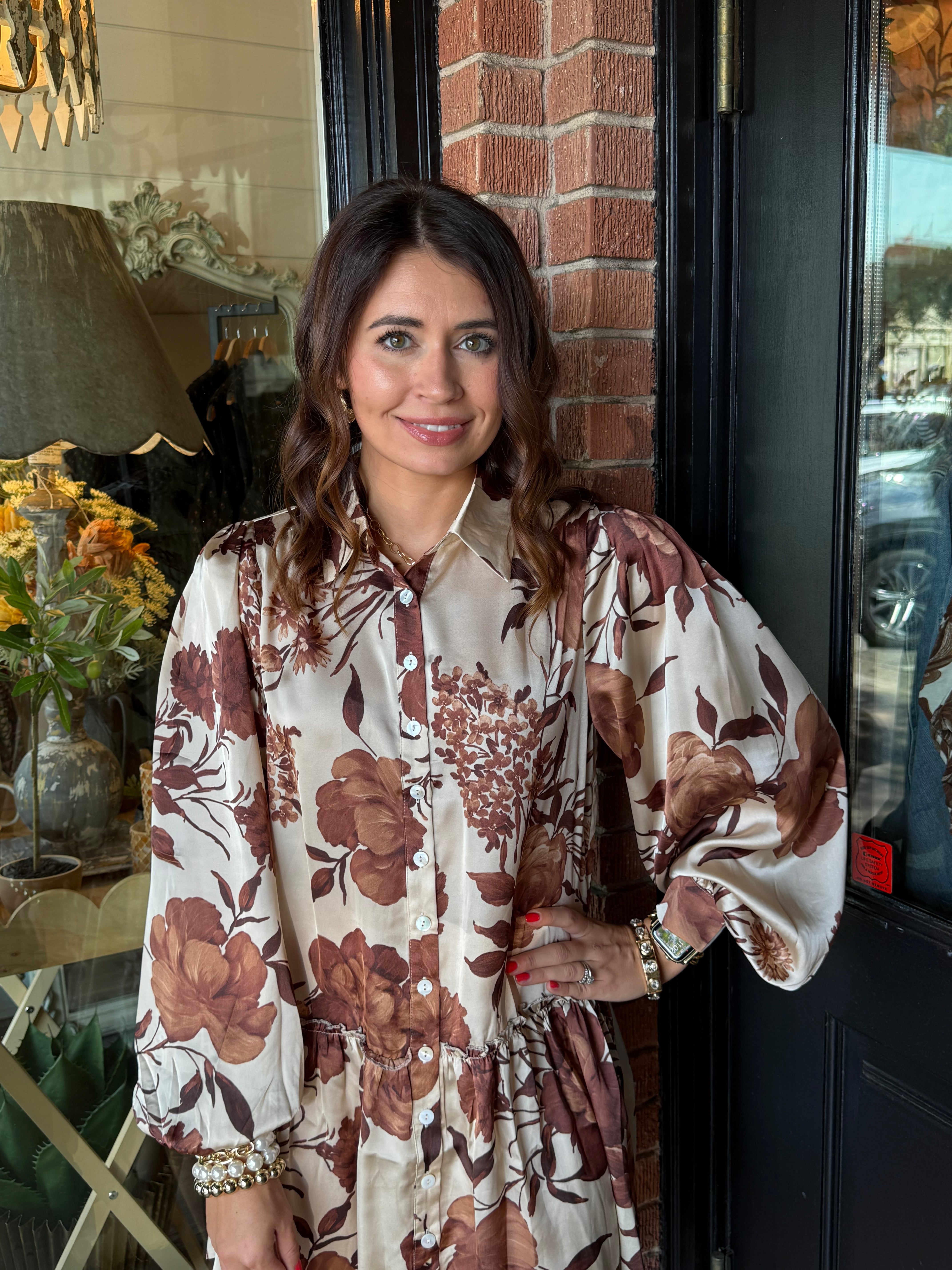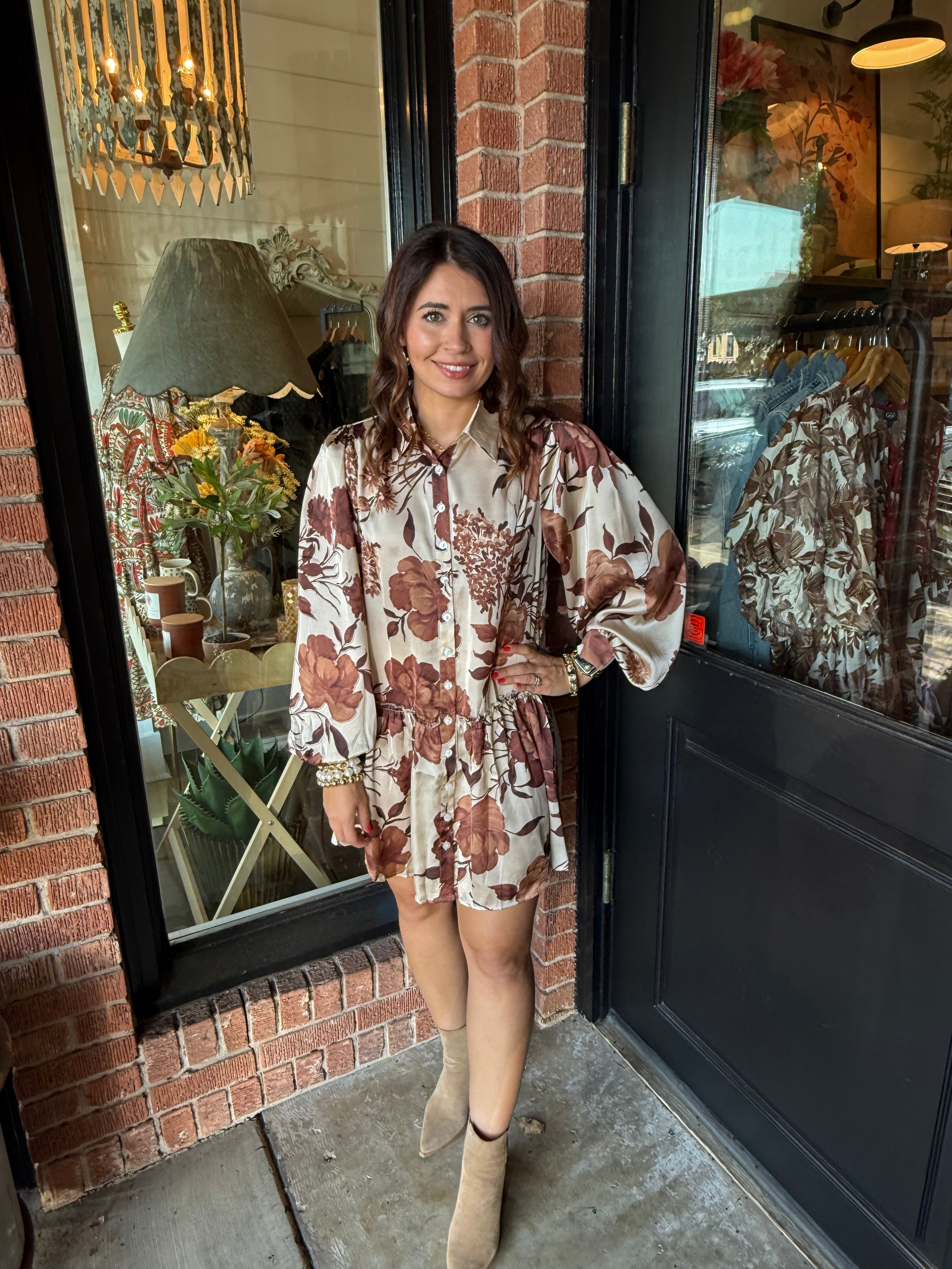 The Jennifer Brown Floral Dress is a flowy, feminine piece with classic charm. Designed with a full button-down front and collared neckline, this dress brings a polished yet effortless look. The long sleeves with buttoned wrists add a tailored finish, while the drop waist and airy silhouette create movement and ease. Crafted in lightweight polyester, it’s perfect for everything from workdays to weekend outings.
